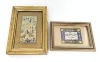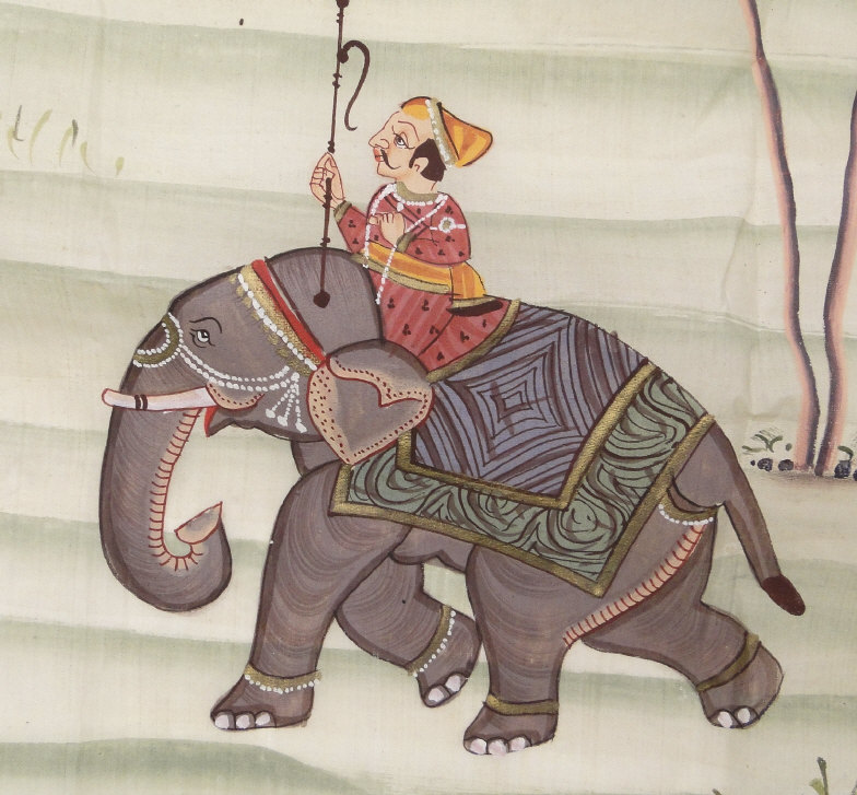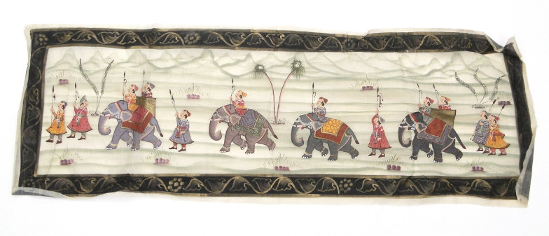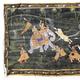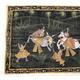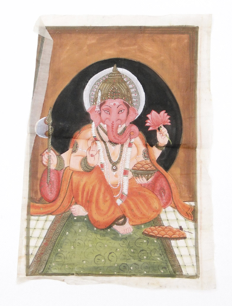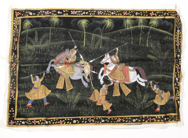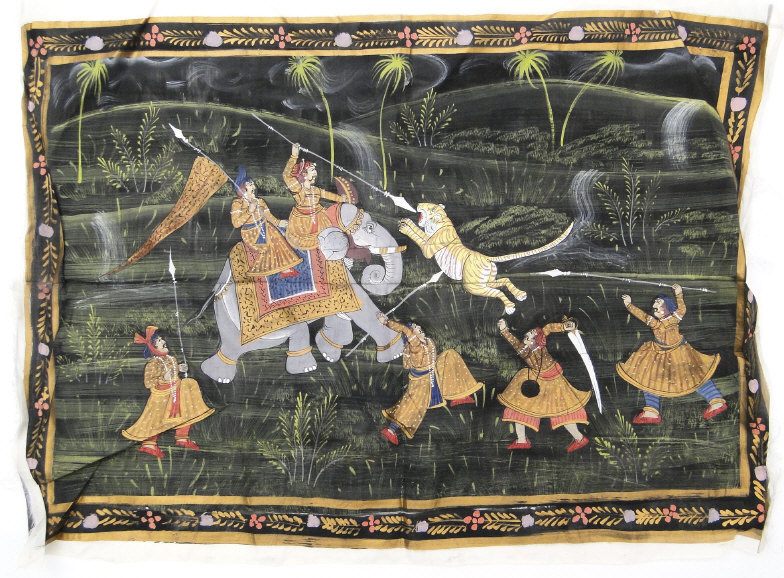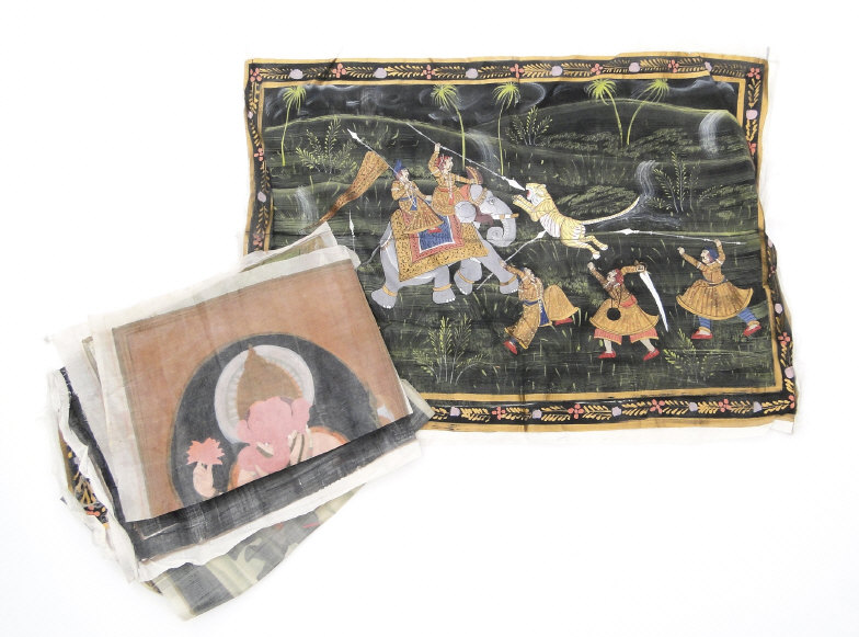 Four Indian paintings onto cloth depicting religious deities, hunting scenes, etc, the larger 50cm x 60cm