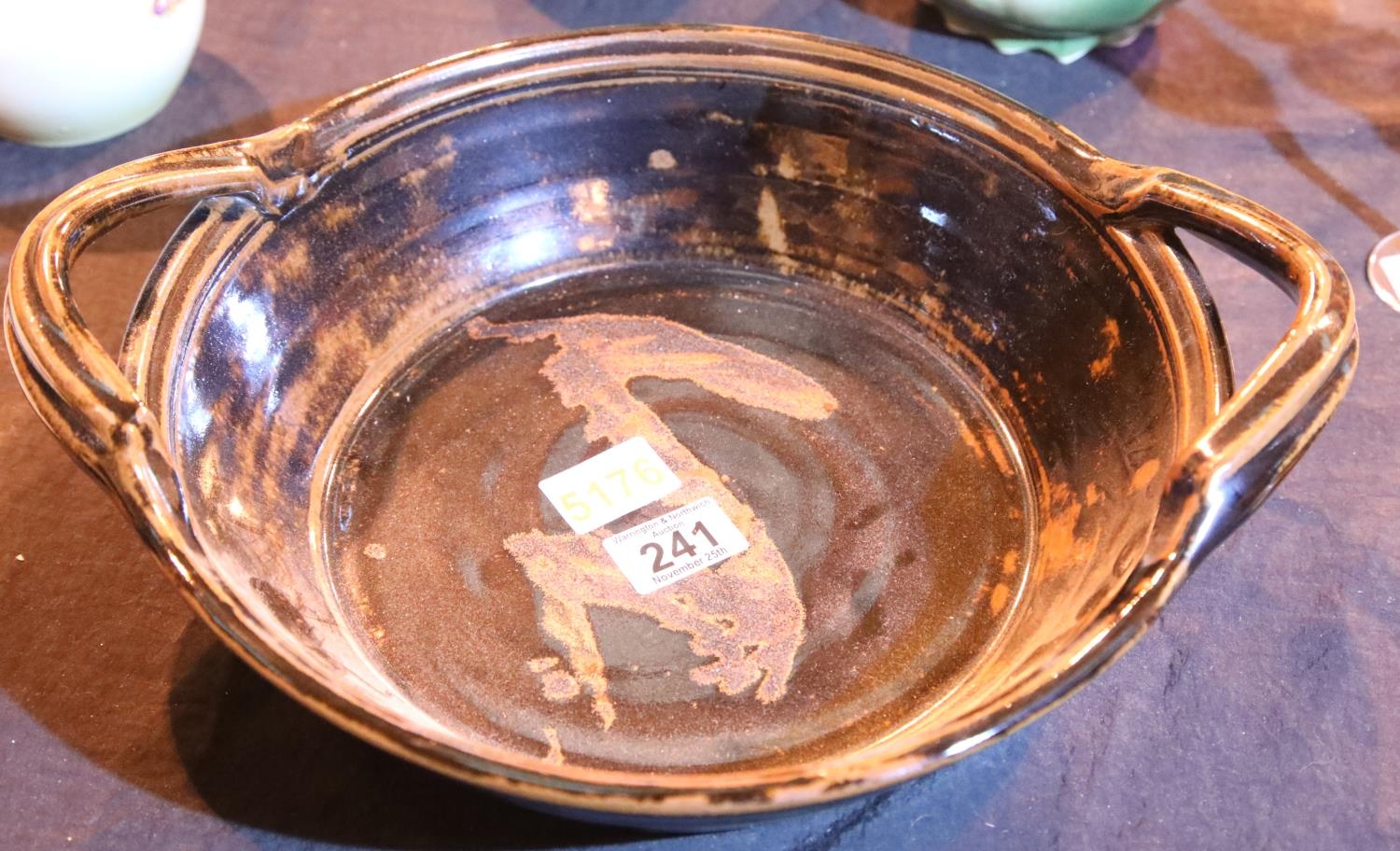 Large two handled slipware bowl. Not available for in-house P&P
