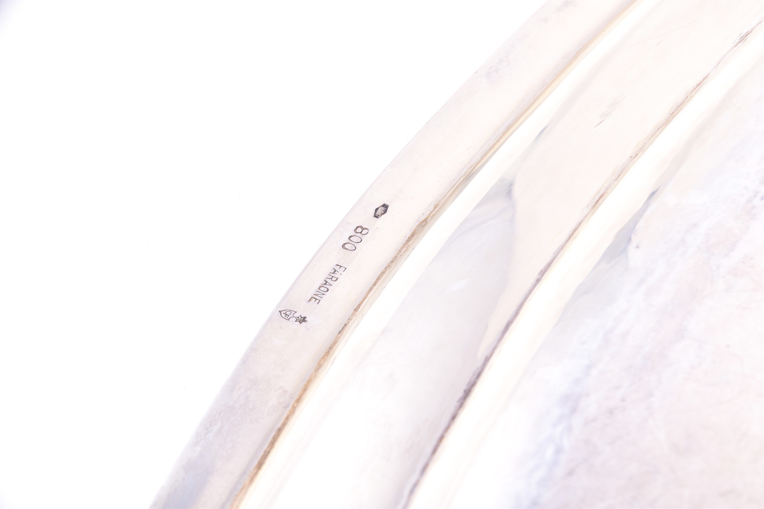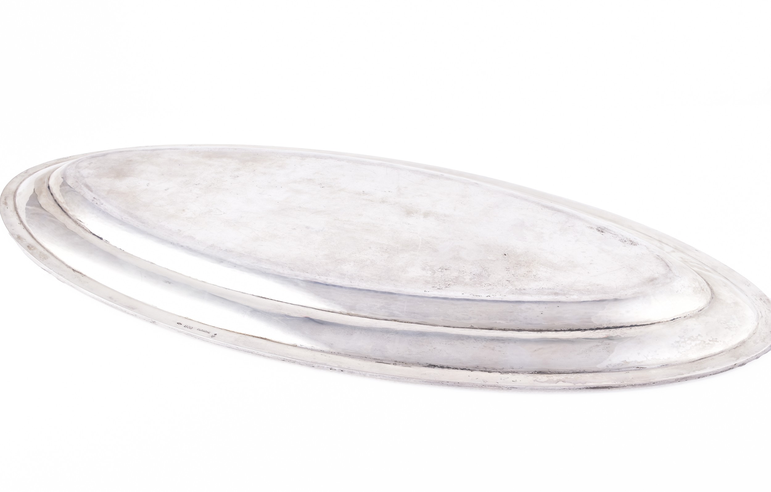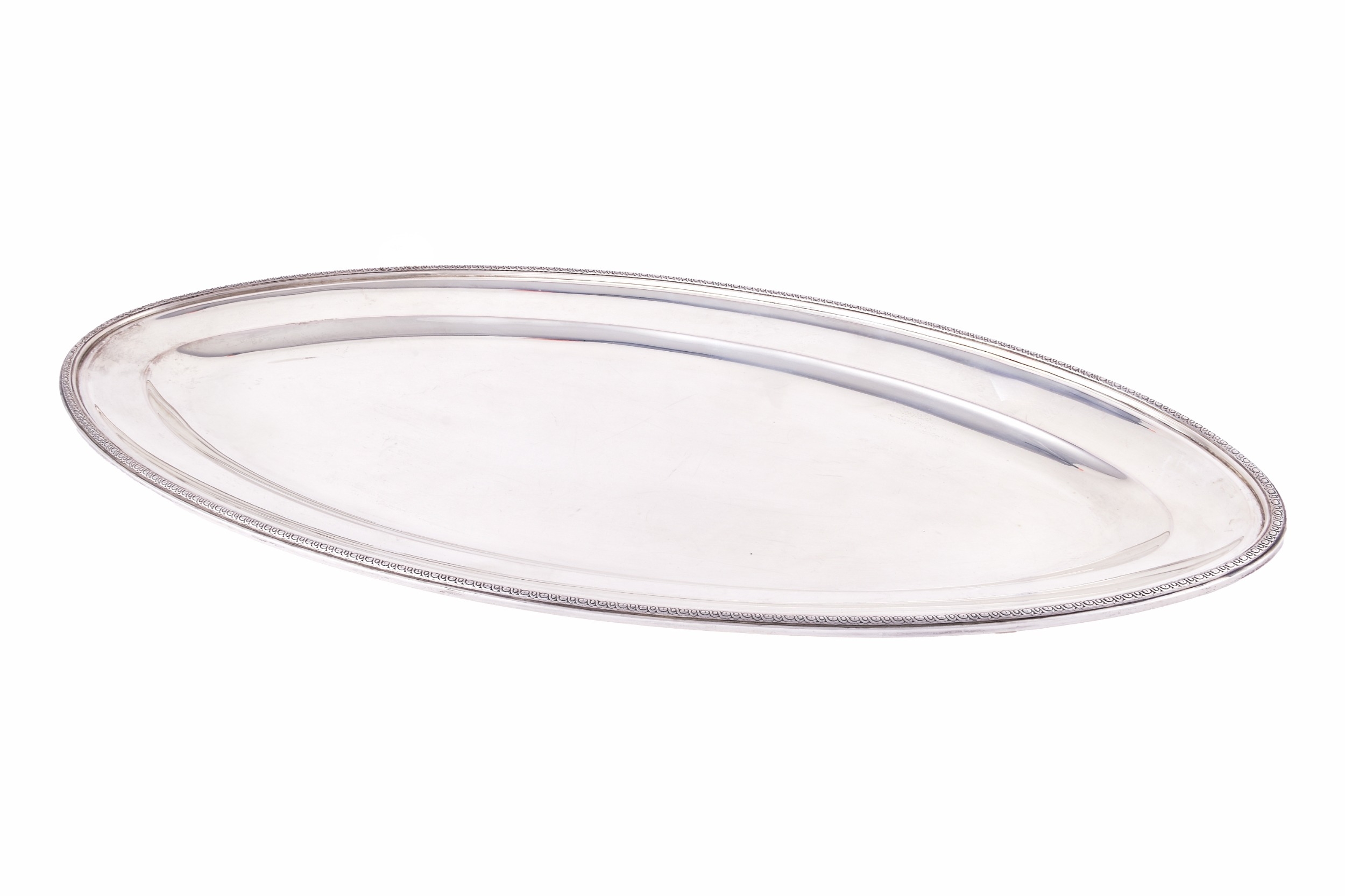 A continental 800 silver large elongated oval tray, with a plain polished surface, within a narrow border decorated with a continuous beaded edge, the corners rounded and the rim of shallow form, 60 x 29.5 cm, marked Faraone 800 to base.