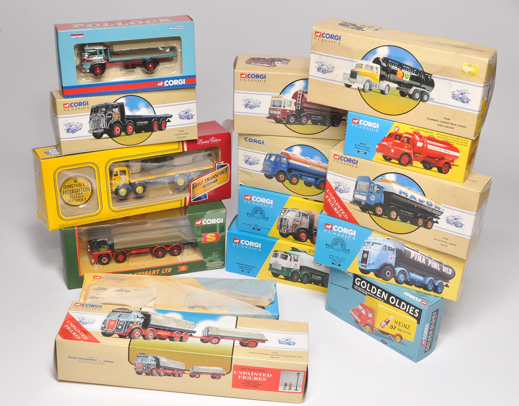 A group of 15 x diecast model vehicles to include trucks and commercial vehicles. Individual models comprise 1) Corgi Golden Oldies Thames Trader - Heinz, 2) Corgi Classics Power Petroleum Leyland Octopus Elliptical Tanker, 3) Corgi Blue Circle Cement Foden FG 8 Wheel Platform Lorry, 4) Corgi Classics AEC Cylindrical Tanker No. rth Eastern Gas Board, 5) Corgi Eddie Stobart Guy Invincible 8 Wheel Platform Lorry , plus others as shown. All appear mostly excellent in original boxes, from an ex-shop collection.