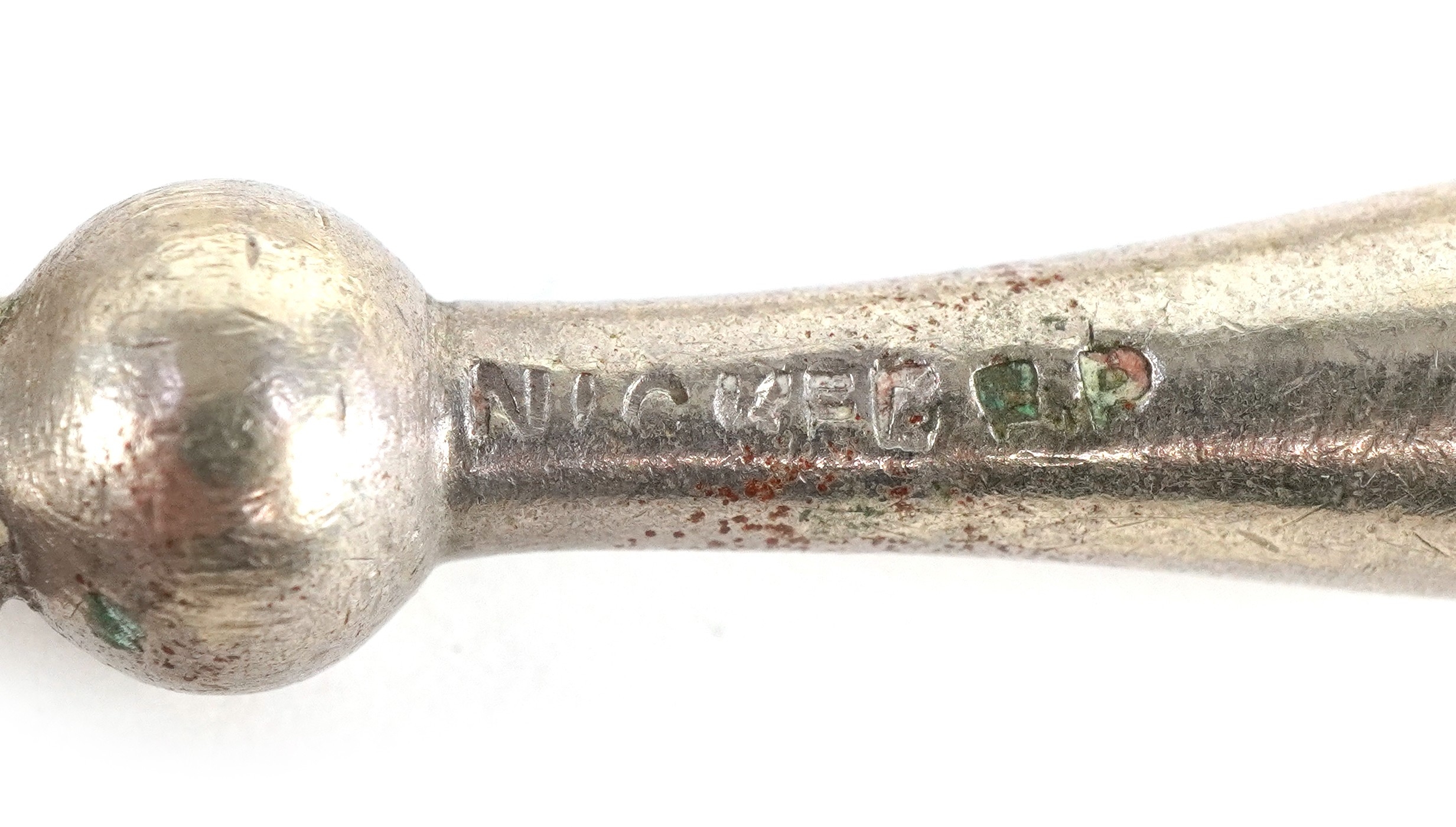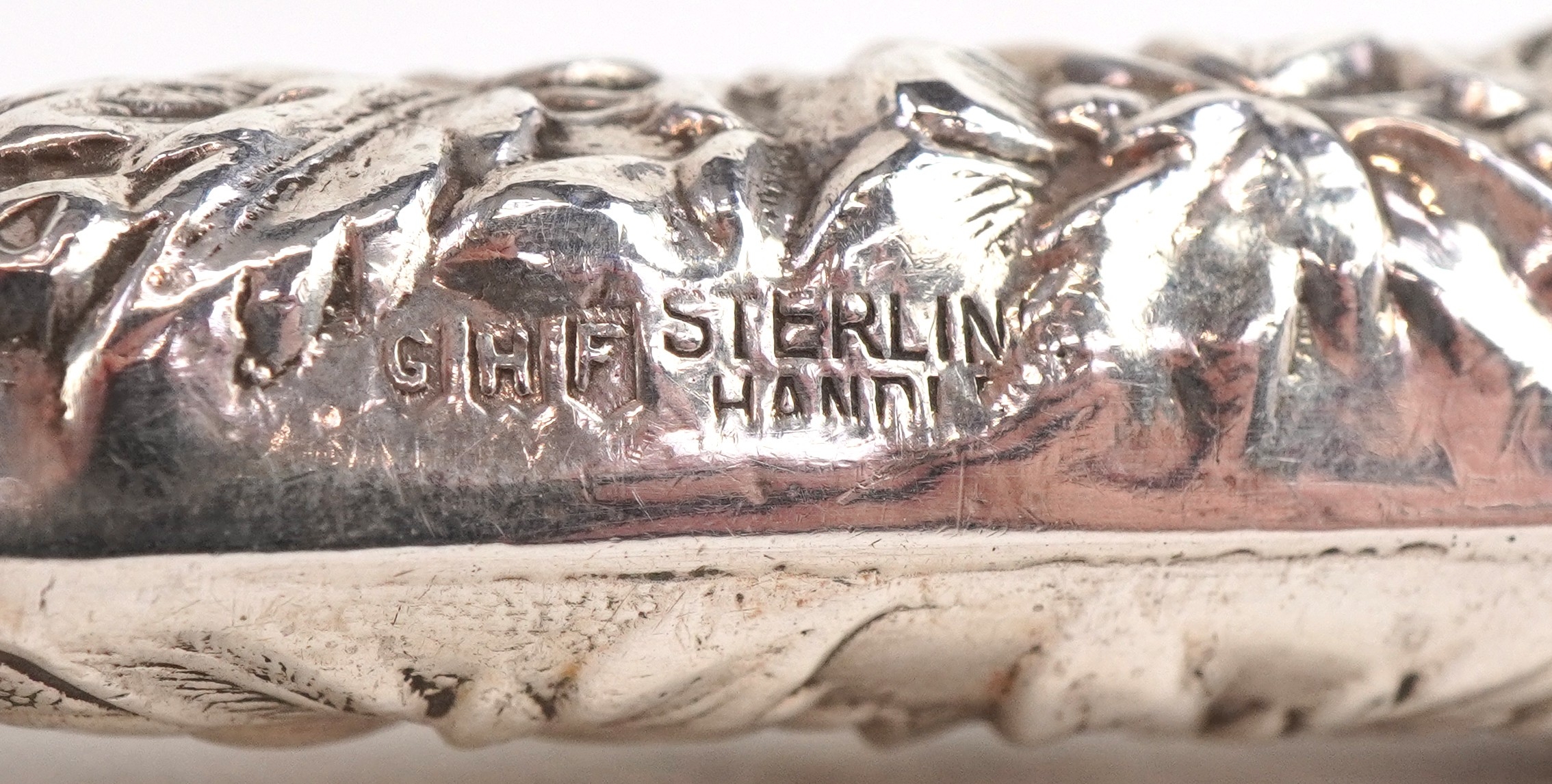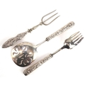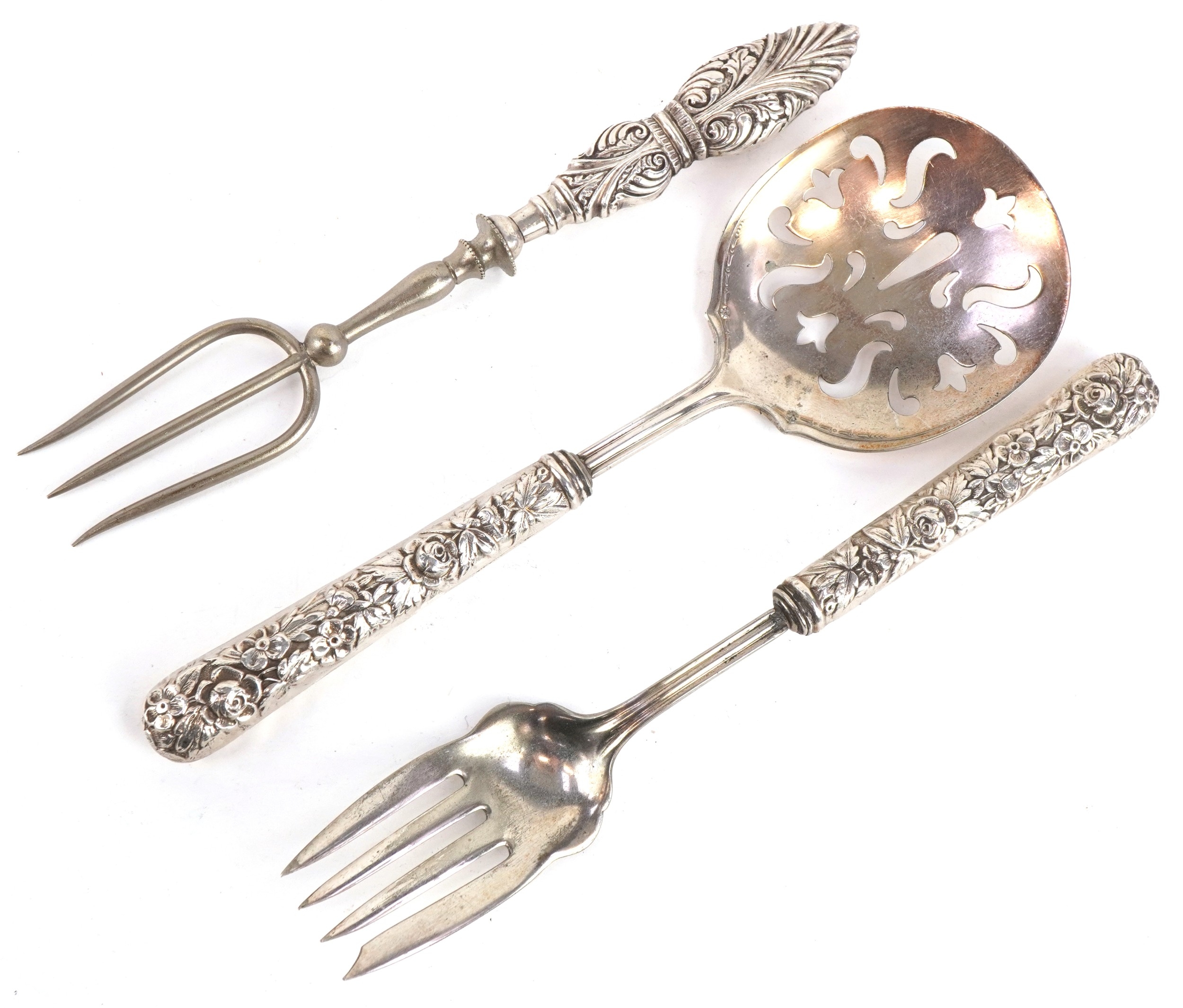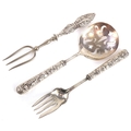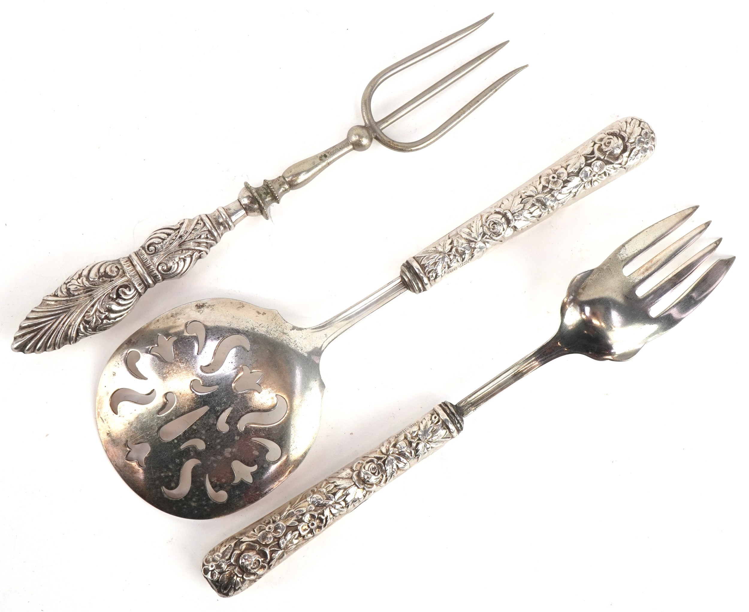 A pair of GHF sterling silver handled salad servers together with a Crisford & Norris silver handled bread fork, Birmingham 1924, the largest 23cm in length, total 208g.
