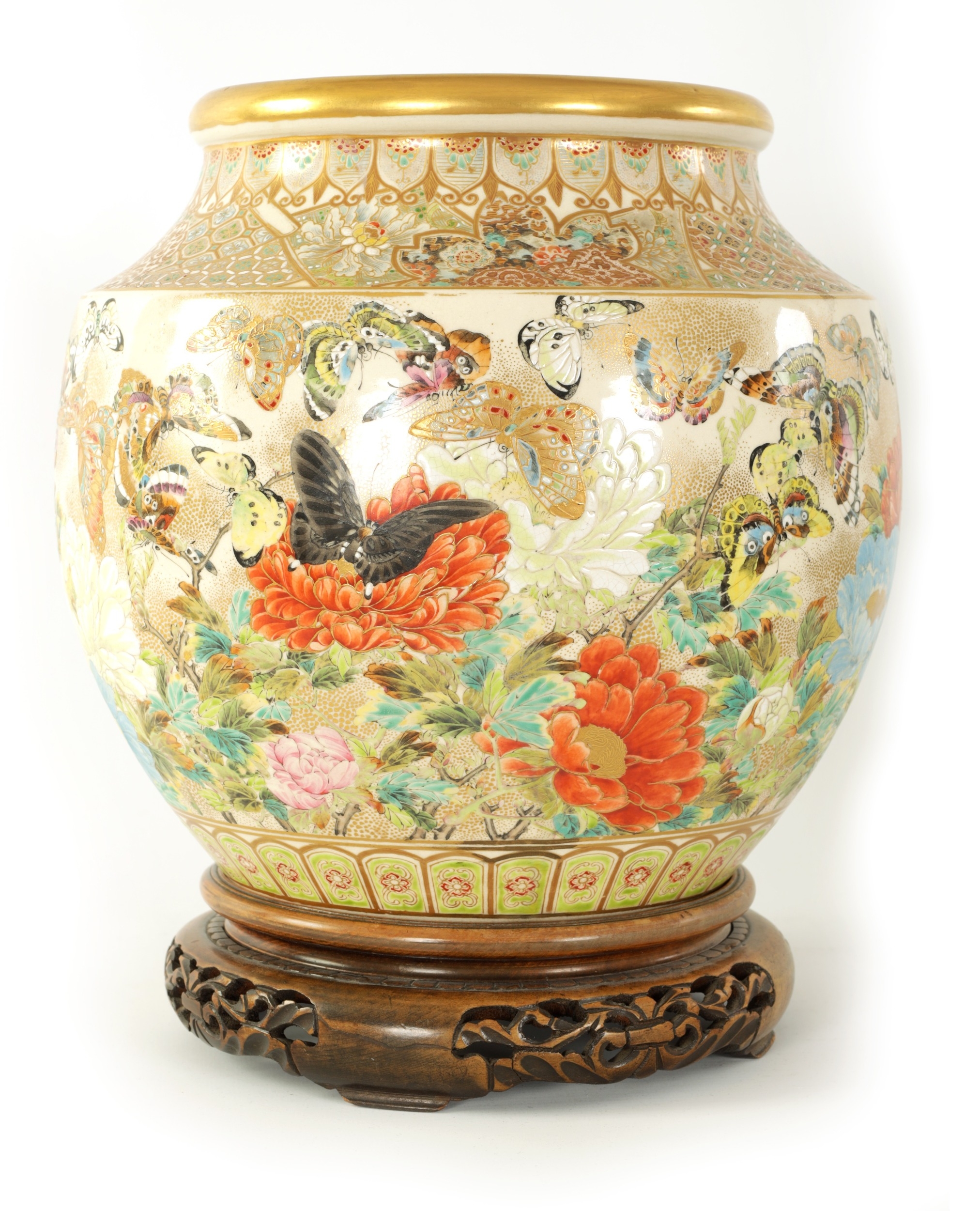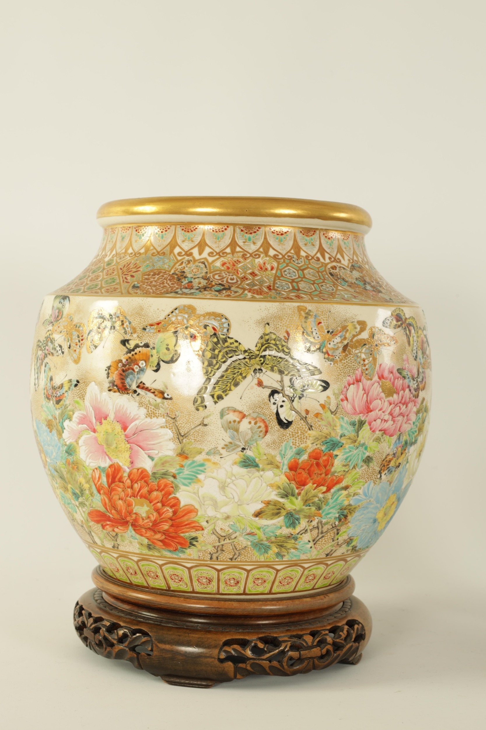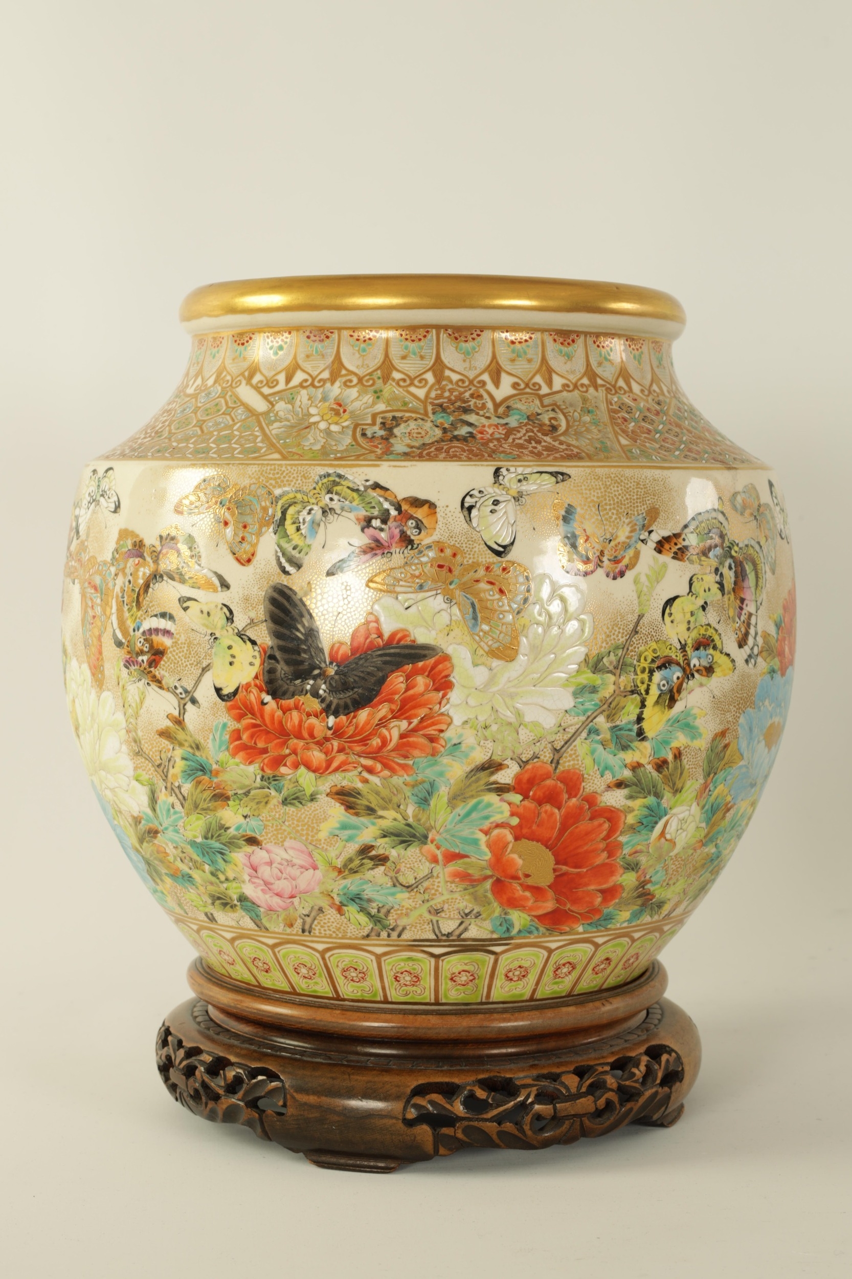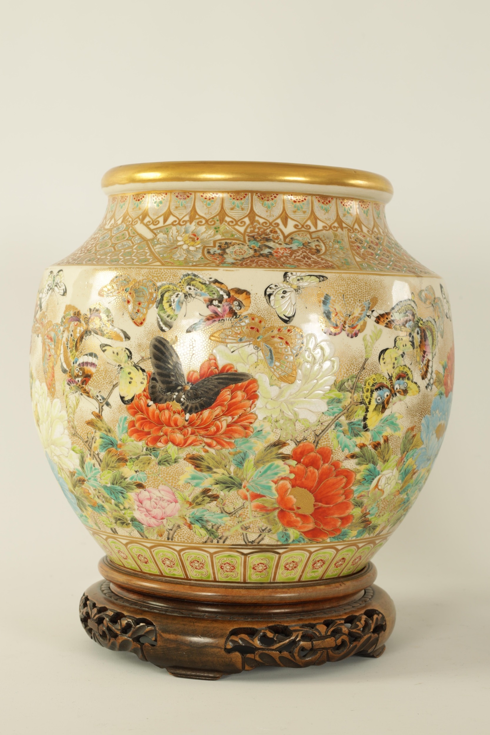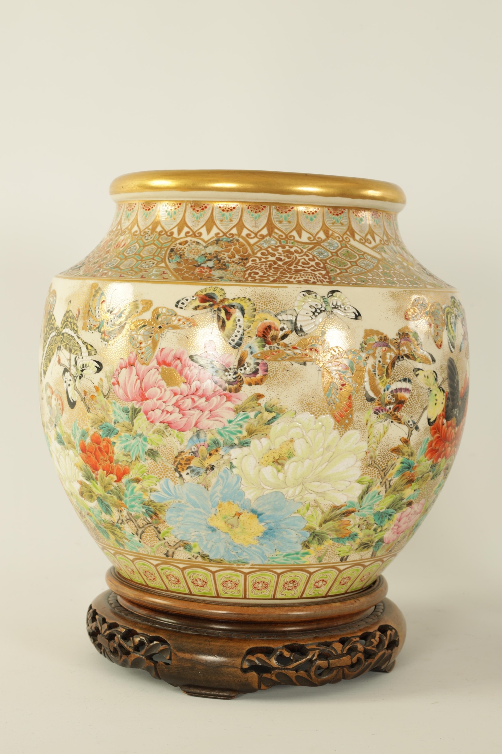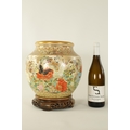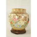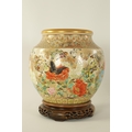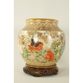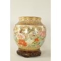 A FINE JAPANESE MEIJI PERIOD SATSUMA VASE of bulbous form decorated with a continuous floral and butterfly body painted in vibrant enamel colours - signed beneath and on a hardwood stand. (the vase 25cm high 26cm diameter)
