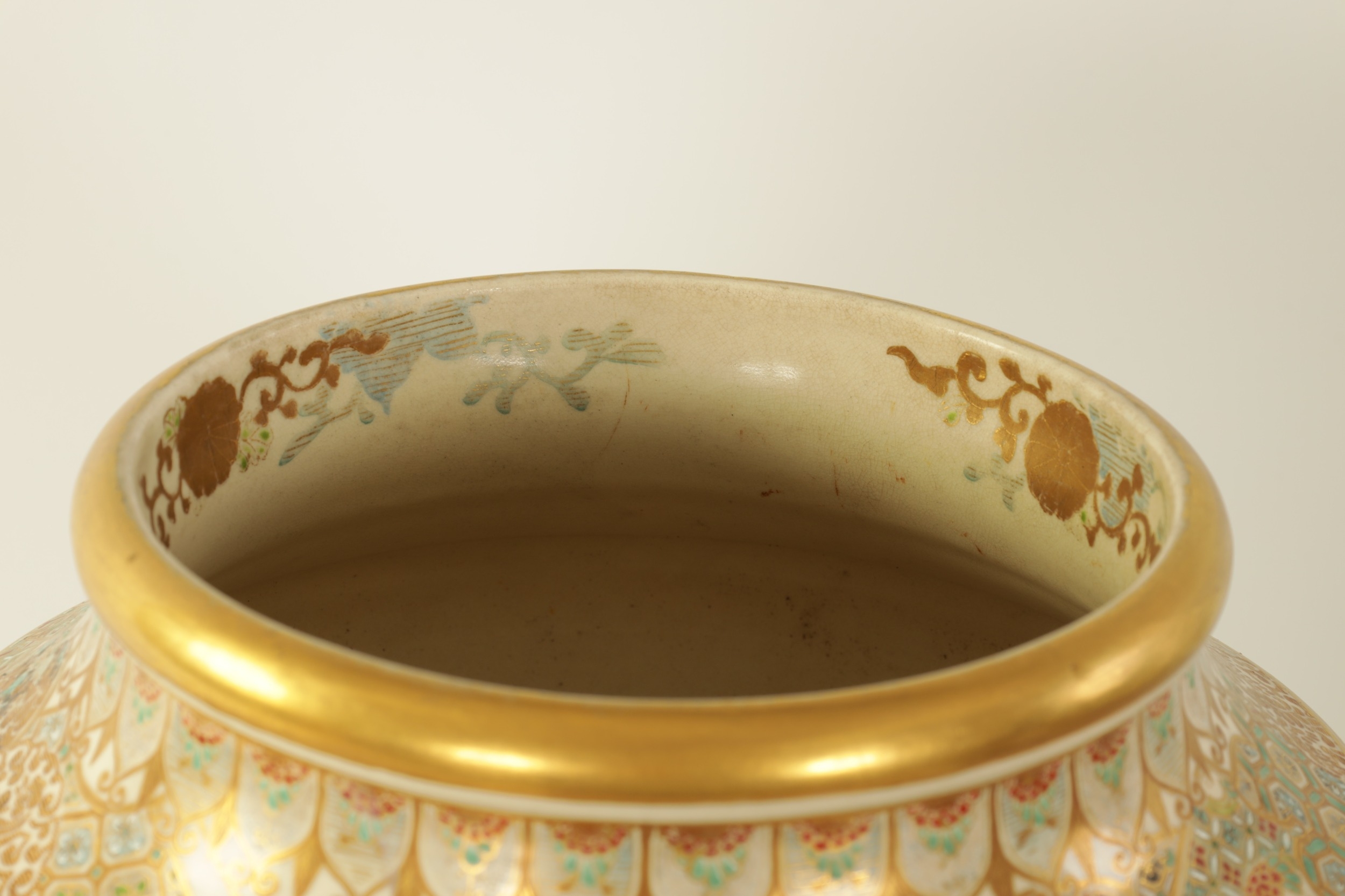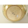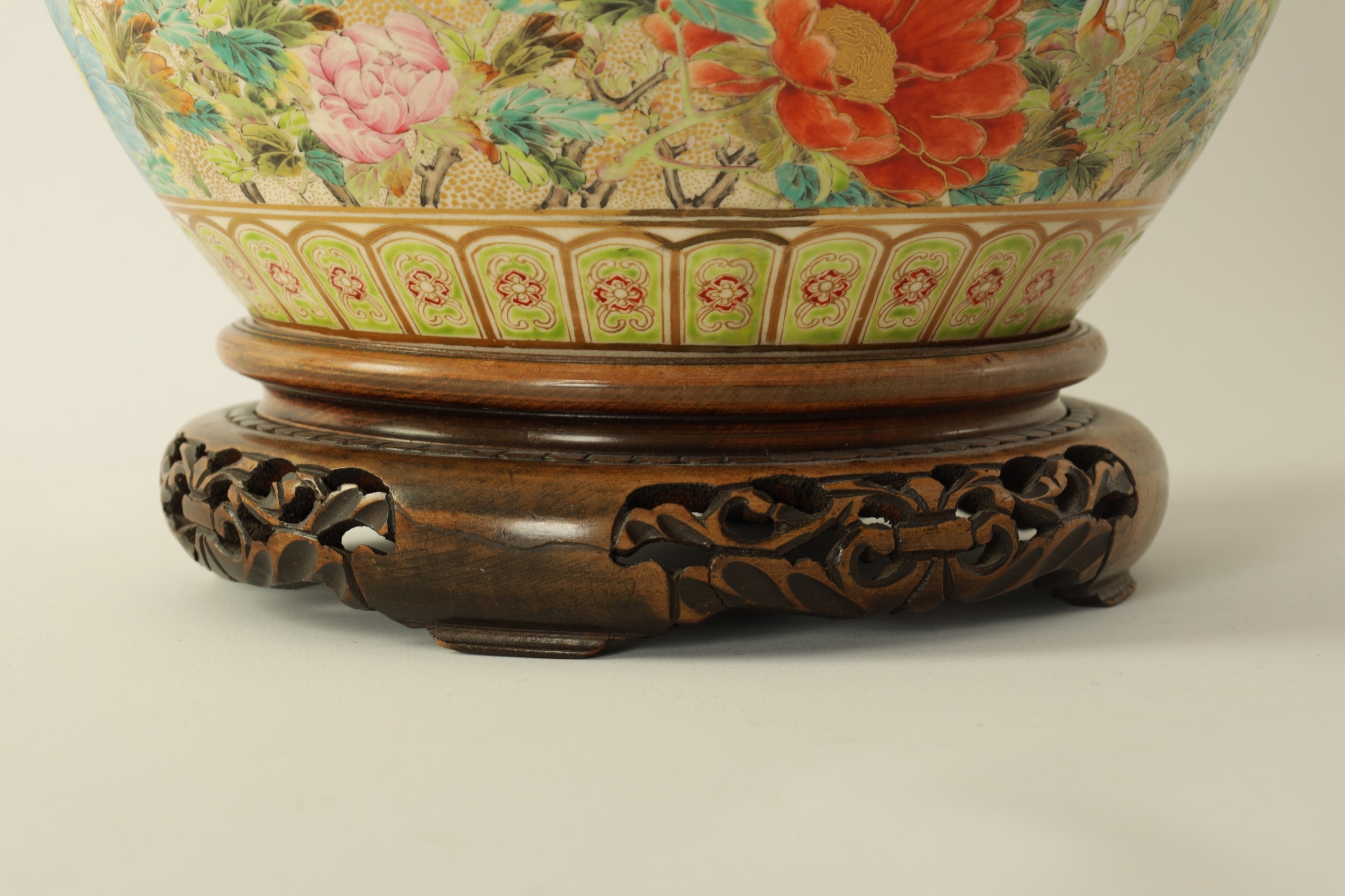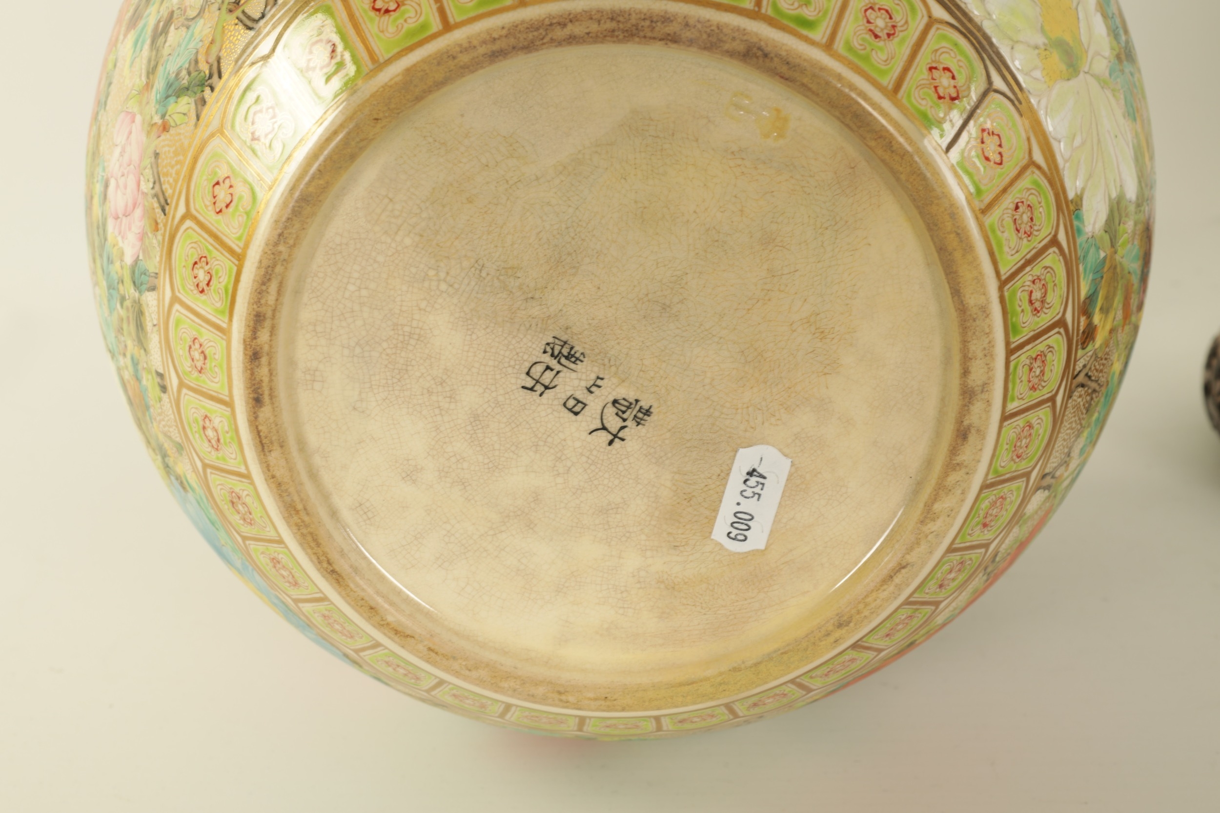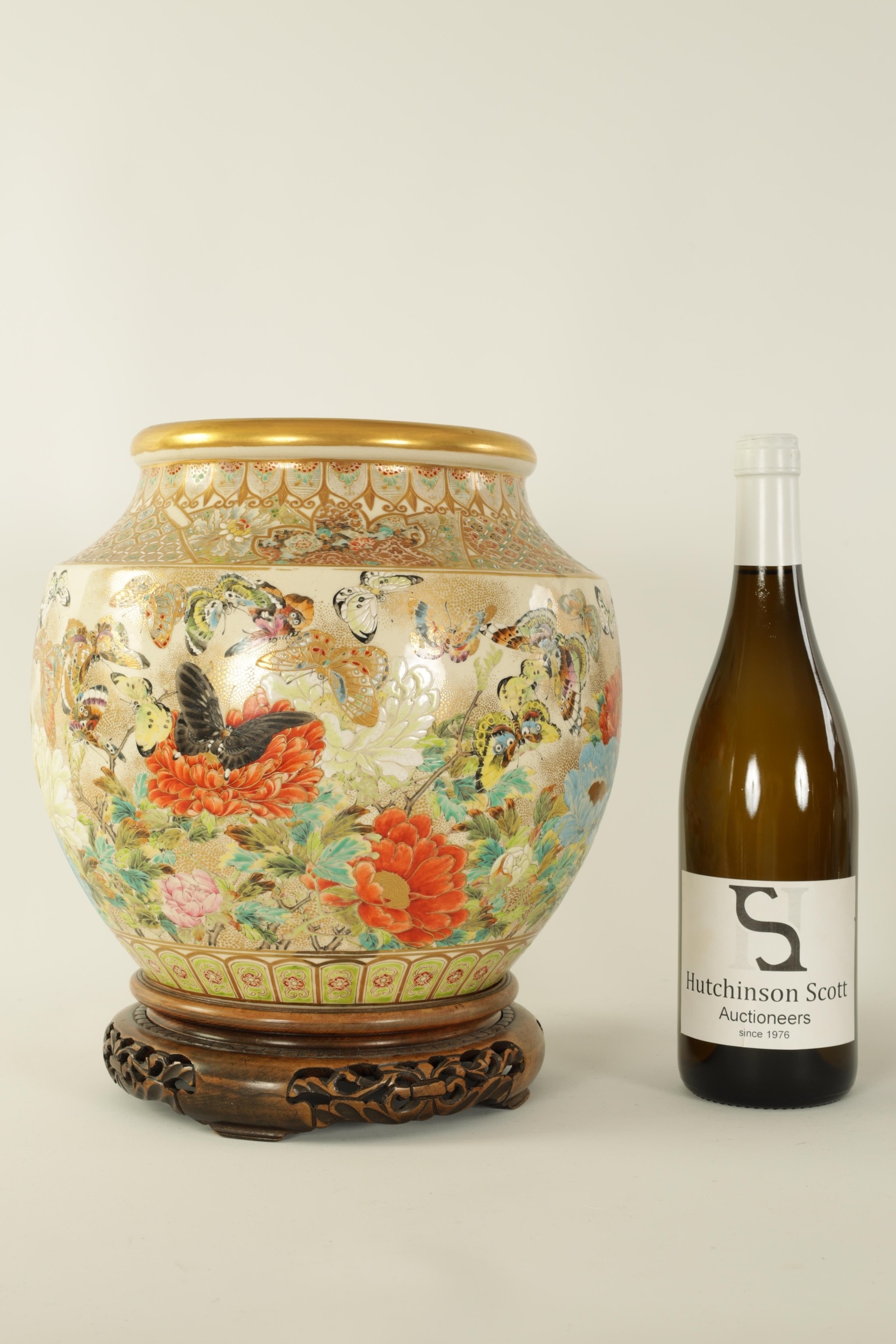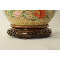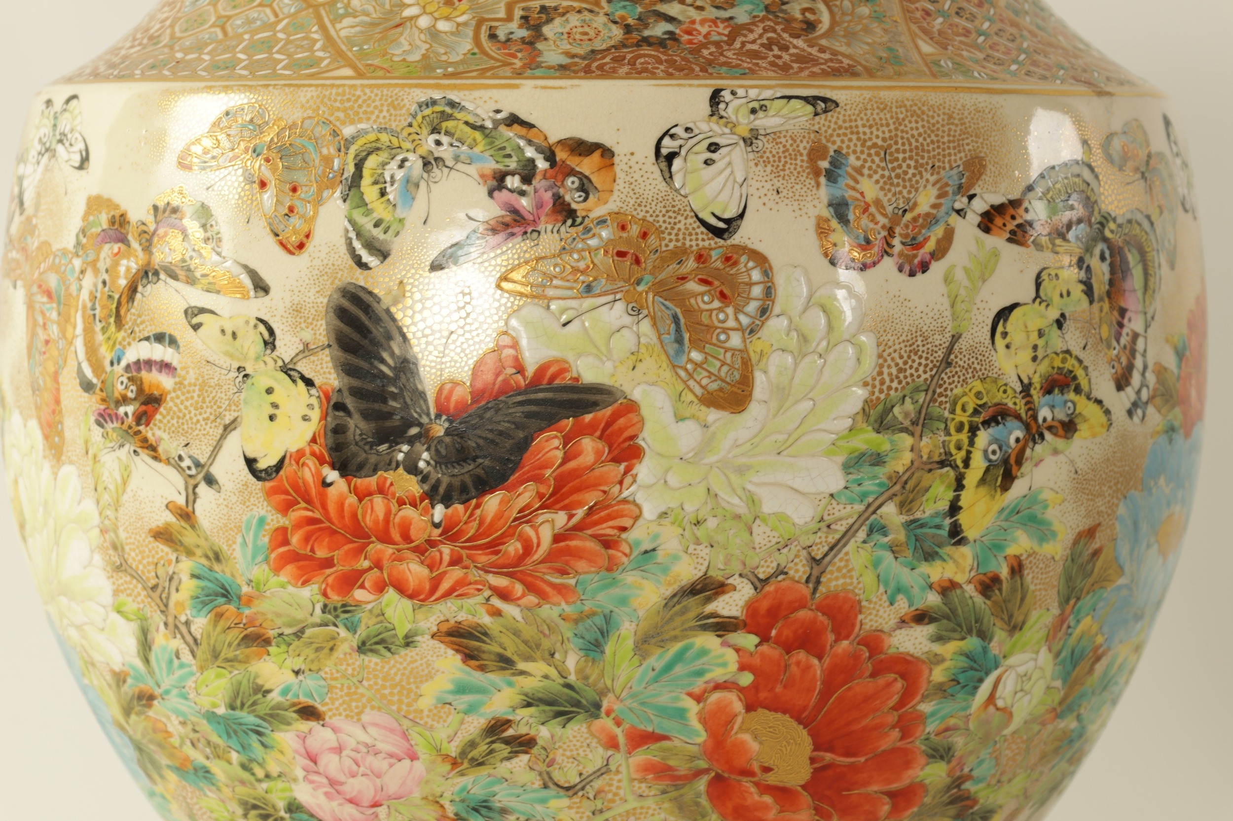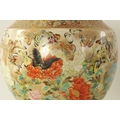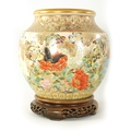A FINE JAPANESE MEIJI PERIOD SATSUMA VASE of bulbous form decorated with a continuous floral and butterfly body painted in vibrant enamel colours - signed beneath and on a hardwood stand. (the vase 25cm high 26cm diameter)