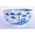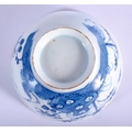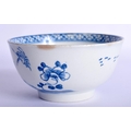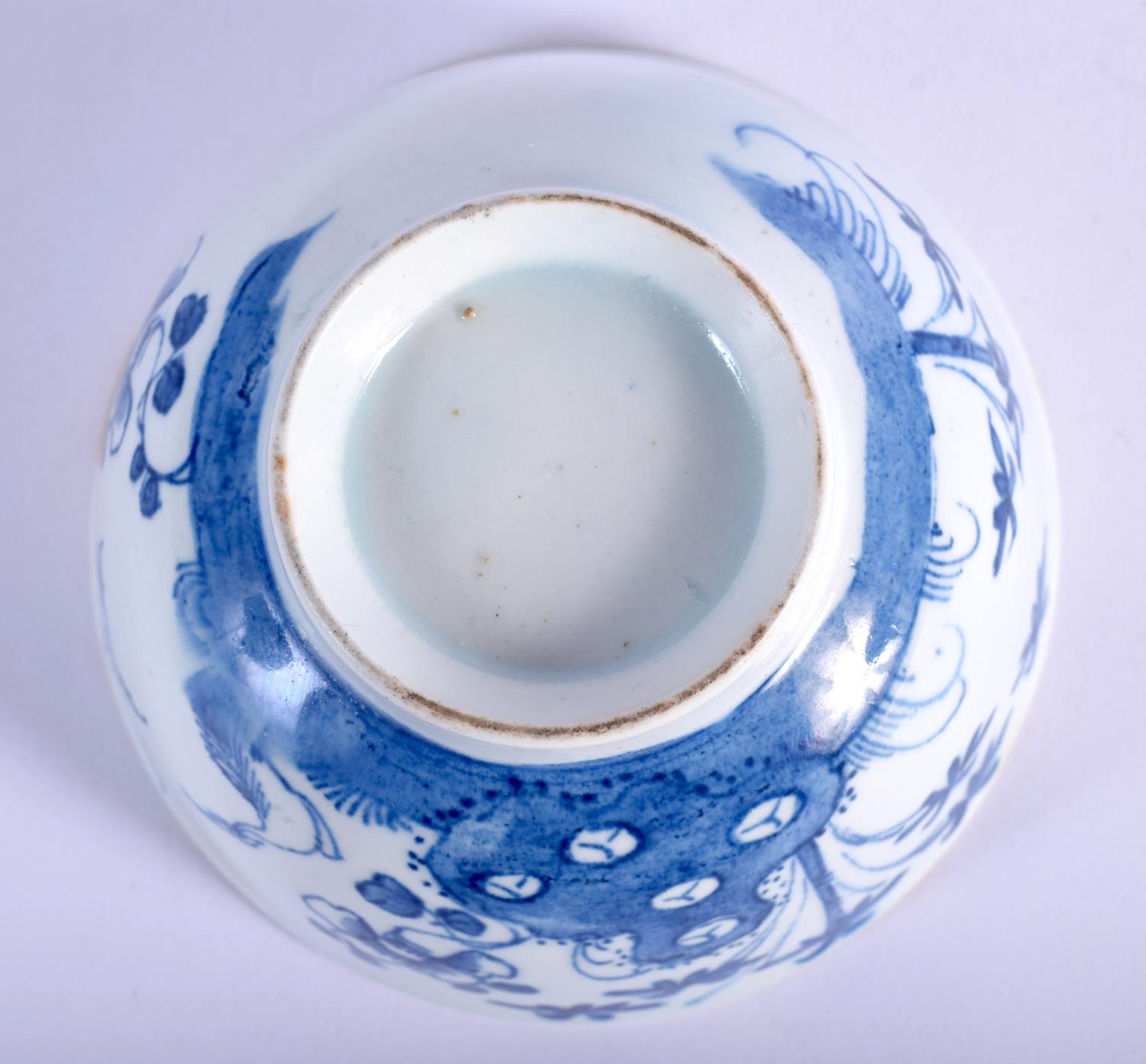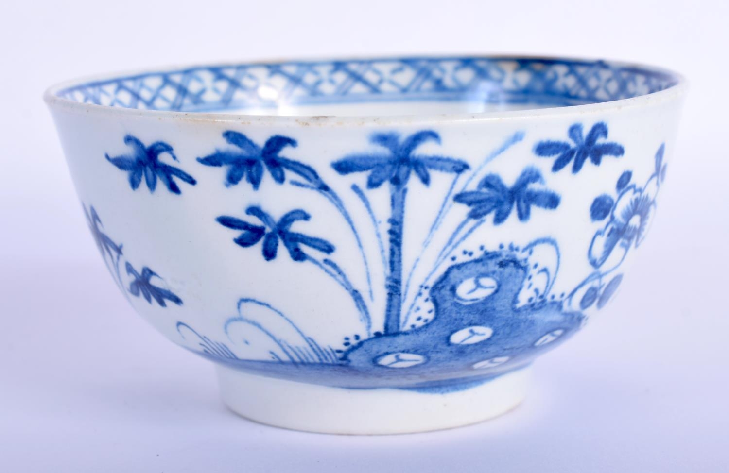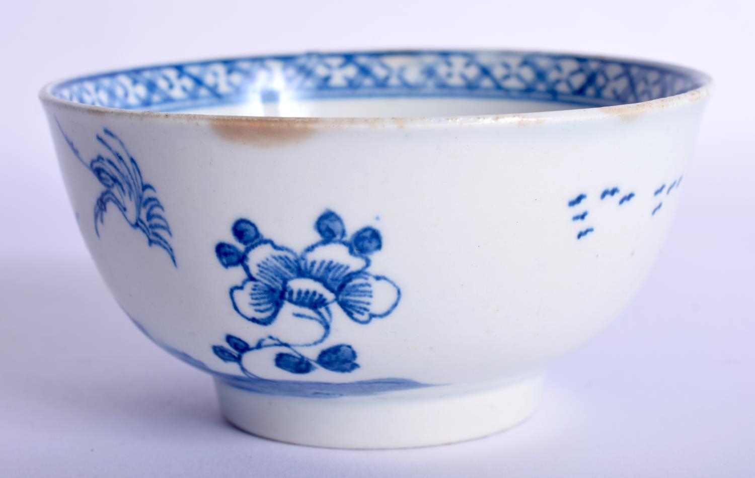 A GOOD 18TH CENTURY ENGLISH BLUE AND WHITE PORCELAIN TEABOWL probably Lowestoft or Derby, painted with birds beside flowering rock. 9 cm diameter.