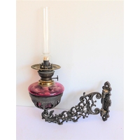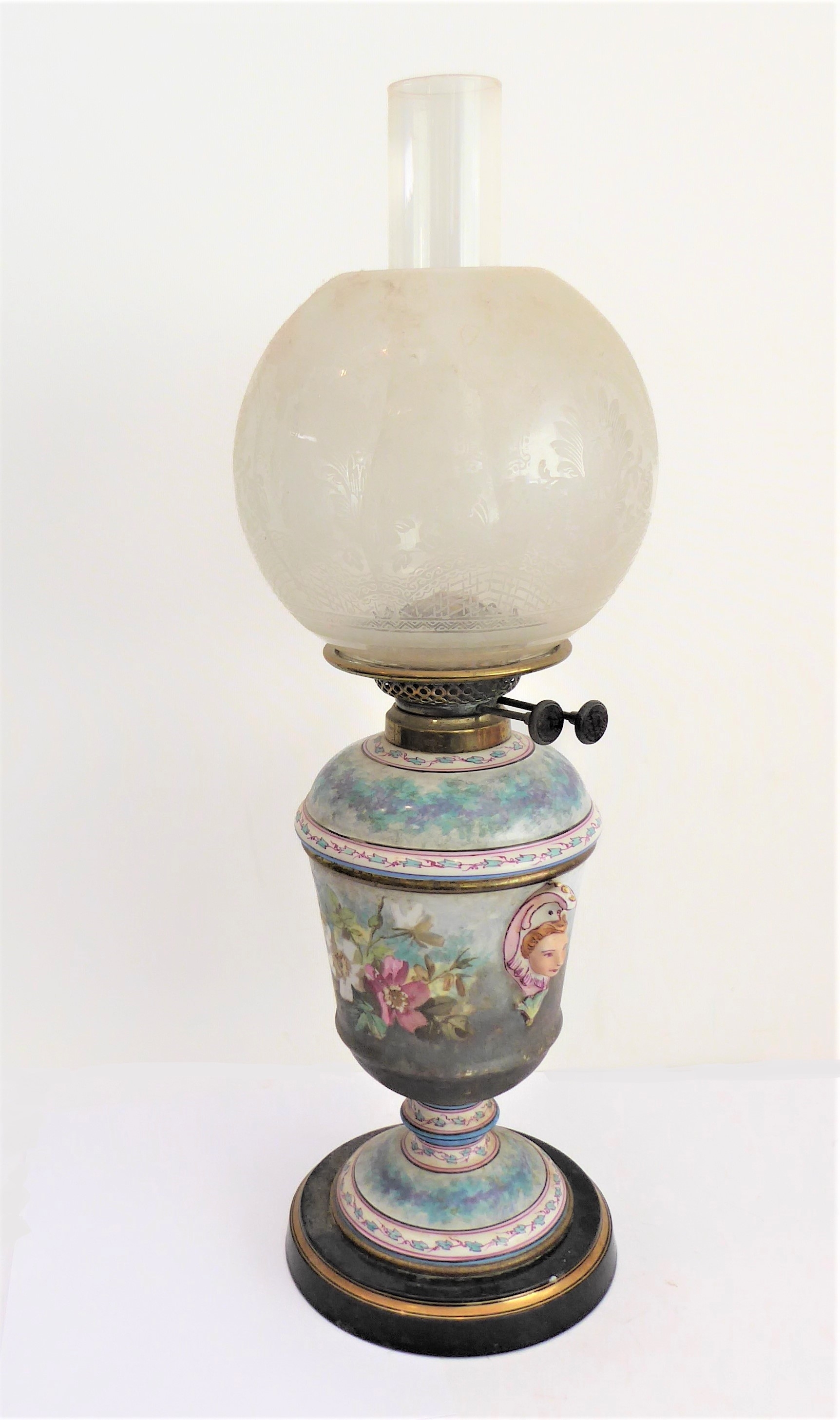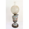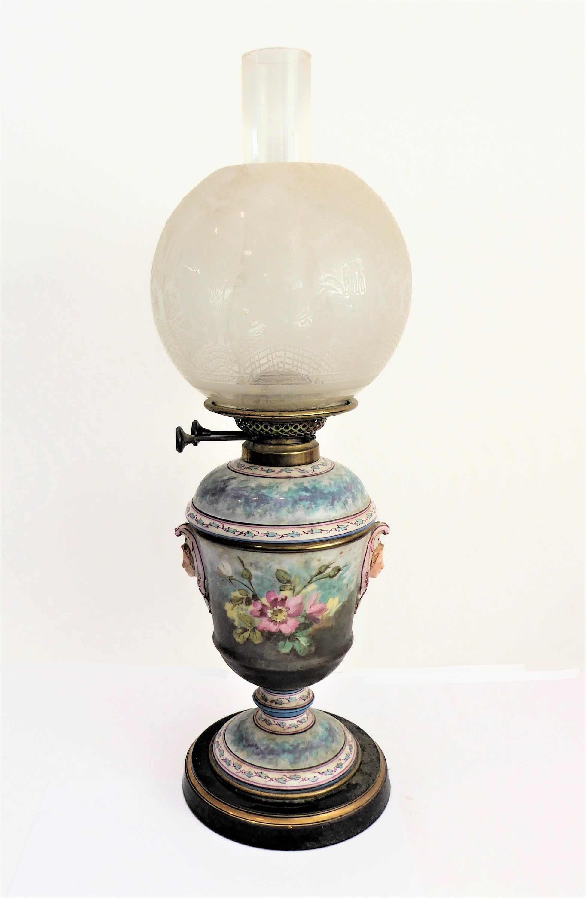 A late 19th century ceramic oil lamp: spherical, etched clear-glass shade; the circular tapering body decorated with two 'mask-handles' and flowers; gilt-highlighted ebonised-style base (51 cm high excluding glass funnel)
