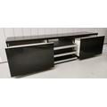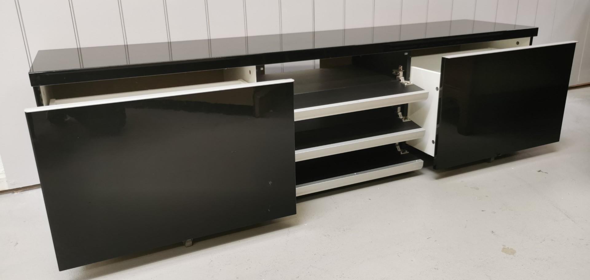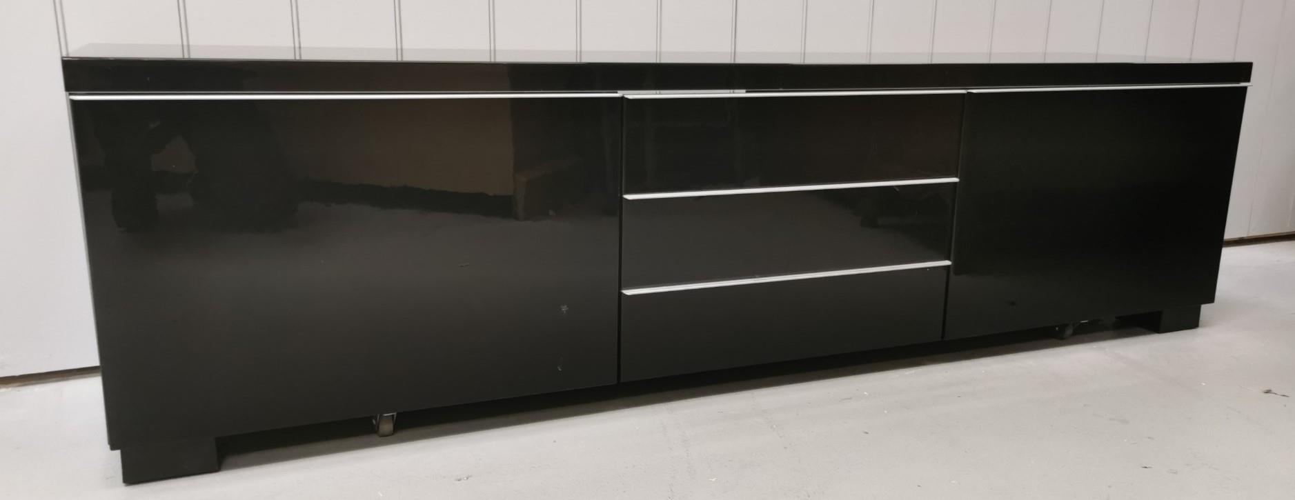 A large, contemporary TV cabinet/media organiser, in gloss black. Features three fall-front central compartments for digital receiver/DVD player etc., together with two large deep drawers. Dimensions(cm) H50, W180, D40.