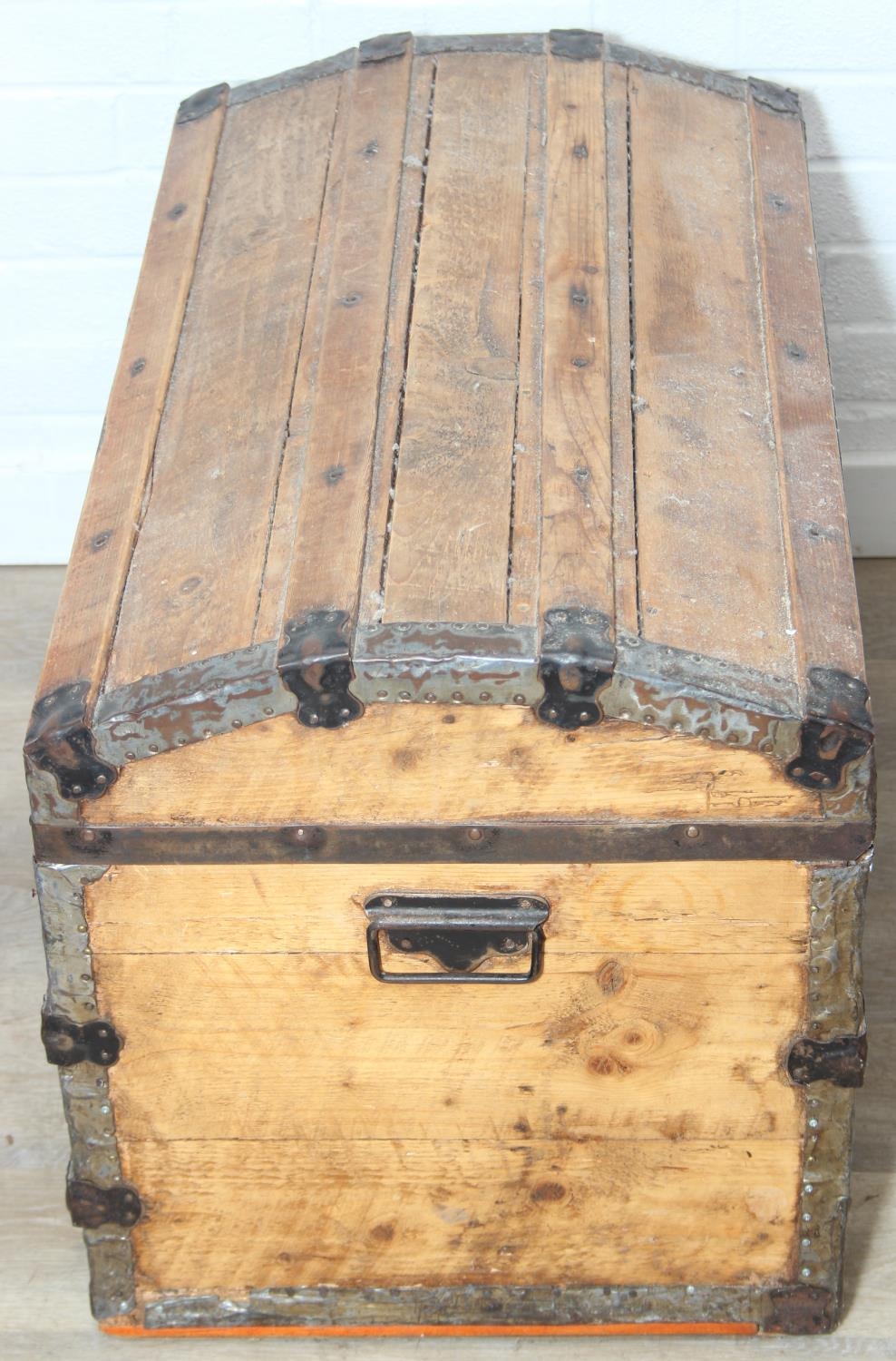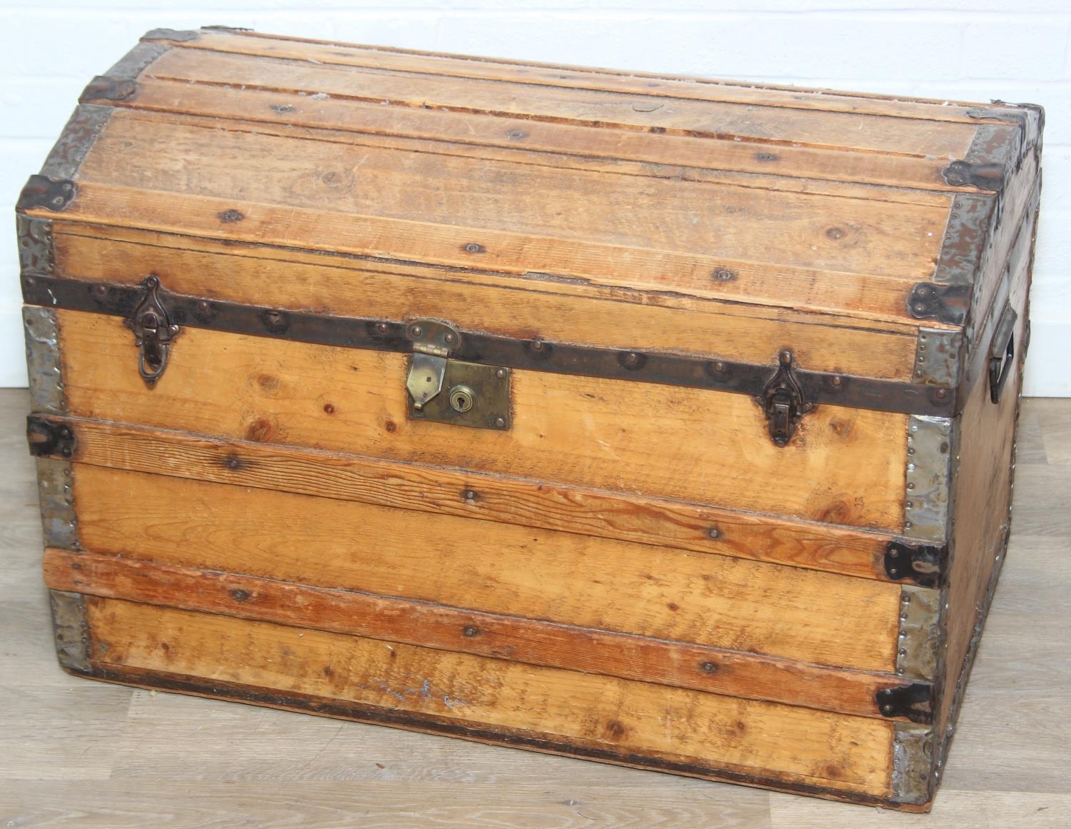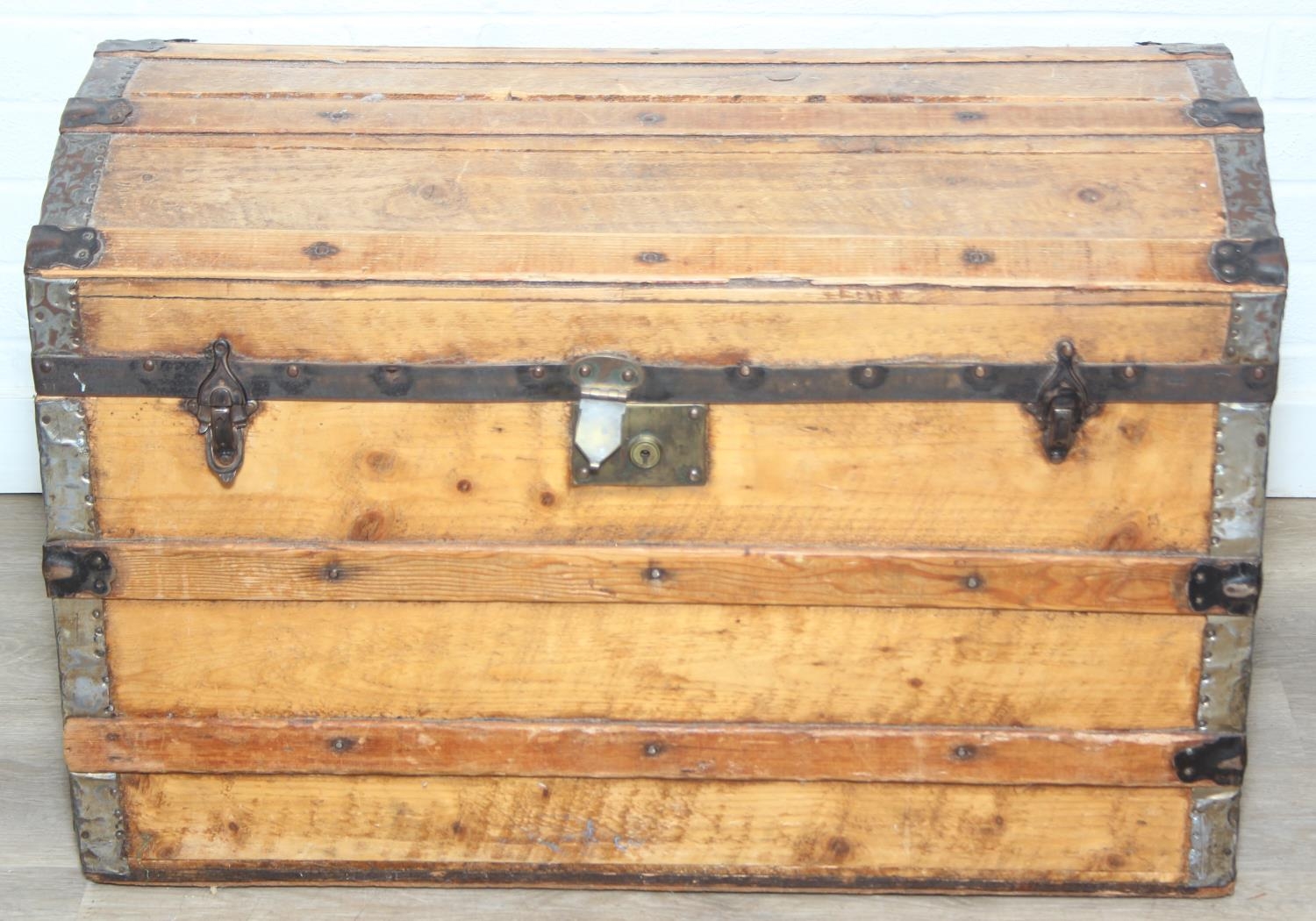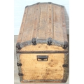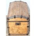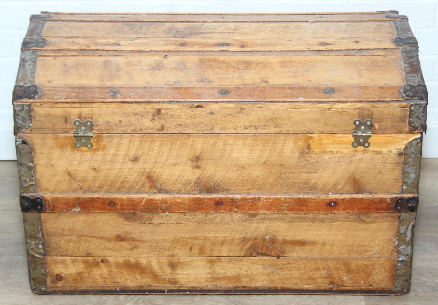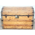 An antique stripped pine dome topped trunk with iron fittings, 83cm x 46cm x 54cm