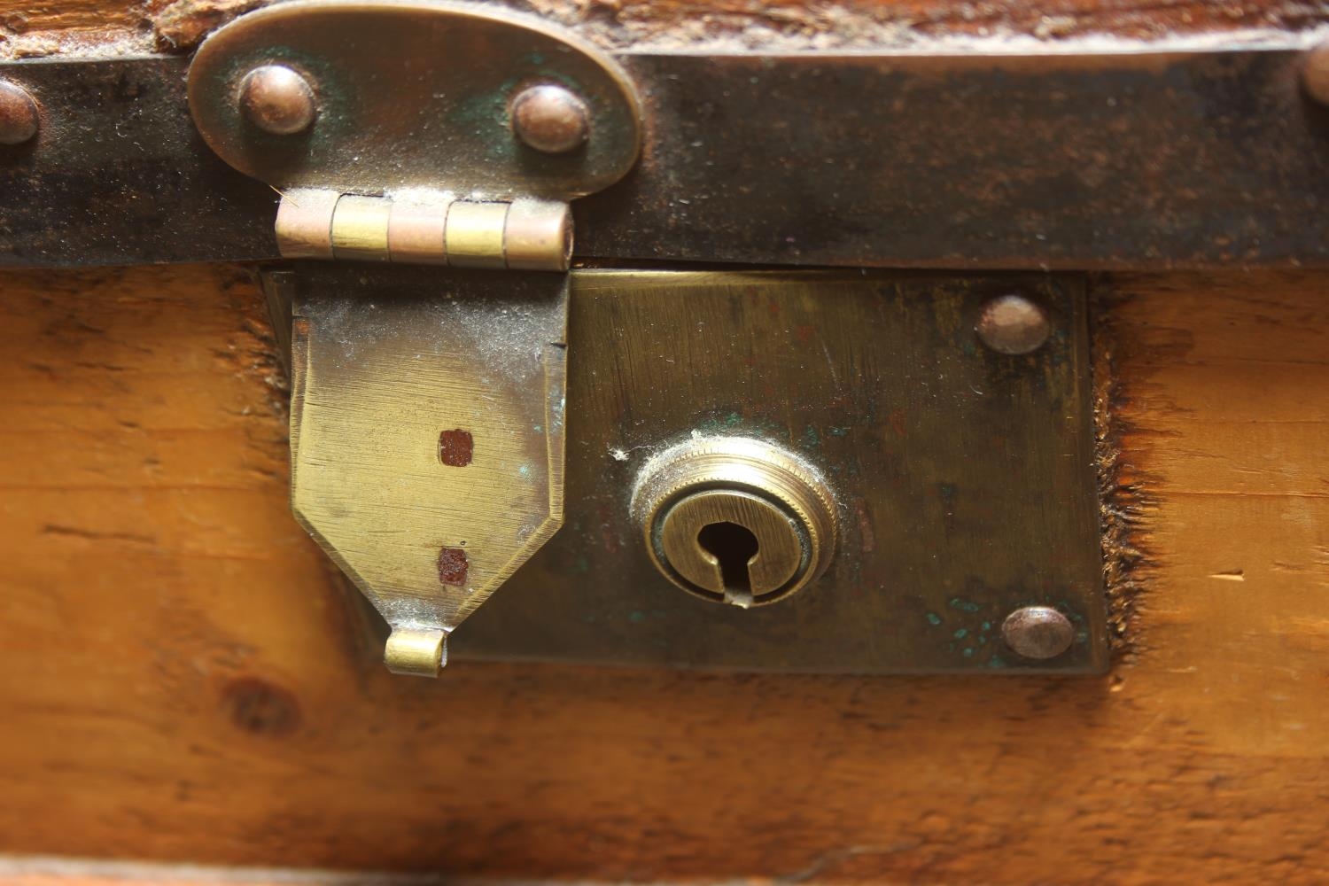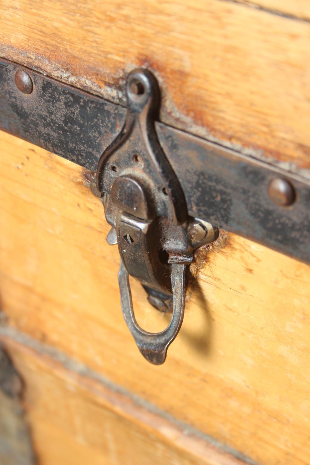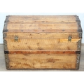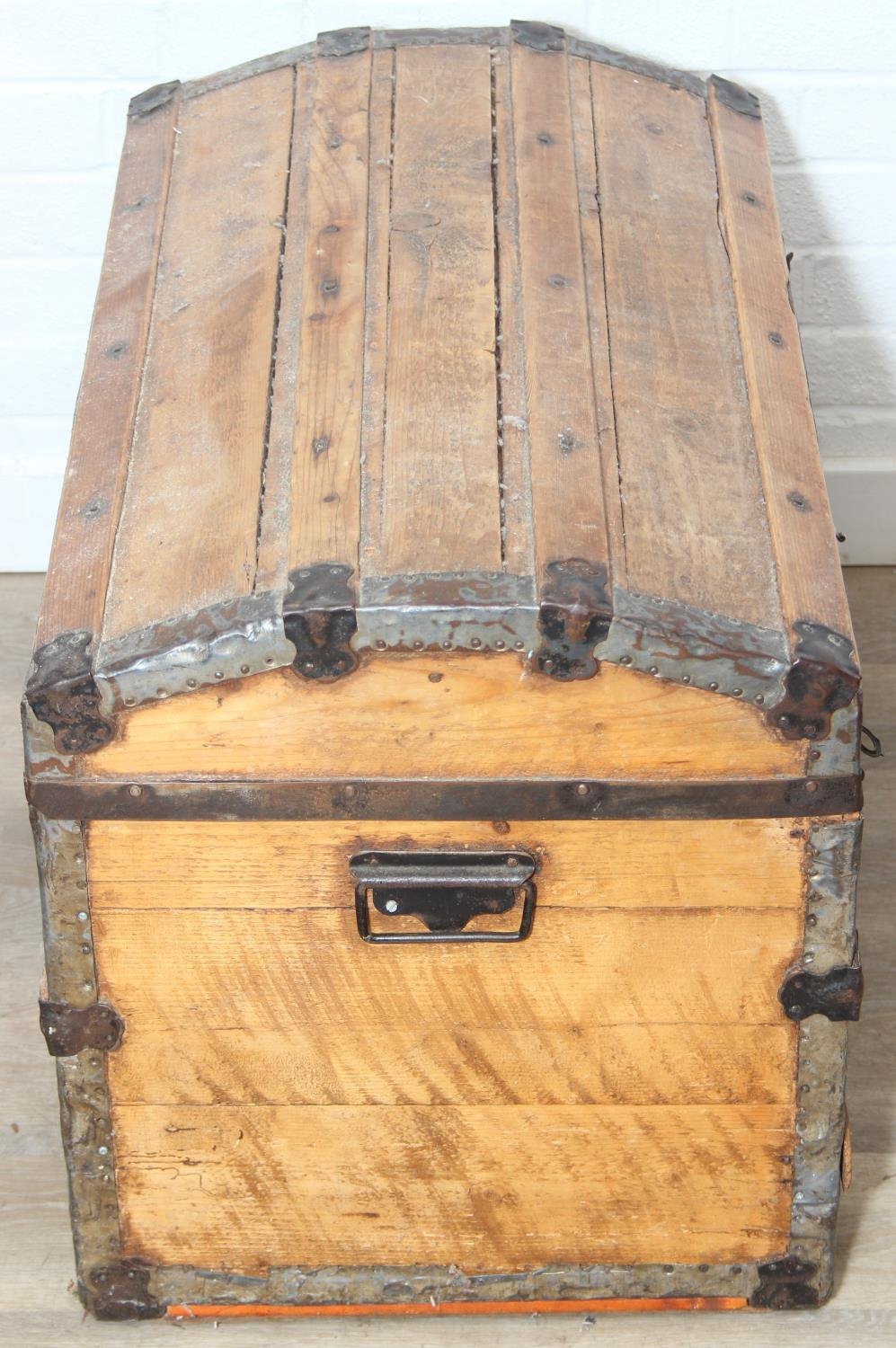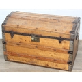 An antique stripped pine dome topped trunk with iron fittings, 83cm x 46cm x 54cm