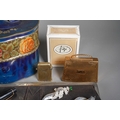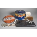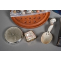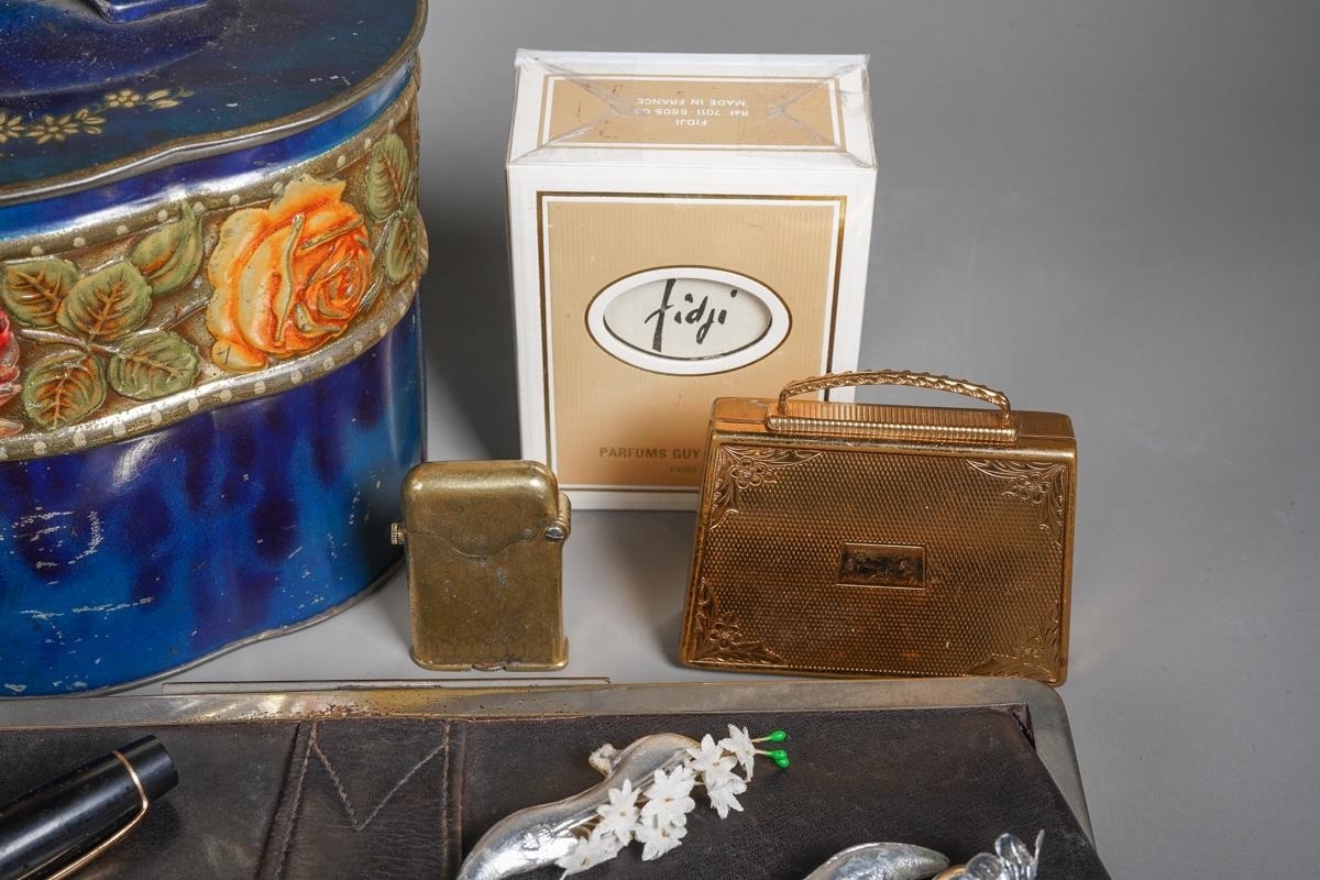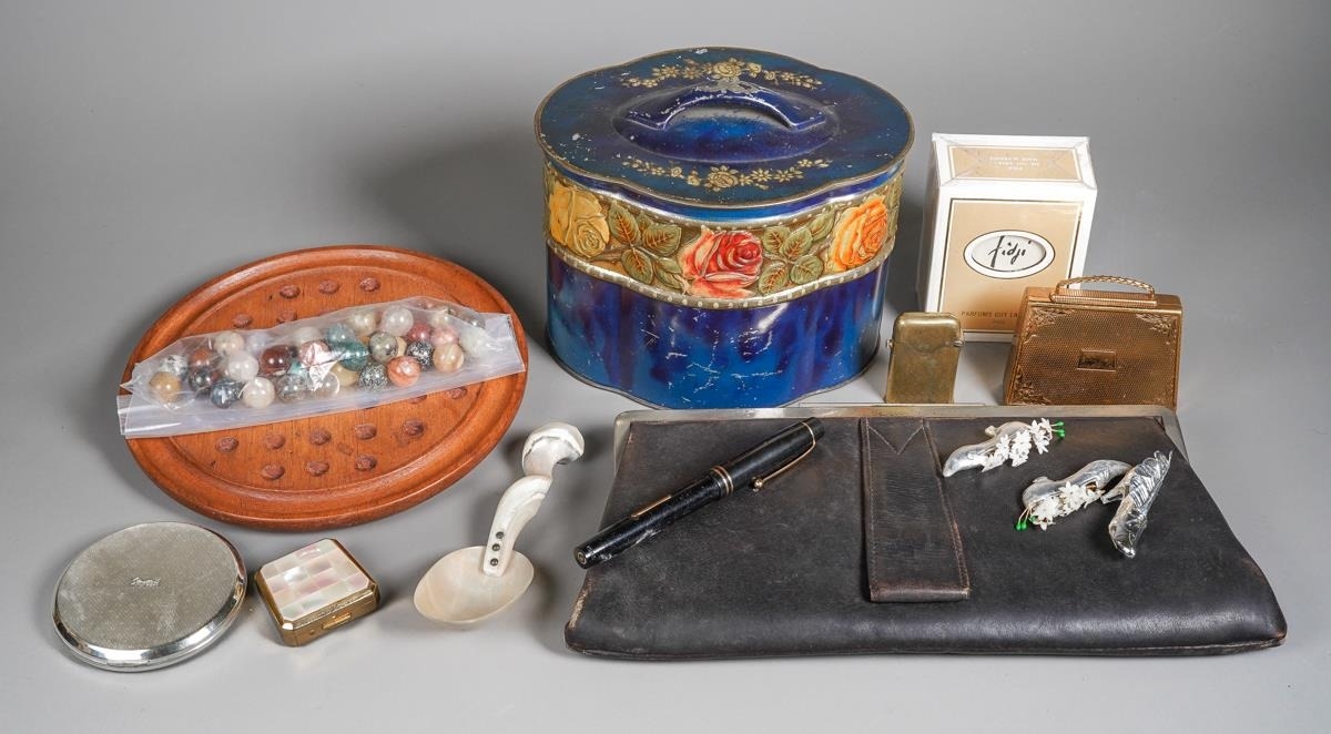 A box of collectables, including a Mascot gilt metal handbag shaped musical powder compact, a Stratton compact, a modern circular treen solitaire board and marbles with one spare, a vintage tin containing needlework items, a mother of pearl spoon, a sealed bottle of Guy Laroche Fidji perfume, a vintage handbag, etc (1 box)