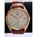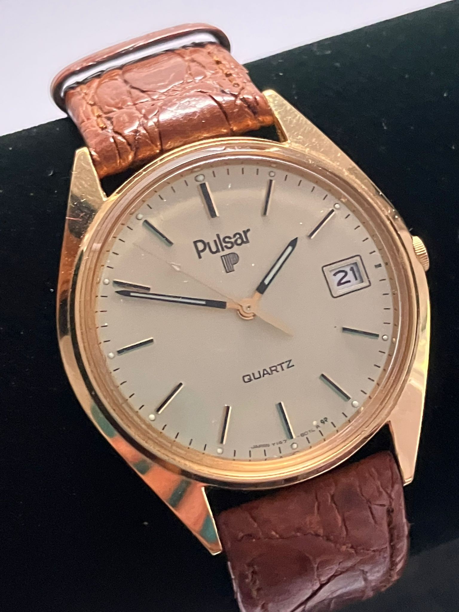 Gentleman’s PULSAR QUARTZ WRISTWATCH. Finished in GOLD TONE Stainless Steel. Brown leather strap. Excellent as new condition. Please see pictures.