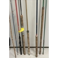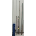 Collection of antique & vintage fishing equipment. To include 4 cork-handles rods, stand & portable camp bed.