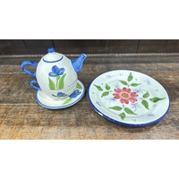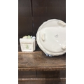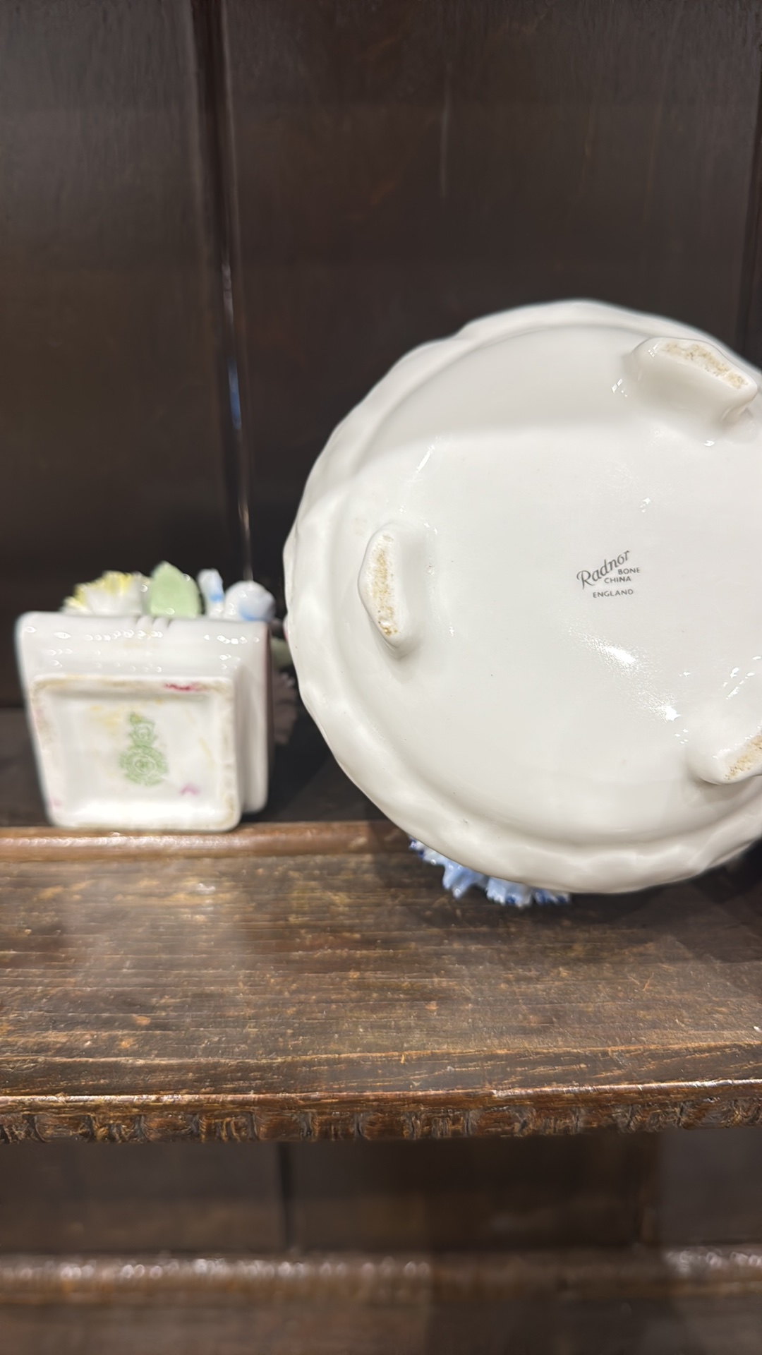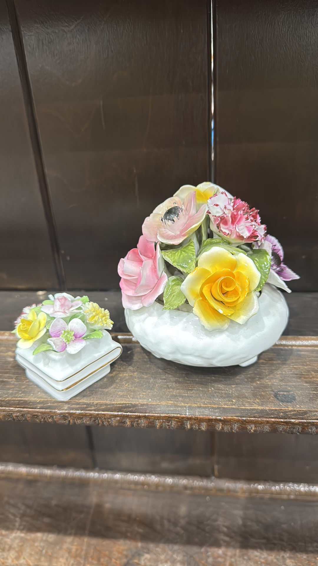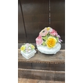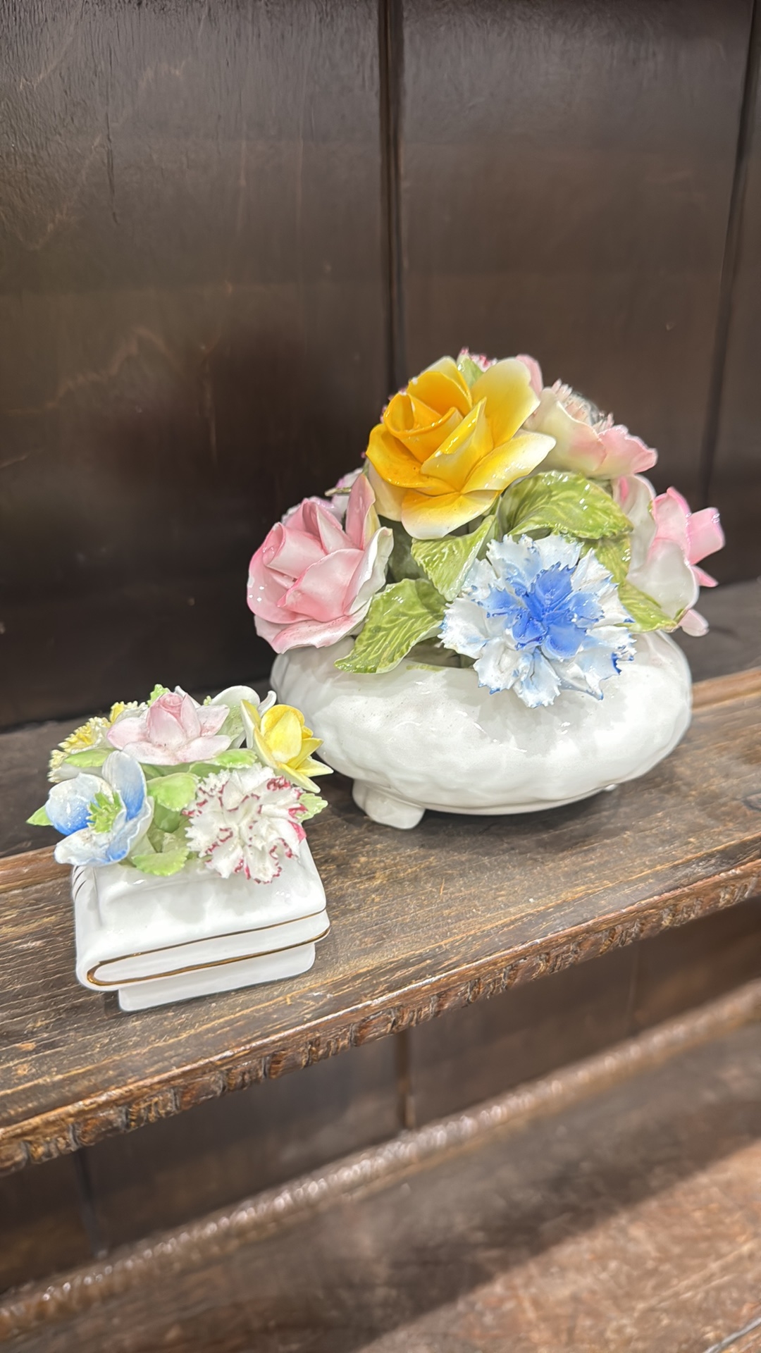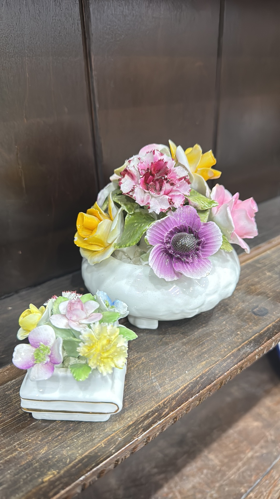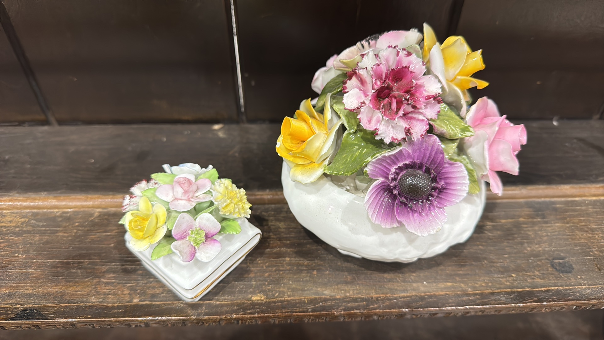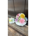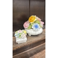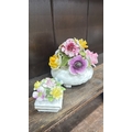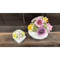 Pair of bone china floral posy arrangements comprising a Radnor round footed bowl and a small square book-form posy, each applied with polychrome flowers and foliage.