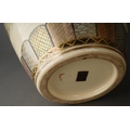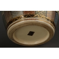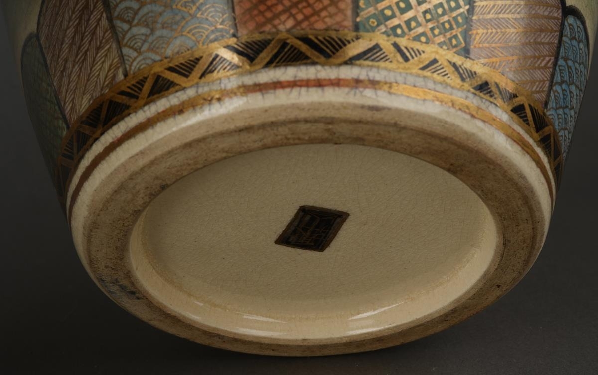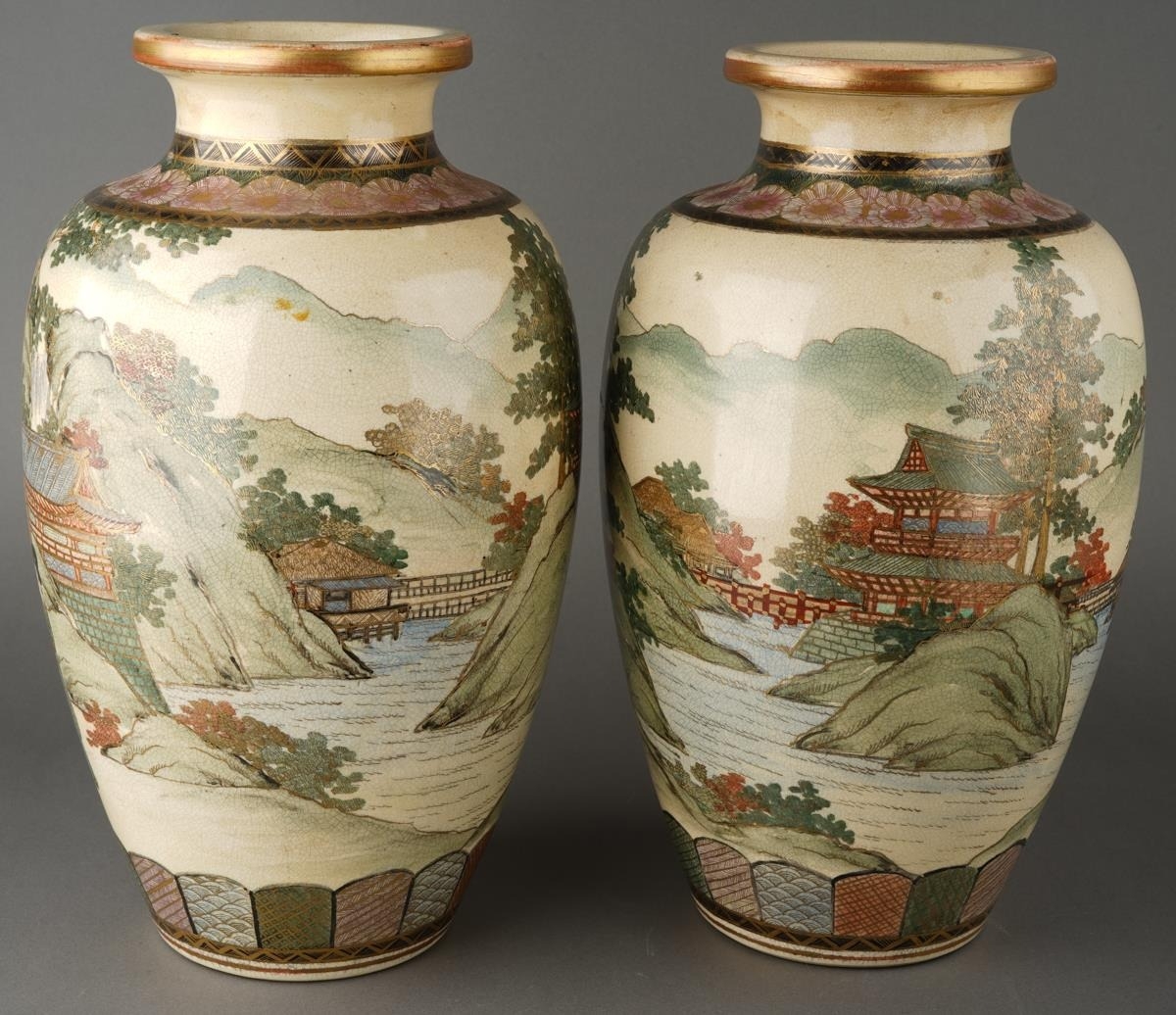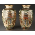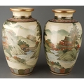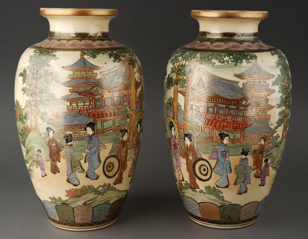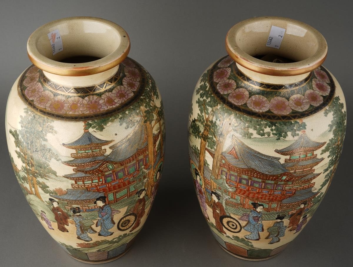 A pair of Satsuma vases decorated with Geisha with pagoda and mountains behind, character mark to bases, approx 32cm high [2]
