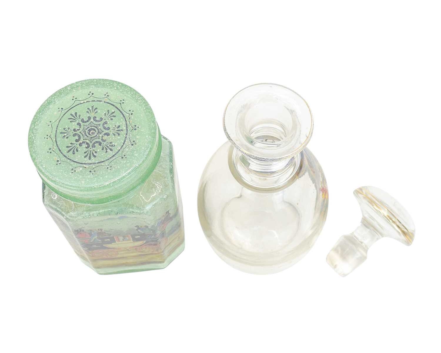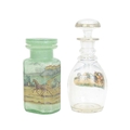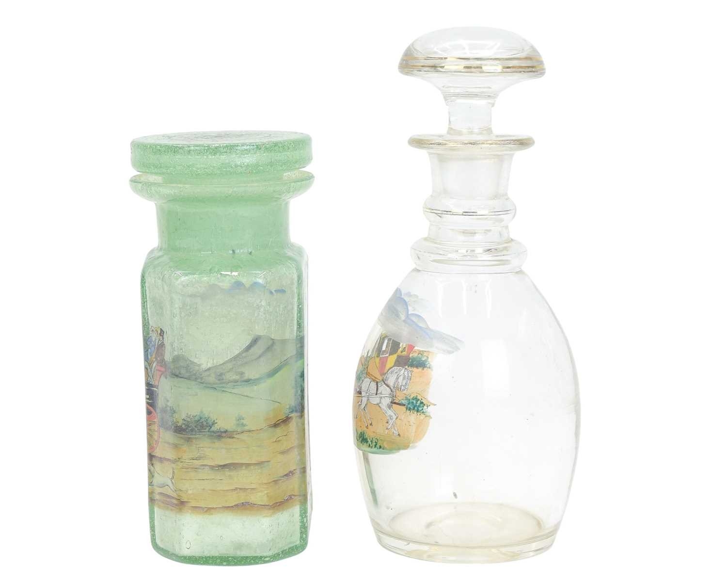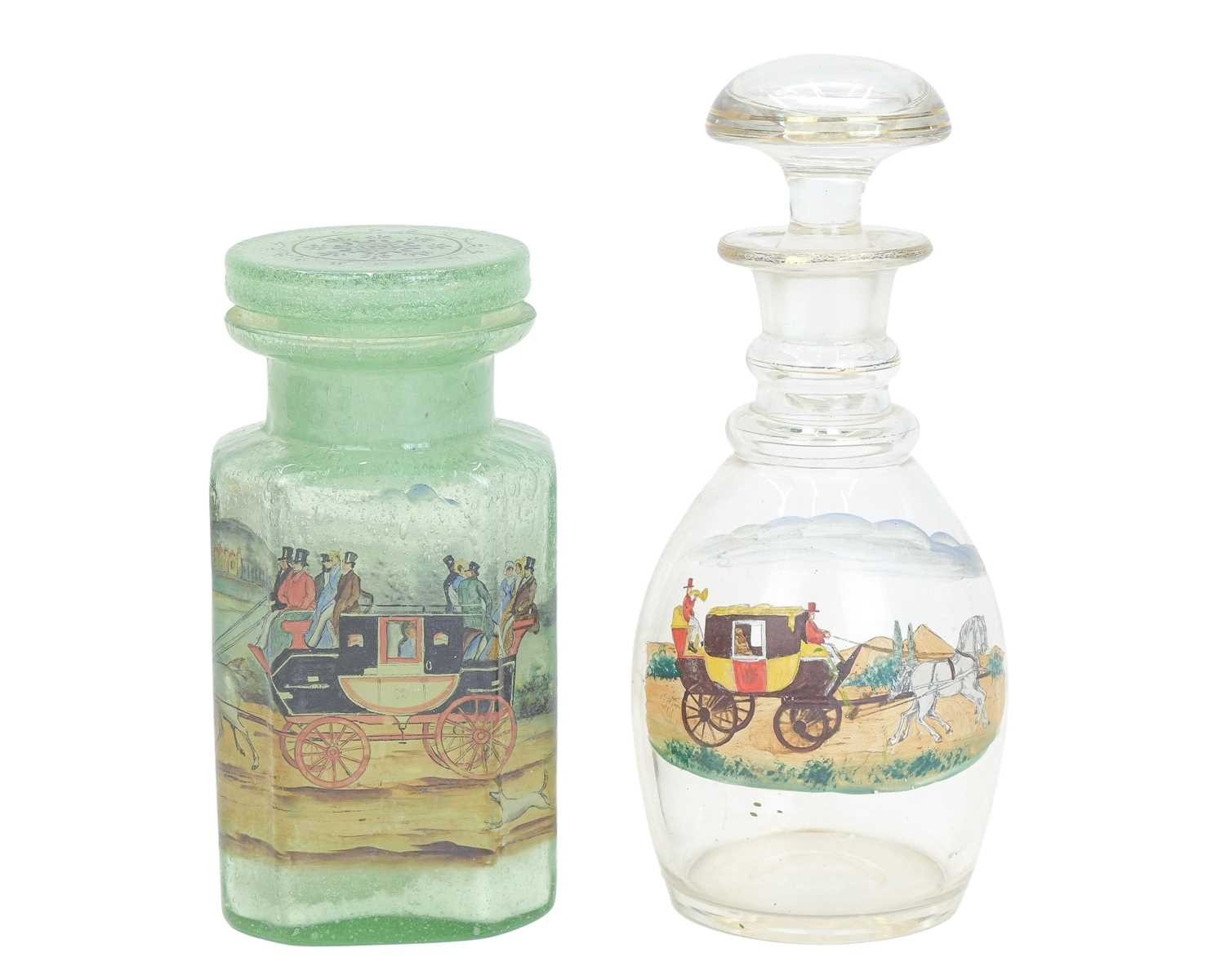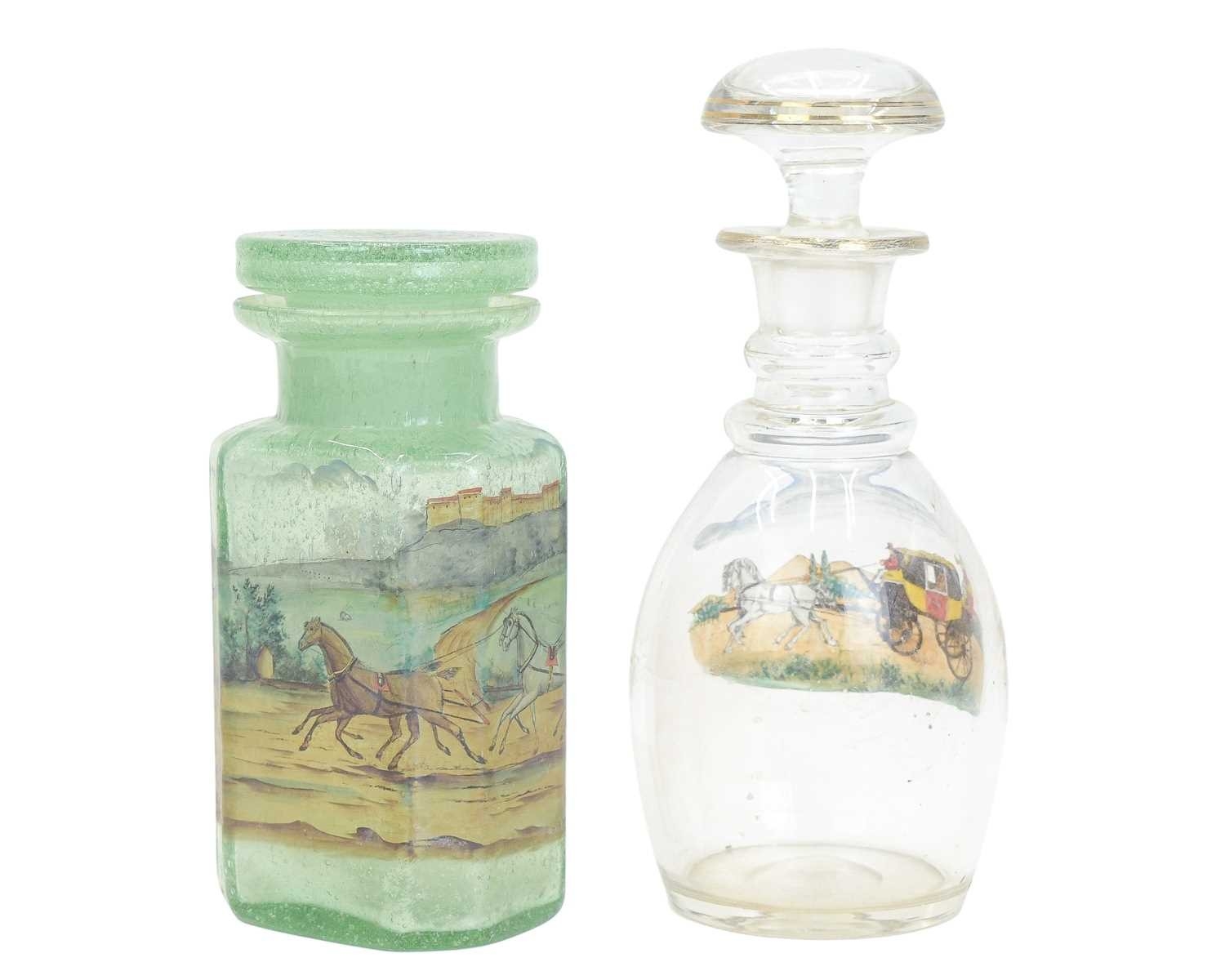 An early 20th century continental glass jar, and a decanter. Both decorated with coaching scenes. 23.5cm and 18.5cm in height respectively.