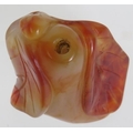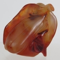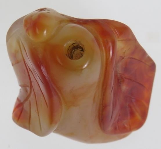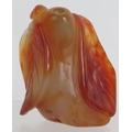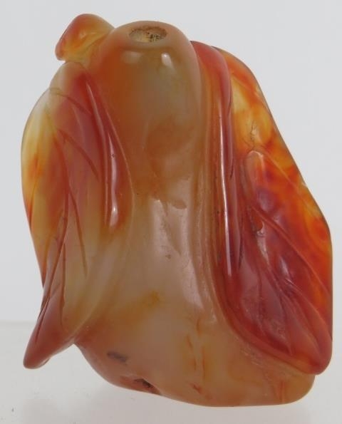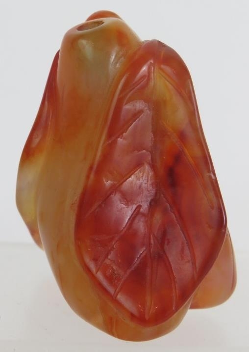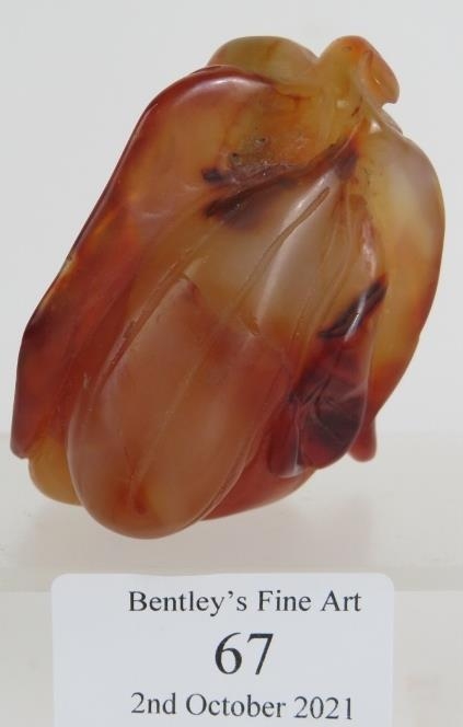 A Chinese carved hardstone snuff bottle of melon and leaf form, probably russet Jade. No spoon. Height 6cm.