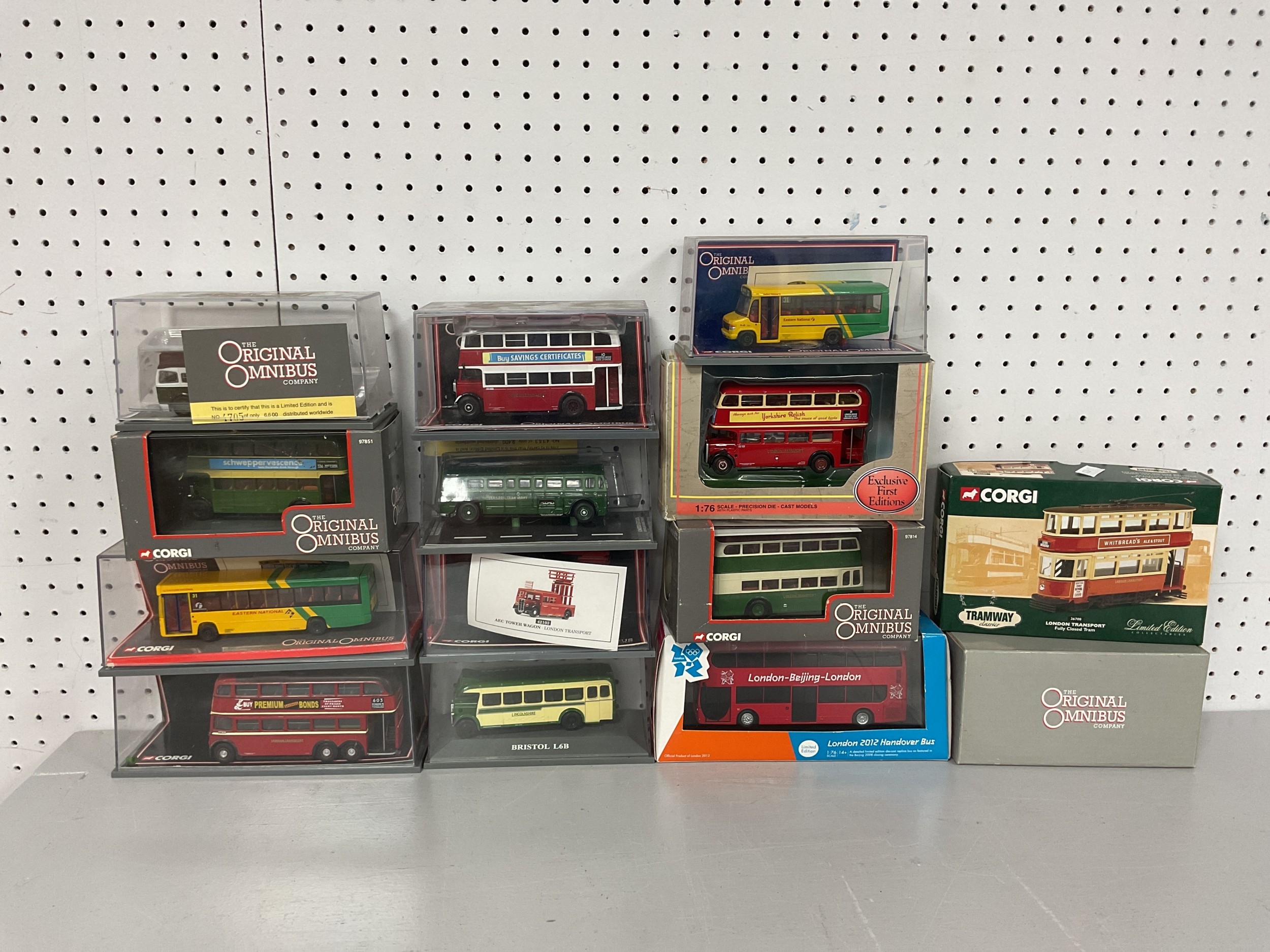 Fourteen 1:76th Scale Diecast Model Buses/Tram by EFE, Corgi to include The Original Omnibus Company #43401 Plaxton Beaver 2 - Eastern National, boxed.