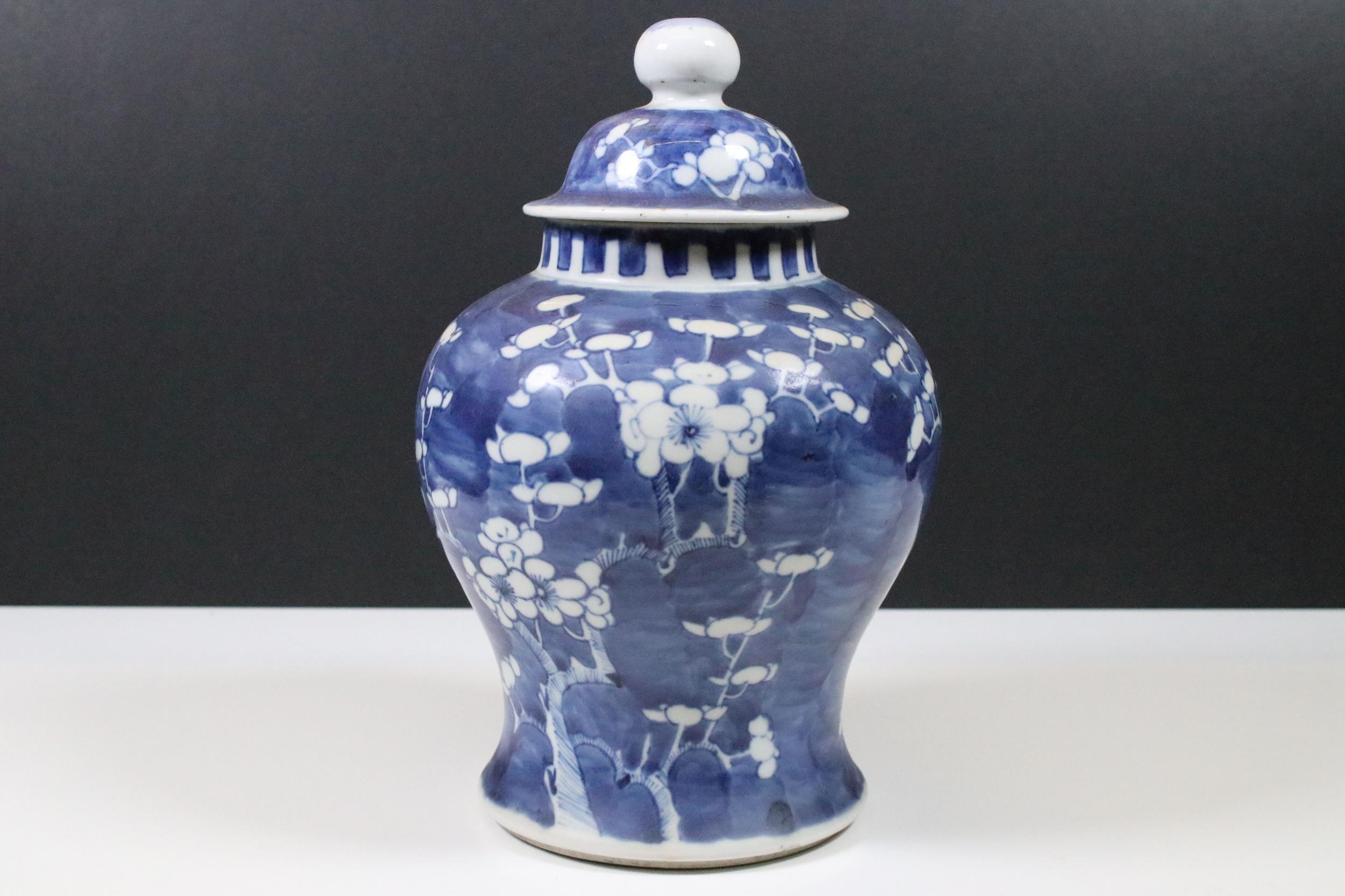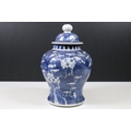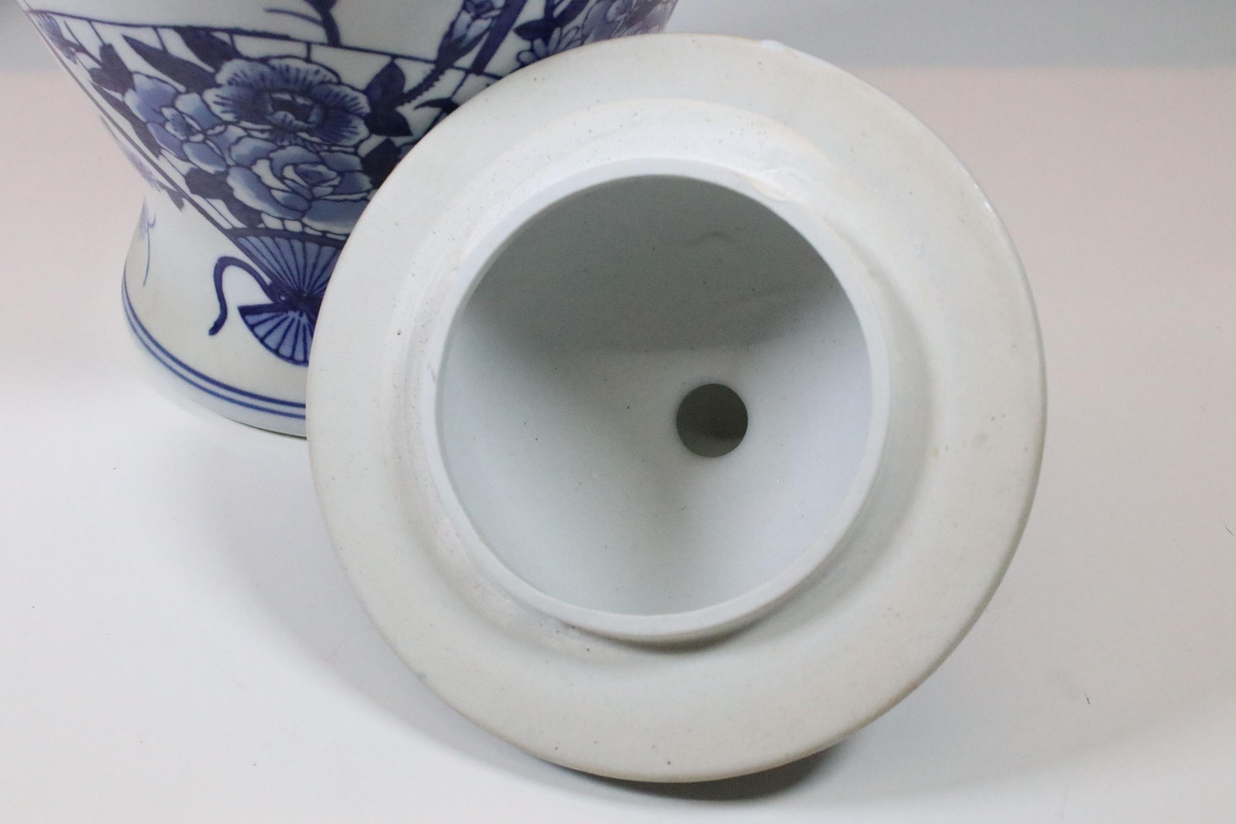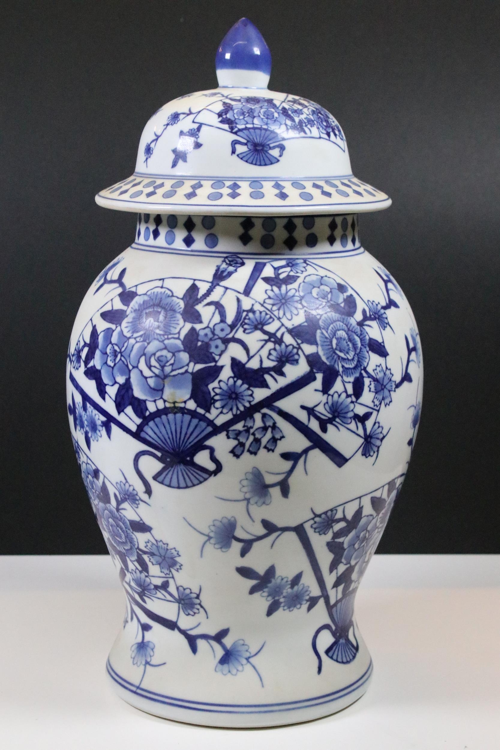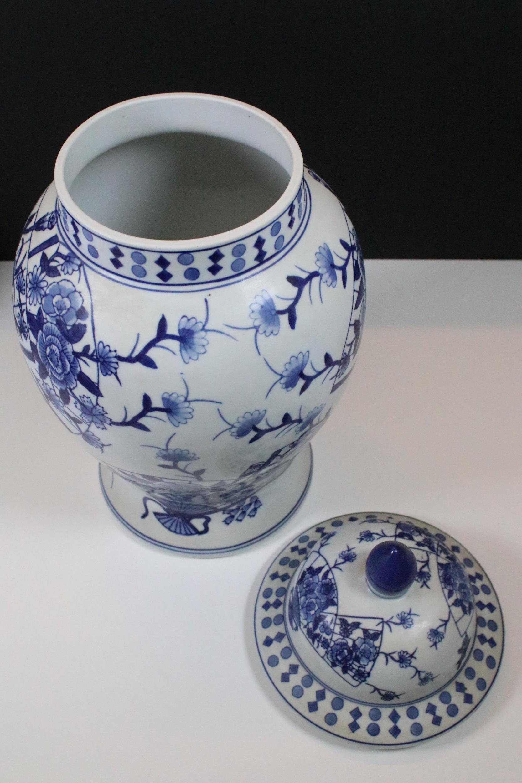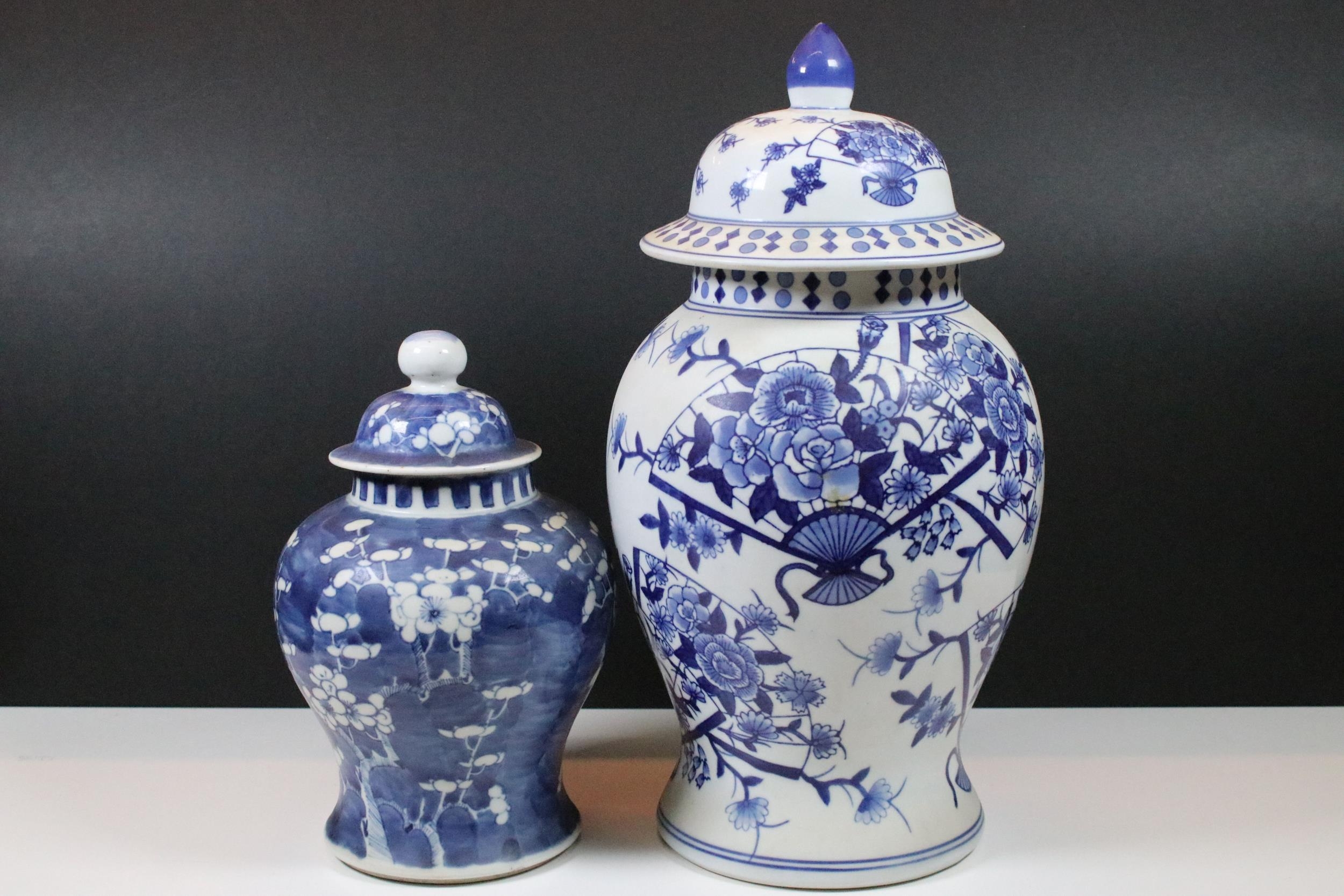 Two Chinese porcelain lidded vases to include 19th Century Prunus pattern example, with 2 x blue rings to base, possibly Kang Xi and large 20th Century lidded vase with floral and fan decoration