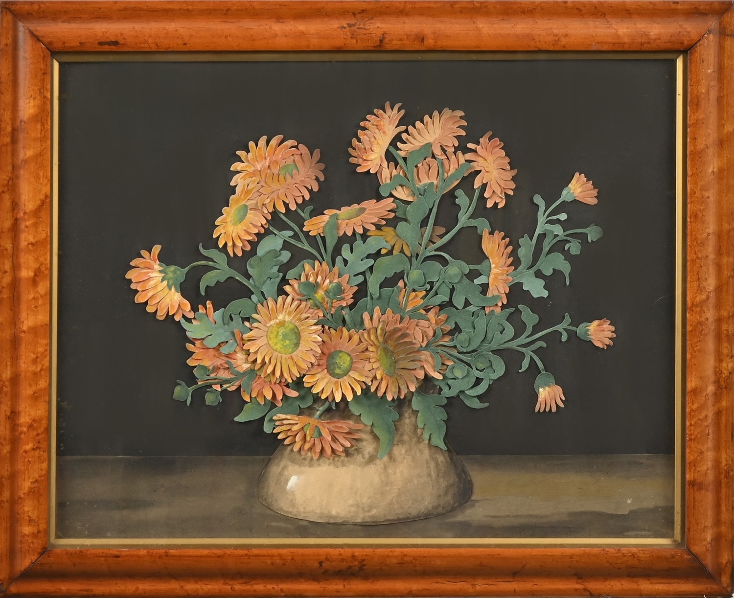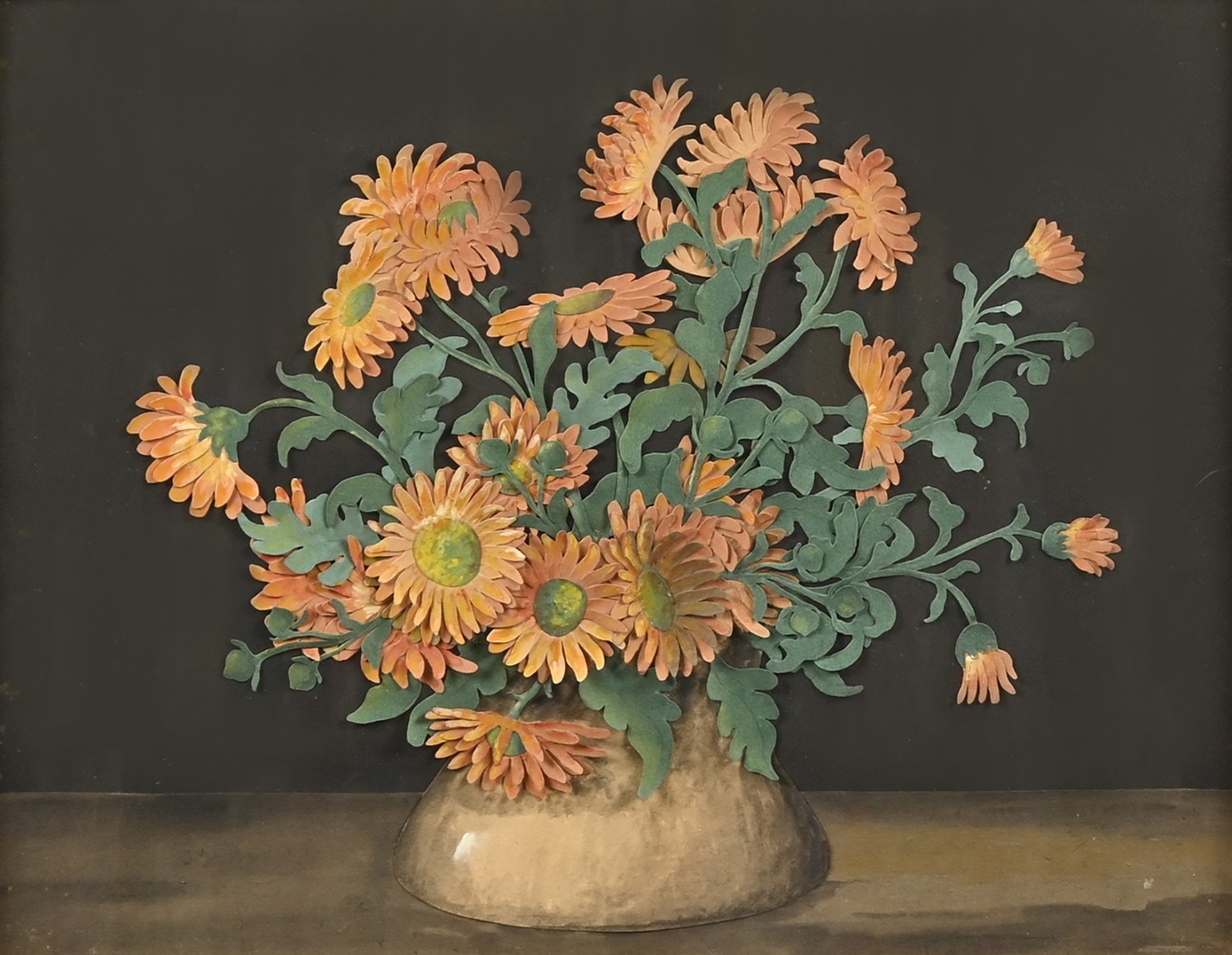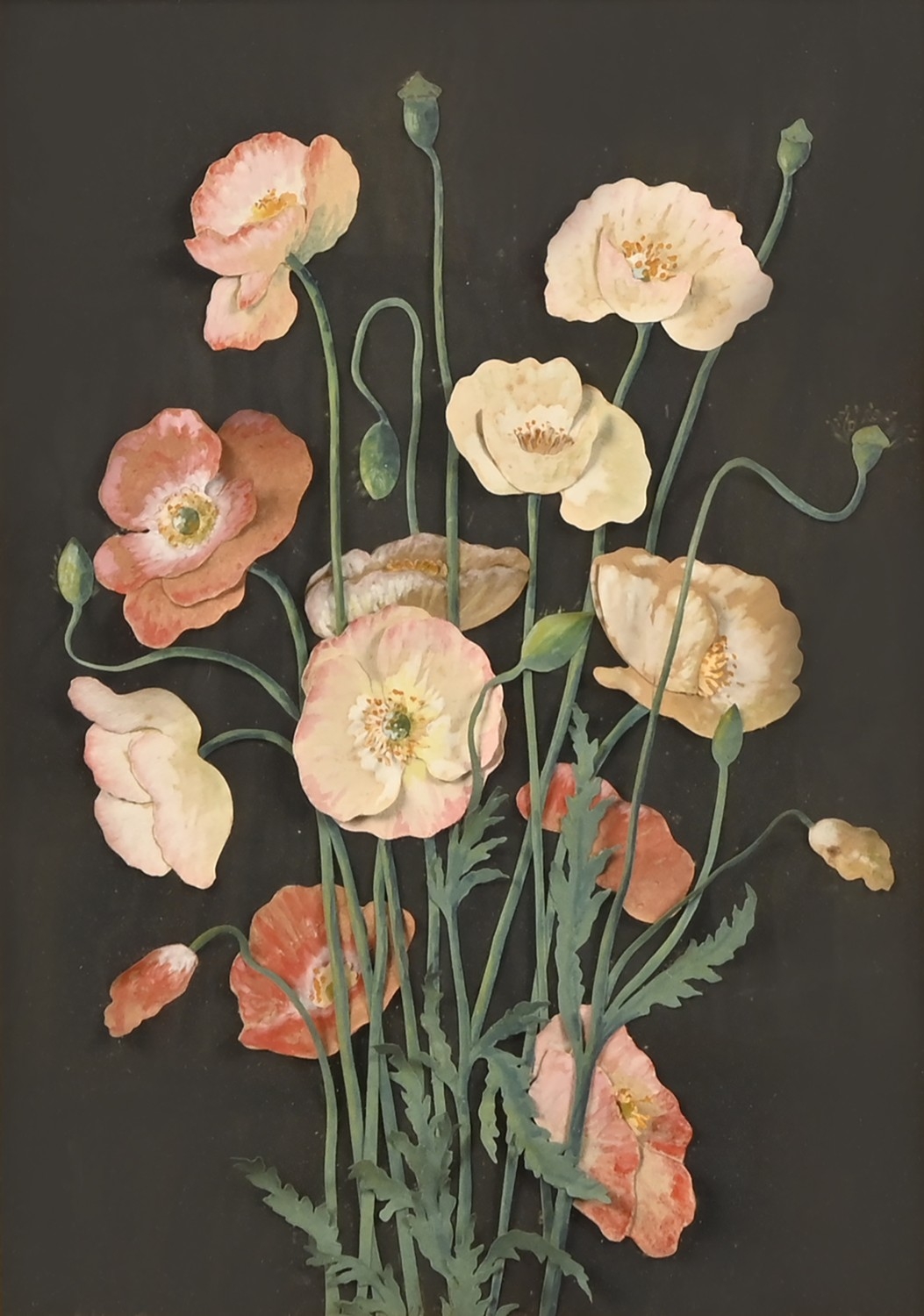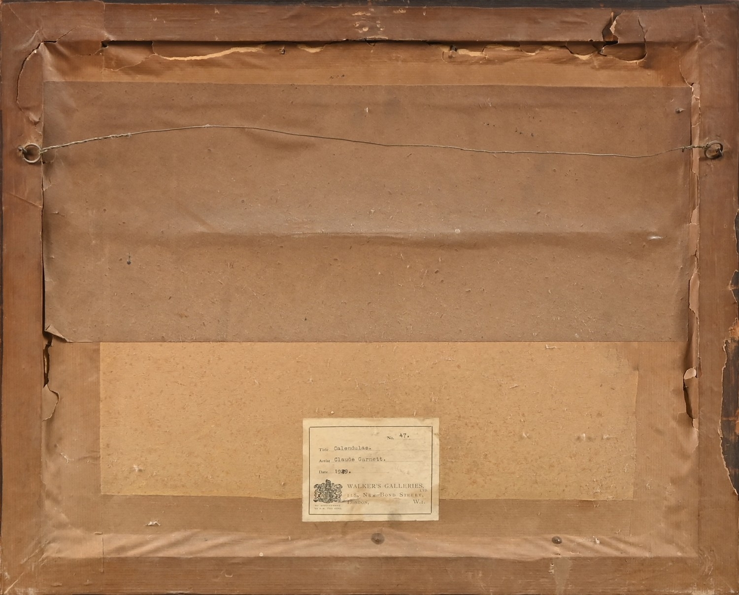 Claude Garnett (1864-1950) - Calendulas and other subjects, five, watercolour, gouache and cut paper on black paper, the largest signed in blue crayon, 56 x 40cm and other sizes, in the artist's selected 19th c bird's eye maple frames, one with the artist's trade label verso "Original method of flower painting designed and executed by Claude Garnett, 27 Gunterstone Road West Kensington, London W14", another with typewritten trade label of Walker's Galleries, 118 Bond St, London, dated 1929