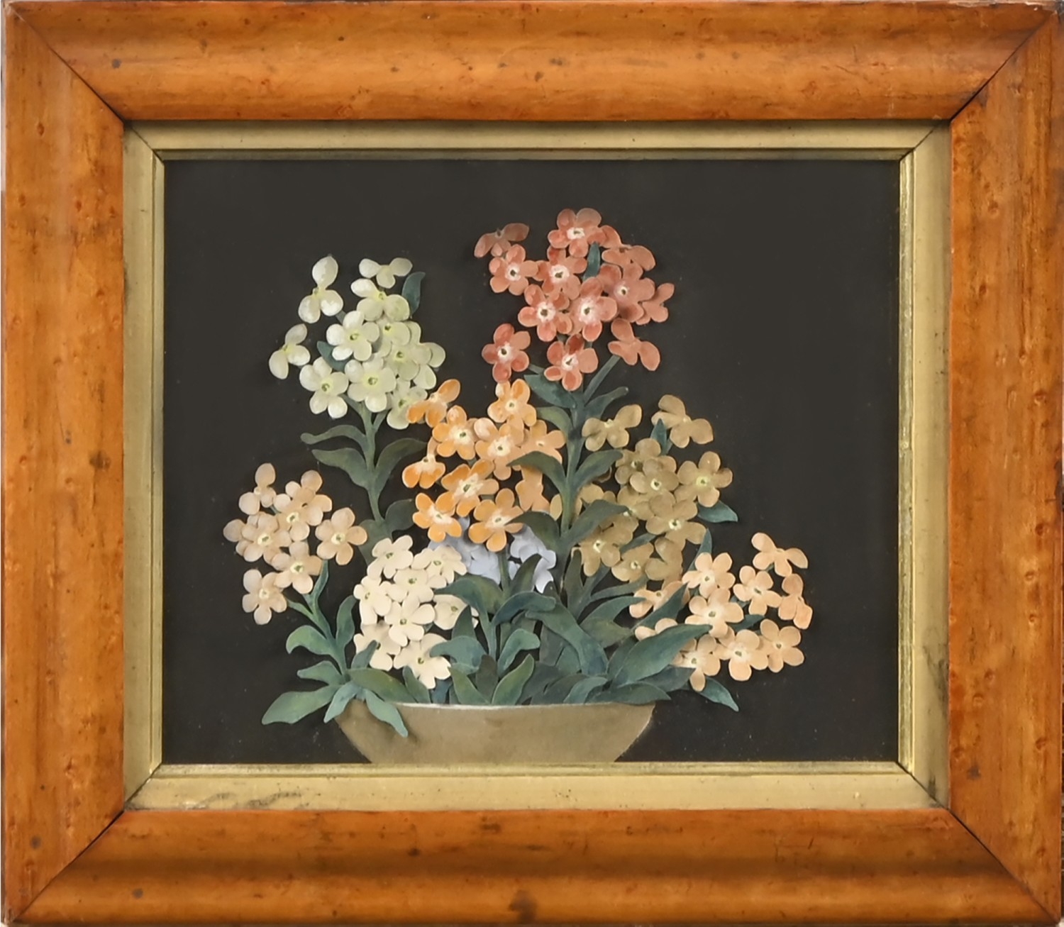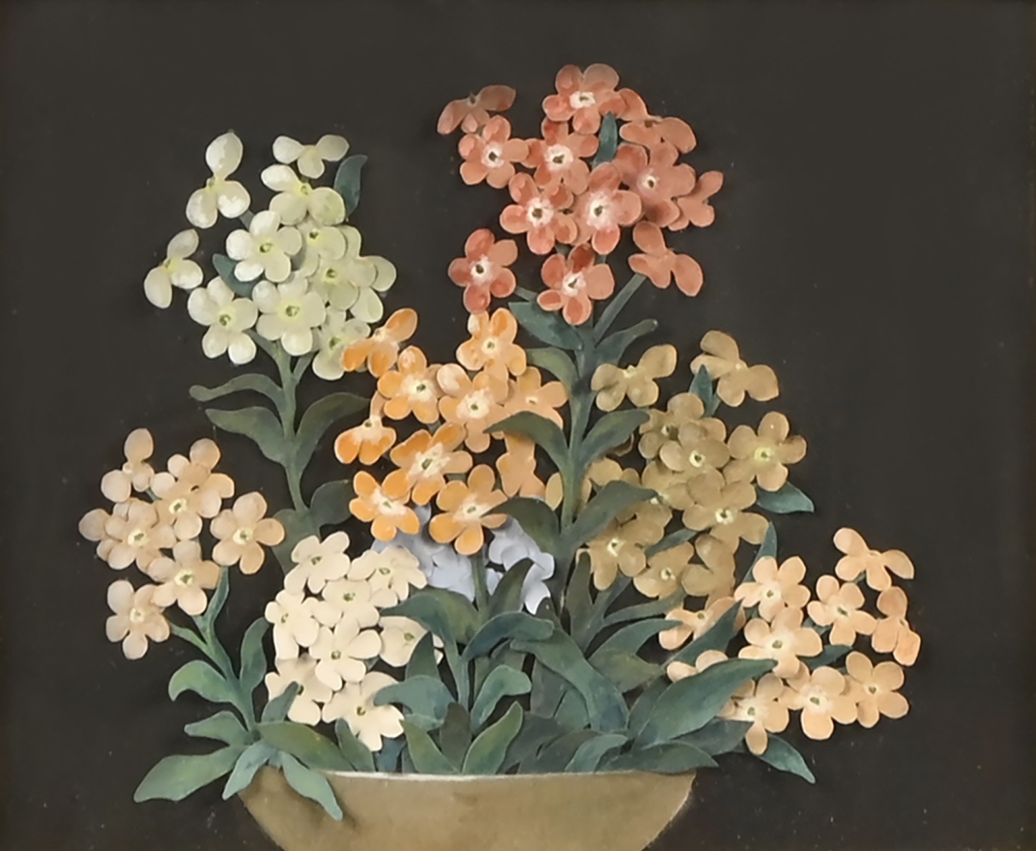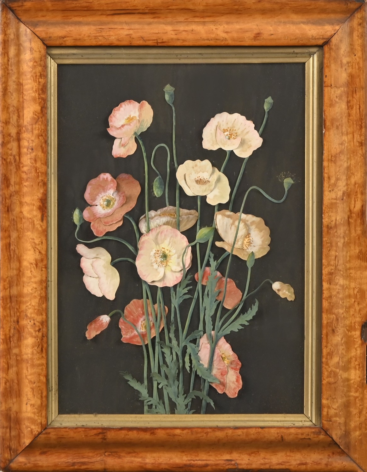 Claude Garnett (1864-1950) - Calendulas and other subjects, five, watercolour, gouache and cut paper on black paper, the largest signed in blue crayon, 56 x 40cm and other sizes, in the artist's selected 19th c bird's eye maple frames, one with the artist's trade label verso "Original method of flower painting designed and executed by Claude Garnett, 27 Gunterstone Road West Kensington, London W14", another with typewritten trade label of Walker's Galleries, 118 Bond St, London, dated 1929