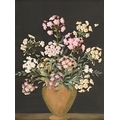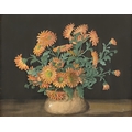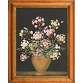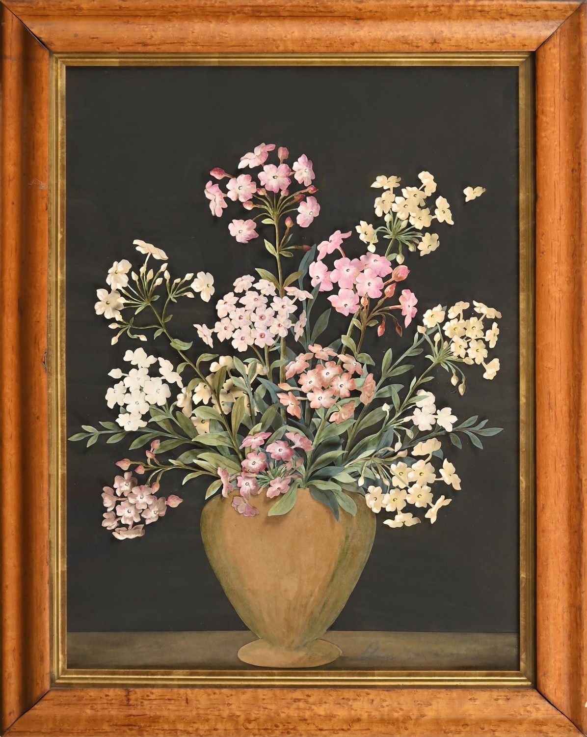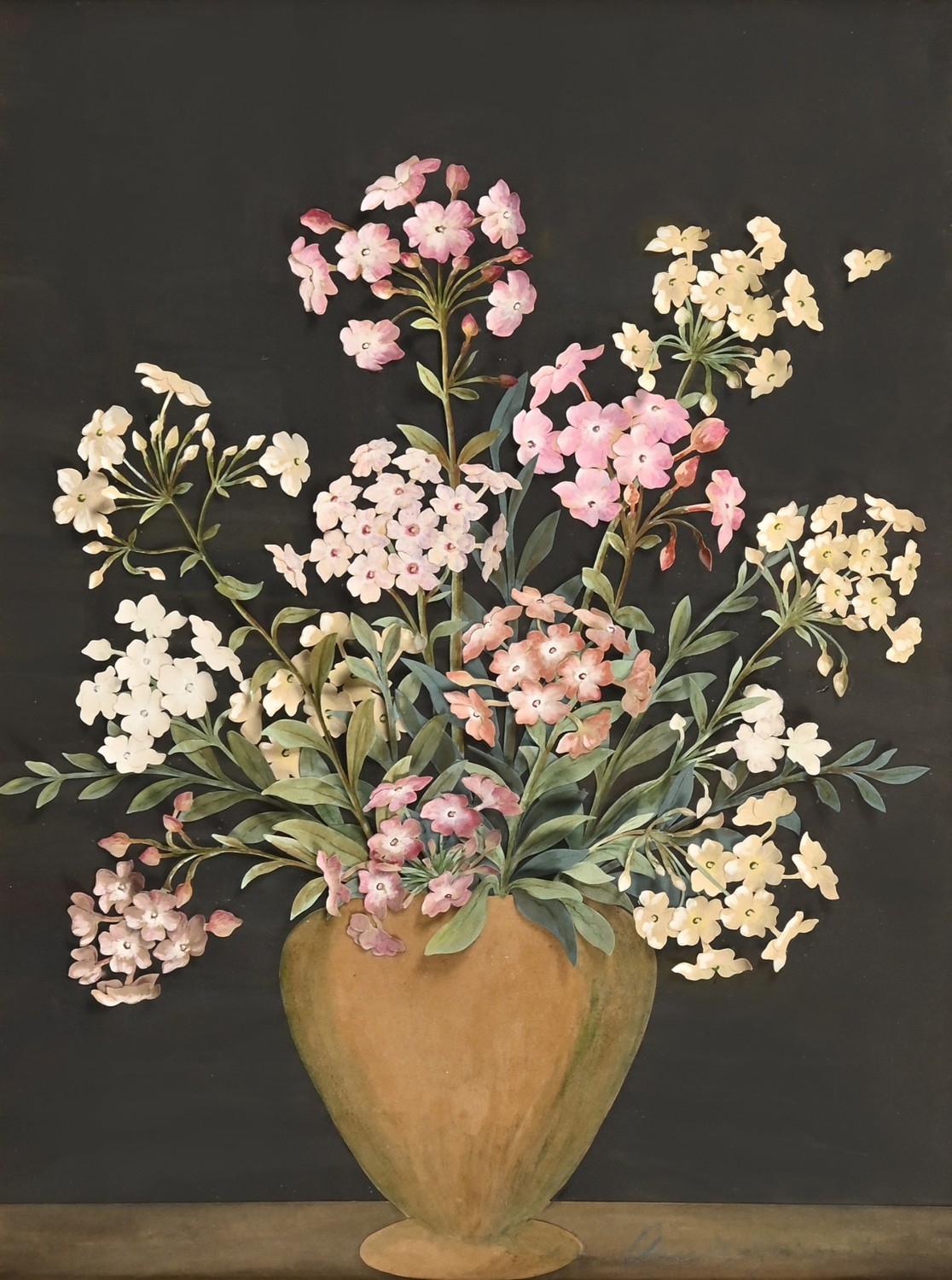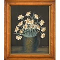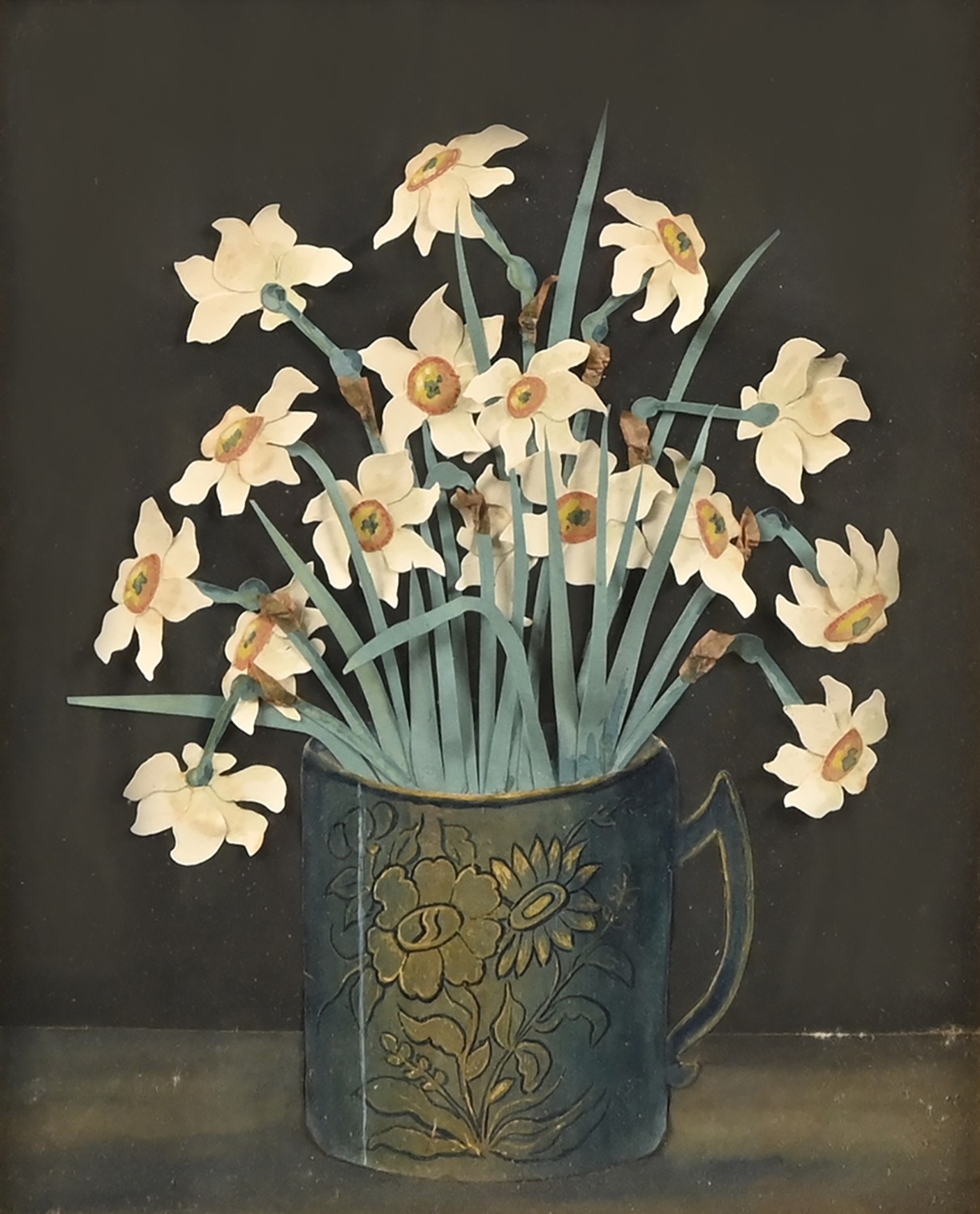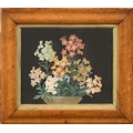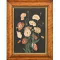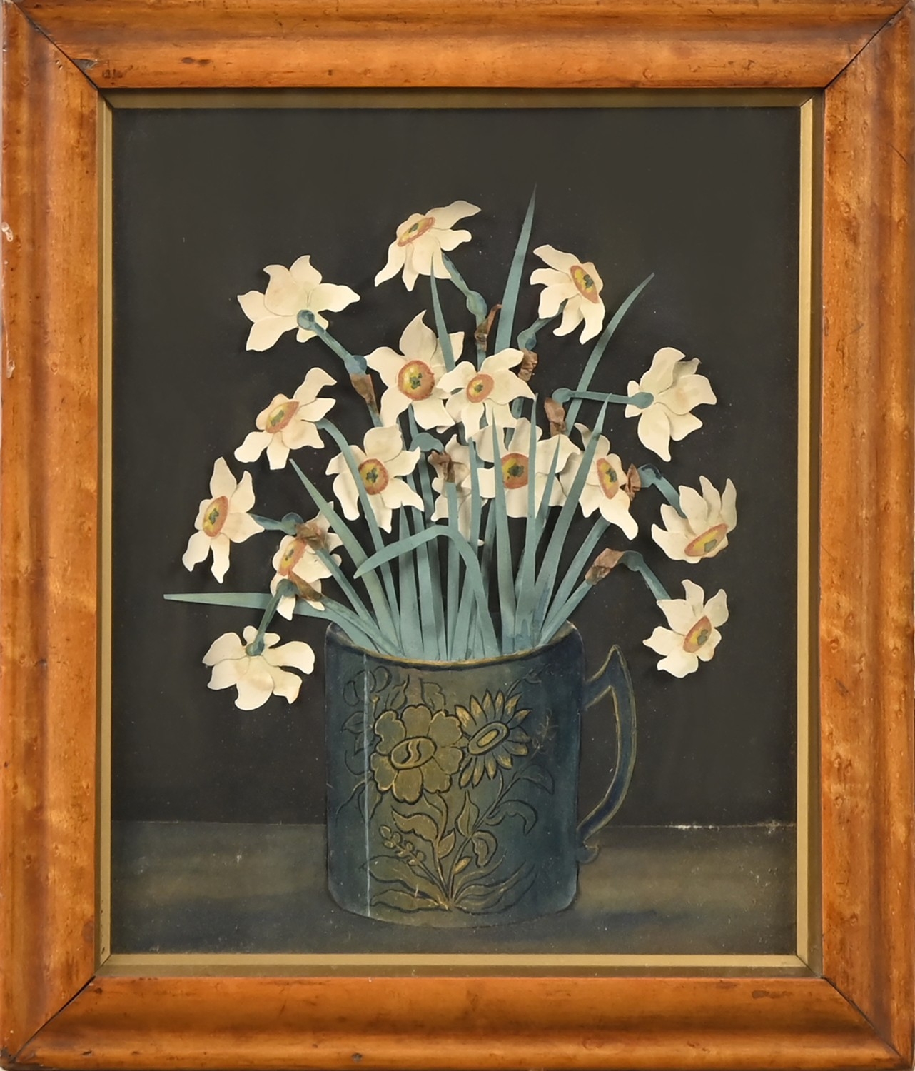 Claude Garnett (1864-1950) - Calendulas and other subjects, five, watercolour, gouache and cut paper on black paper, the largest signed in blue crayon, 56 x 40cm and other sizes, in the artist's selected 19th c bird's eye maple frames, one with the artist's trade label verso "Original method of flower painting designed and executed by Claude Garnett, 27 Gunterstone Road West Kensington, London W14", another with typewritten trade label of Walker's Galleries, 118 Bond St, London, dated 1929