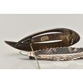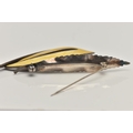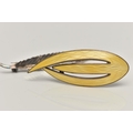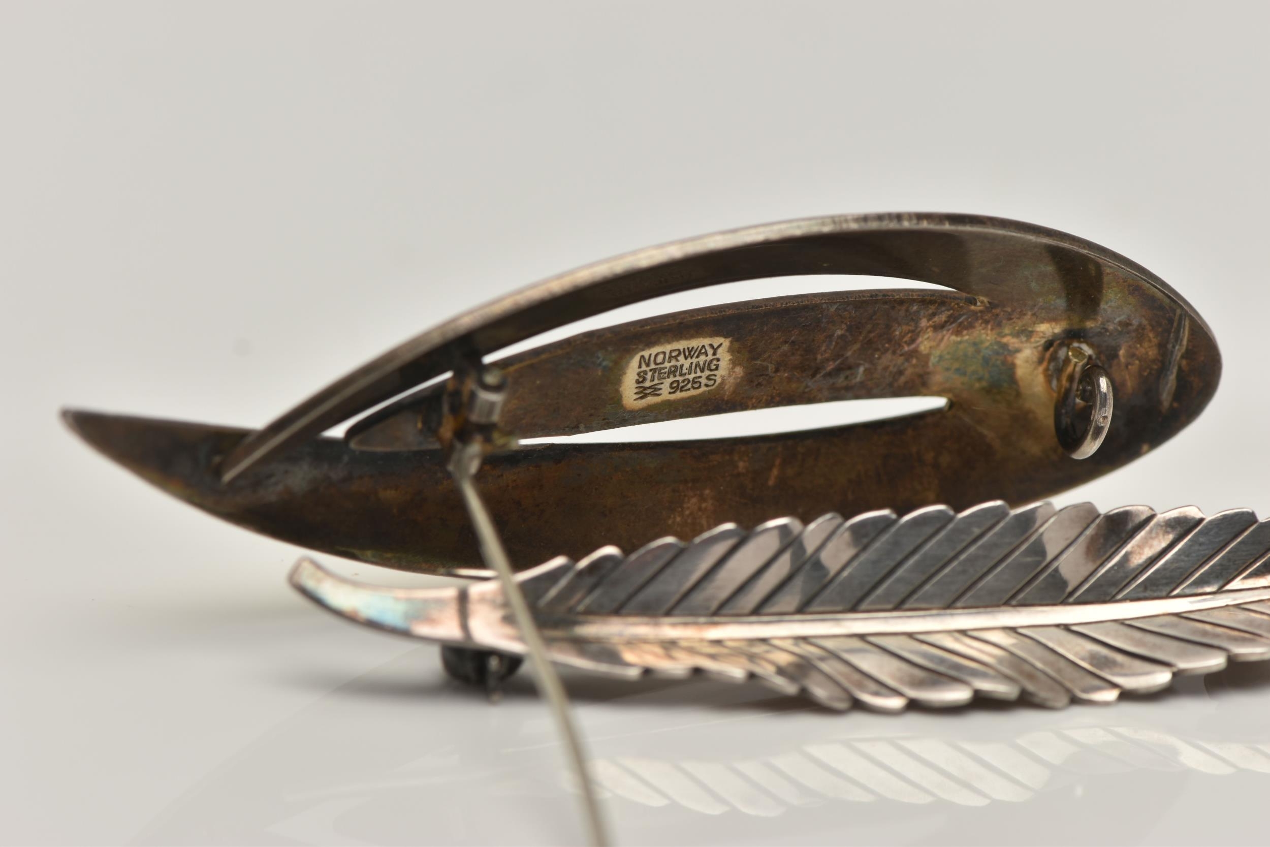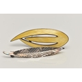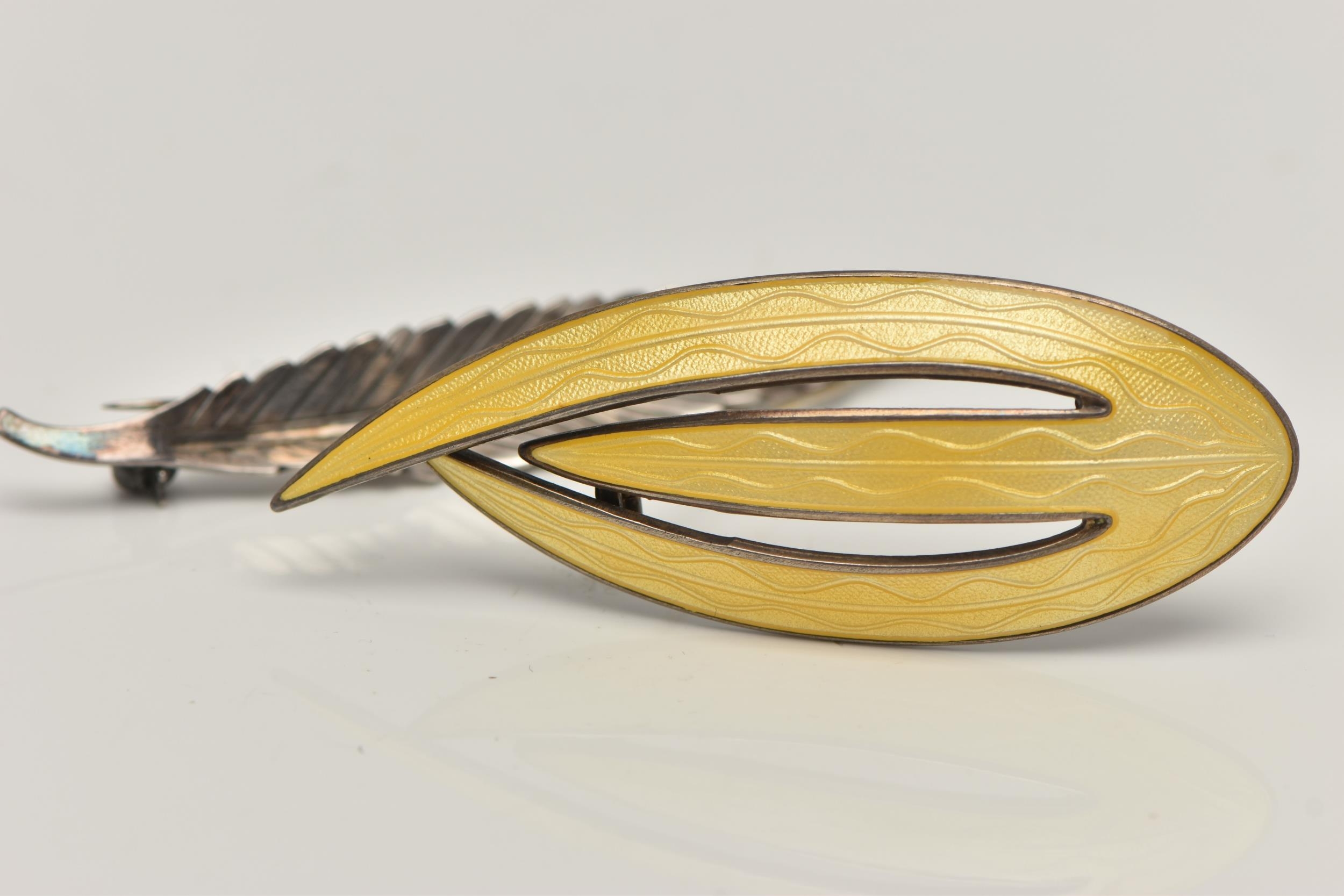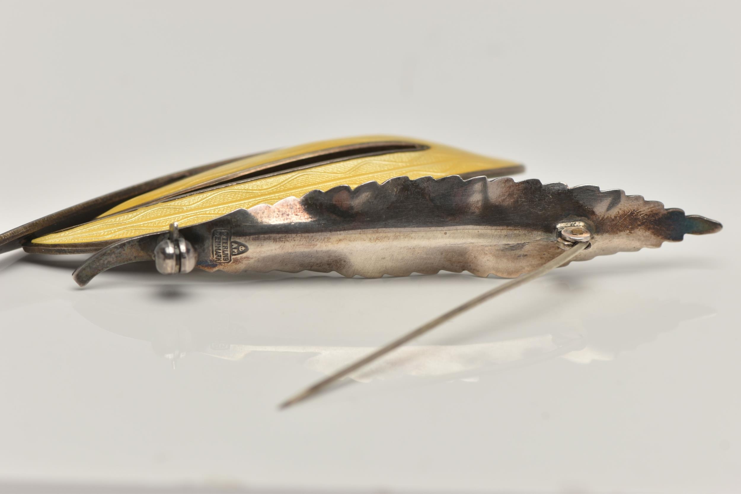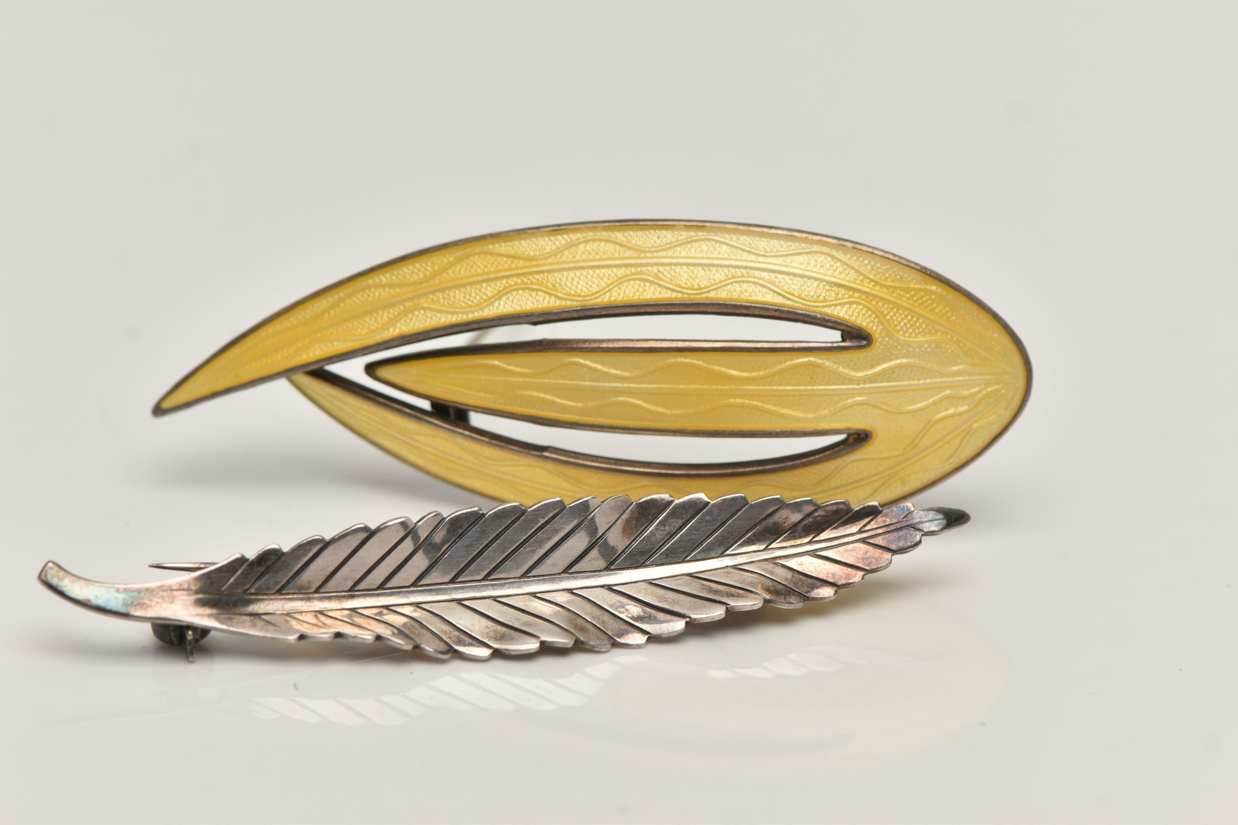 TWO WHITE METAL BROOCHES, the first a 'Askel Holmsen' brooch with yellow guilloche enamel detail, stamped 'Norway Sterling 925S' makers mark for Askel Holmsen, approximate gross weight 12.2 grams, together with a 'Anton Michelson' leaf brooch stamped 'Sterling Denmark' with the makers mark for Anton Michelson, approximate gross weight 4.5 grams, (condition report: general moderate wear, no visible chipping to enamel, overall condition good)