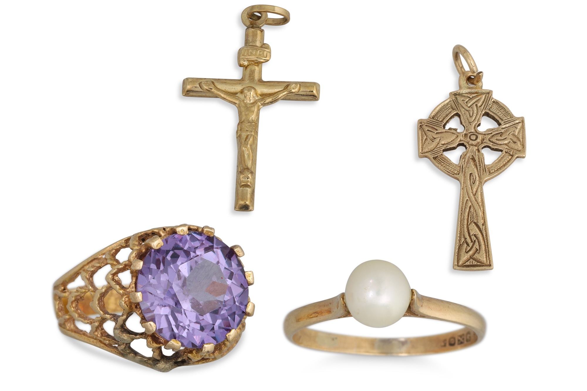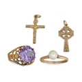 A COLLECTION OF GOLD ITEMS, to include two dress rings, two religious pendants, 8.1 g total