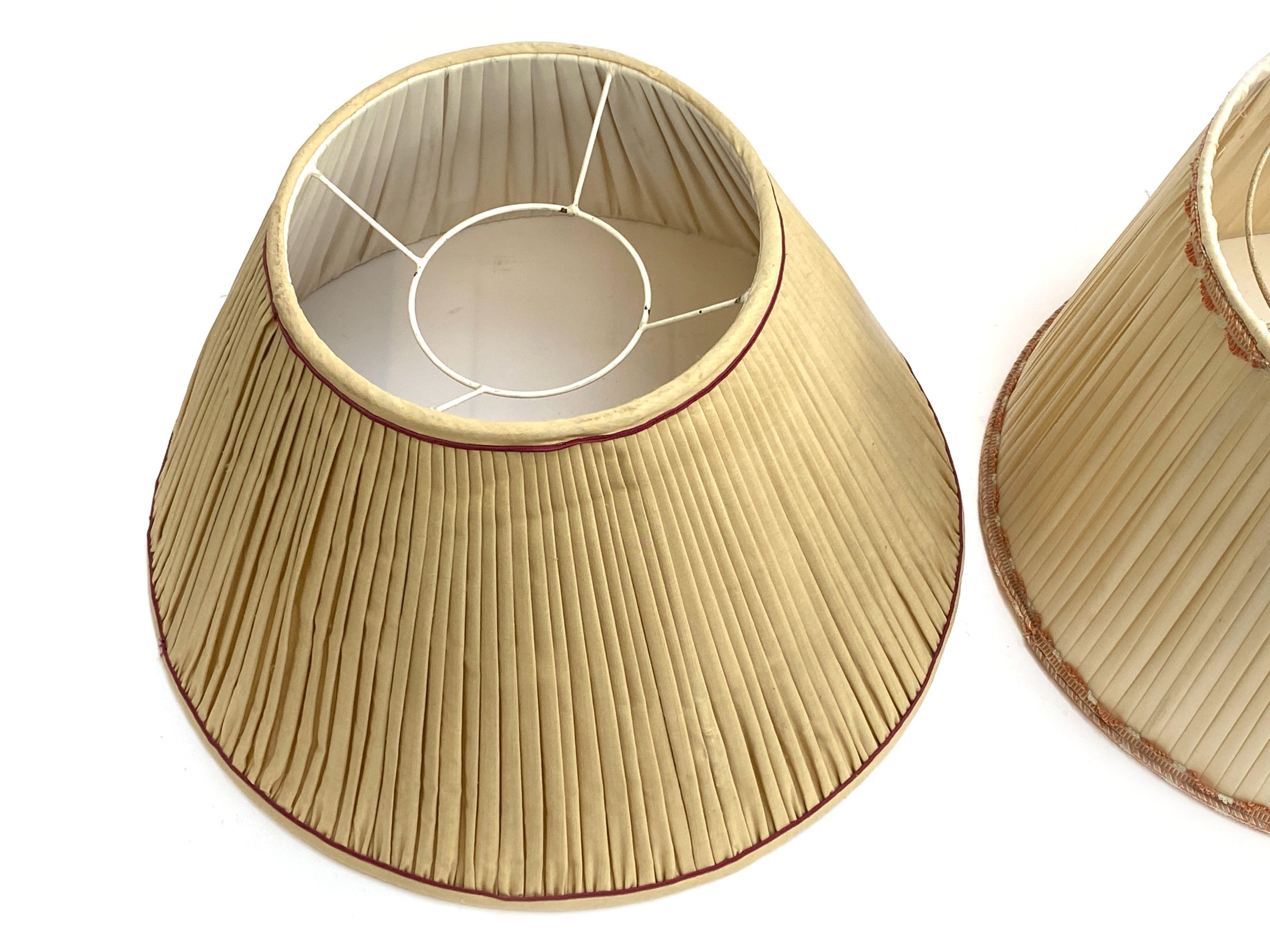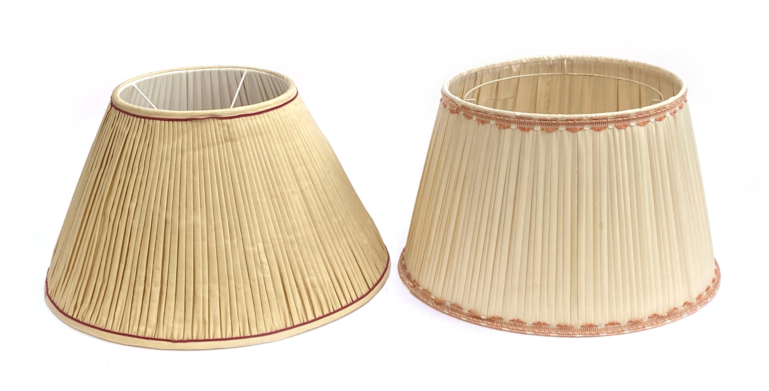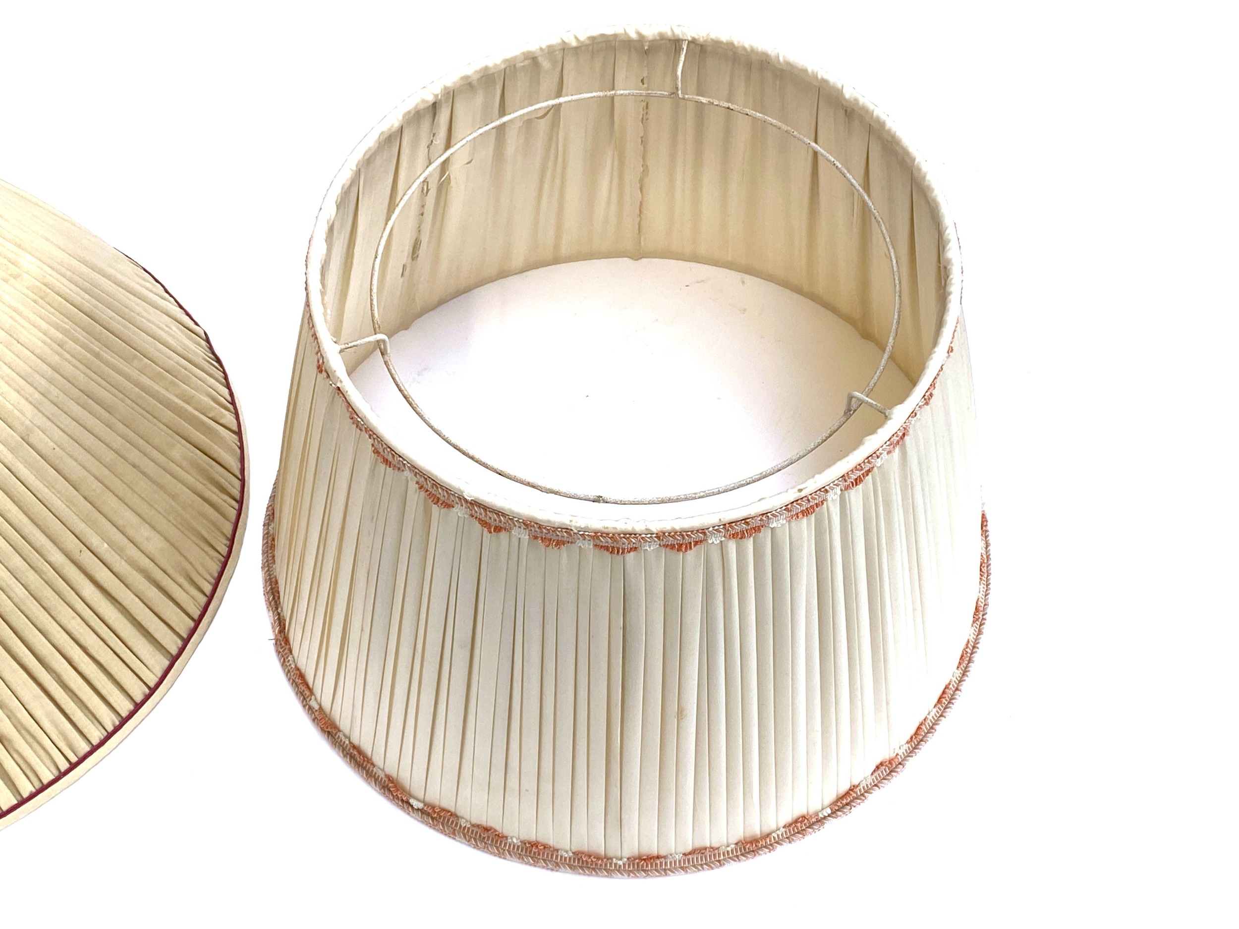 A large pleated silk shade with red stitched detail, 46cmD (23cm at top), together with one other, 42cmD (30cm at top)