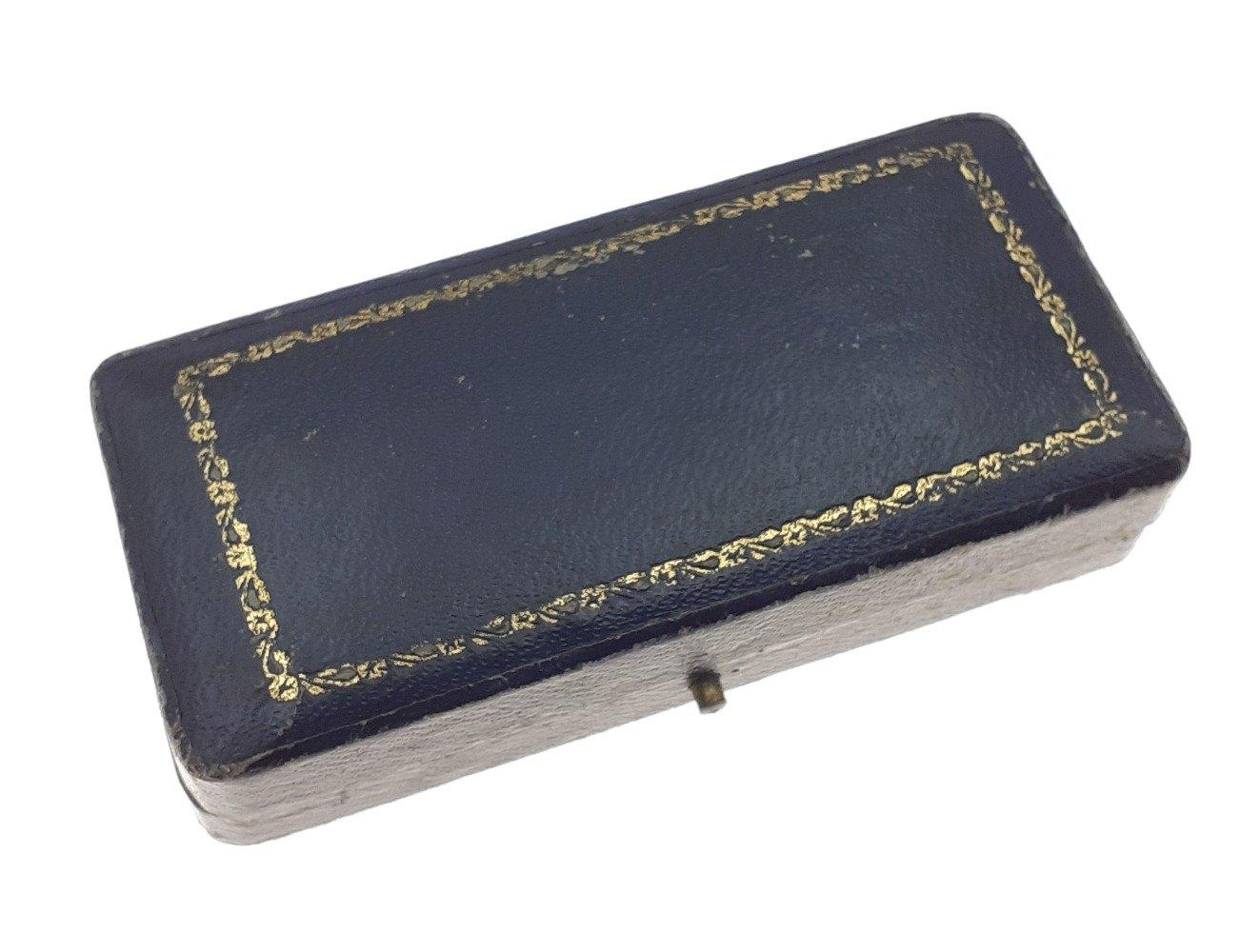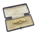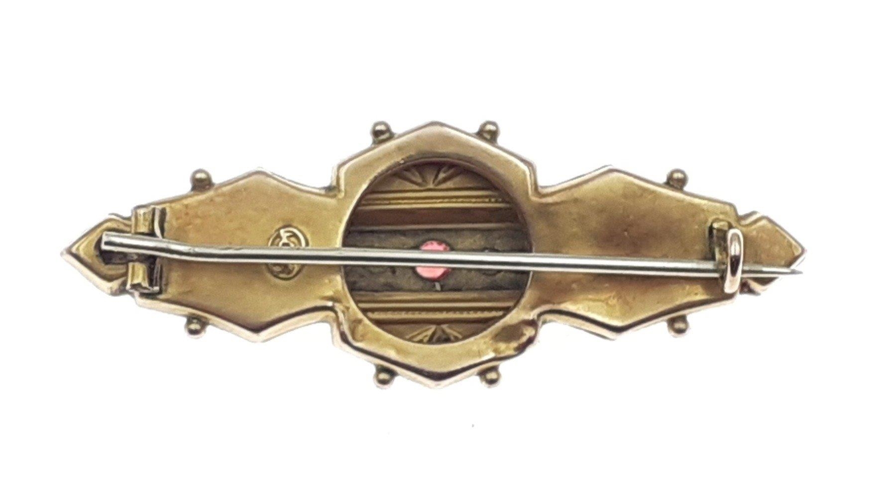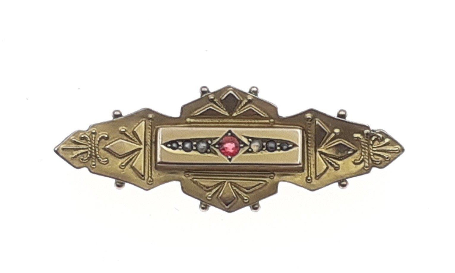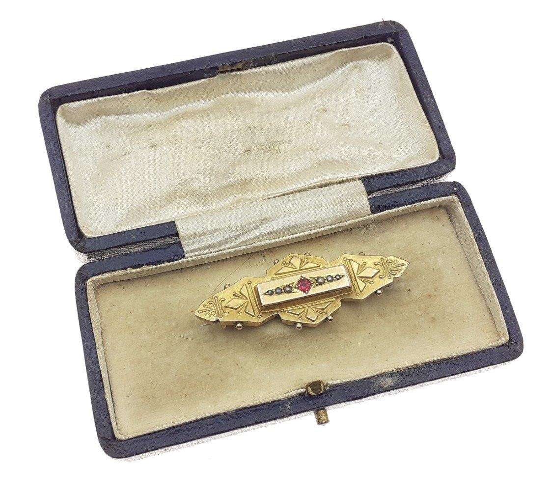 A boxed 9c stamped turn of the 20th century brooch with garnet stone centred with seed pearls - gross weight 2.72g approx - dimensions 5cm wide x 2cm height approx