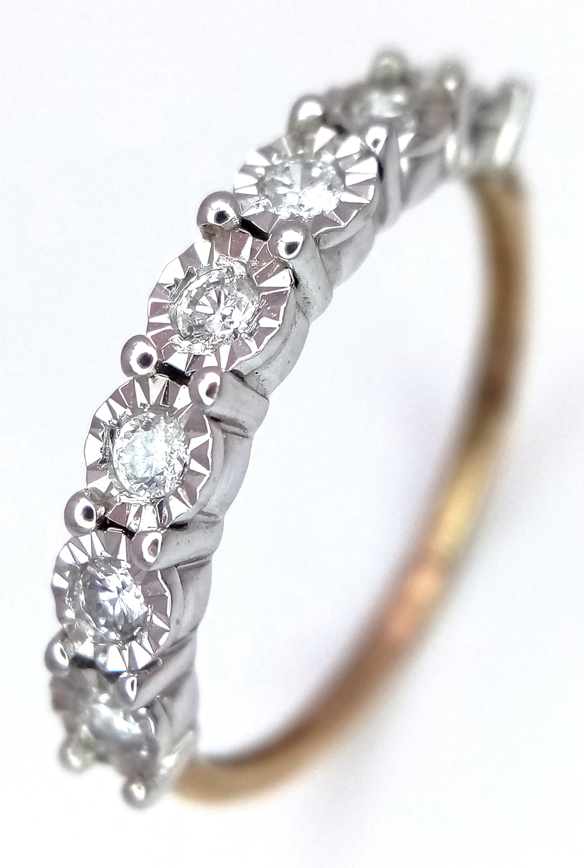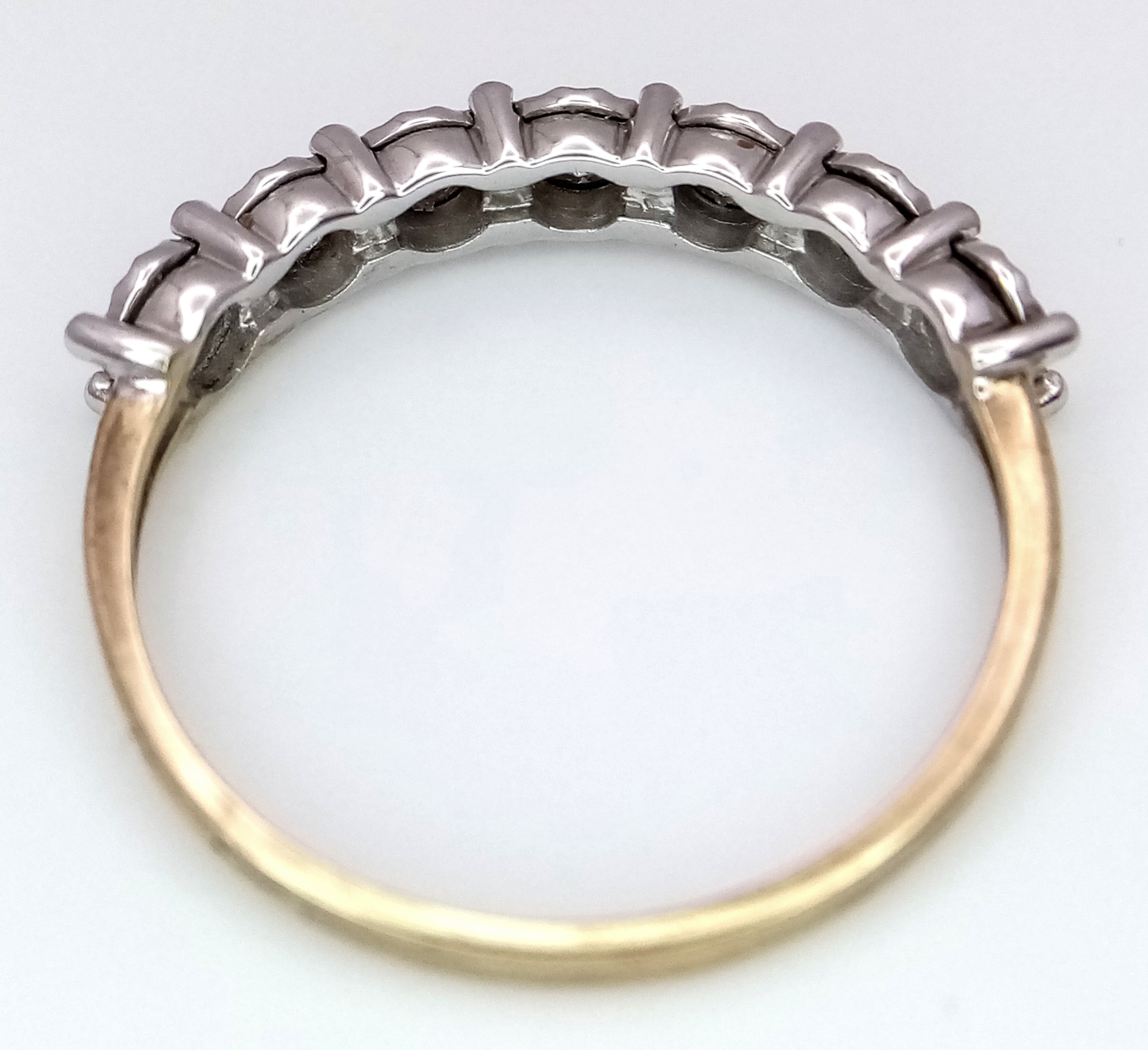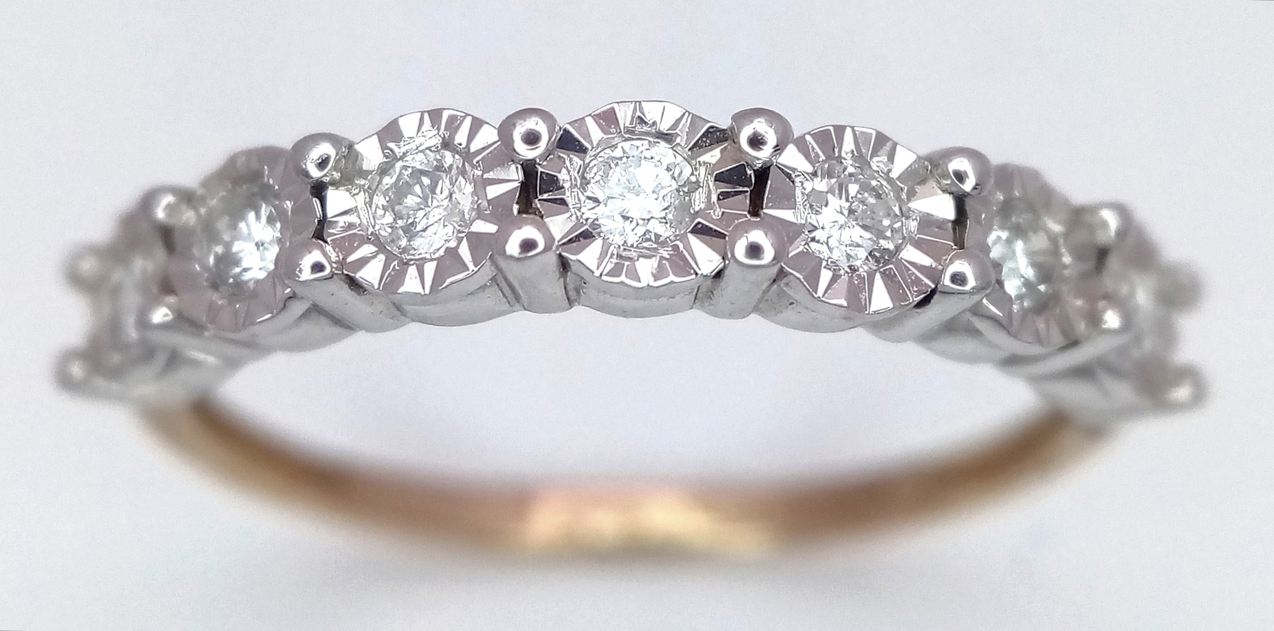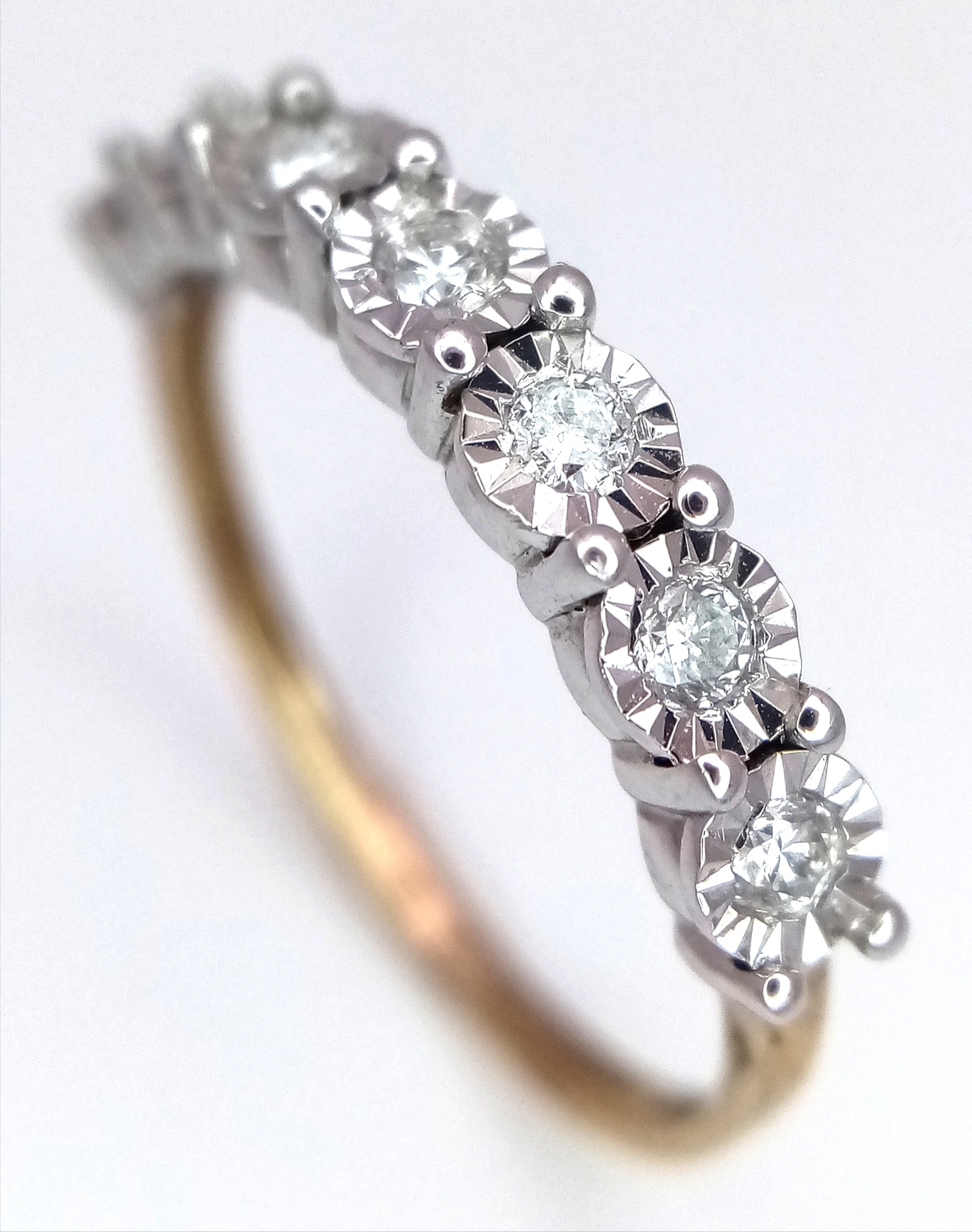 A 9K Gold Seven Stone Diamond Ring. Approximately 0.215ctw, G - H colour diamonds. Size O, 1.5g total weight. Ref: 16/1756