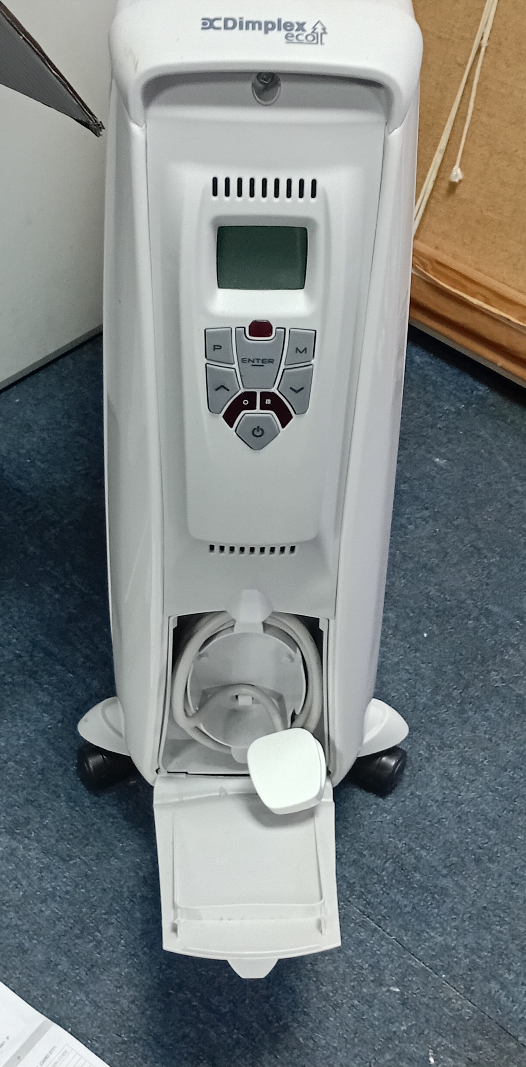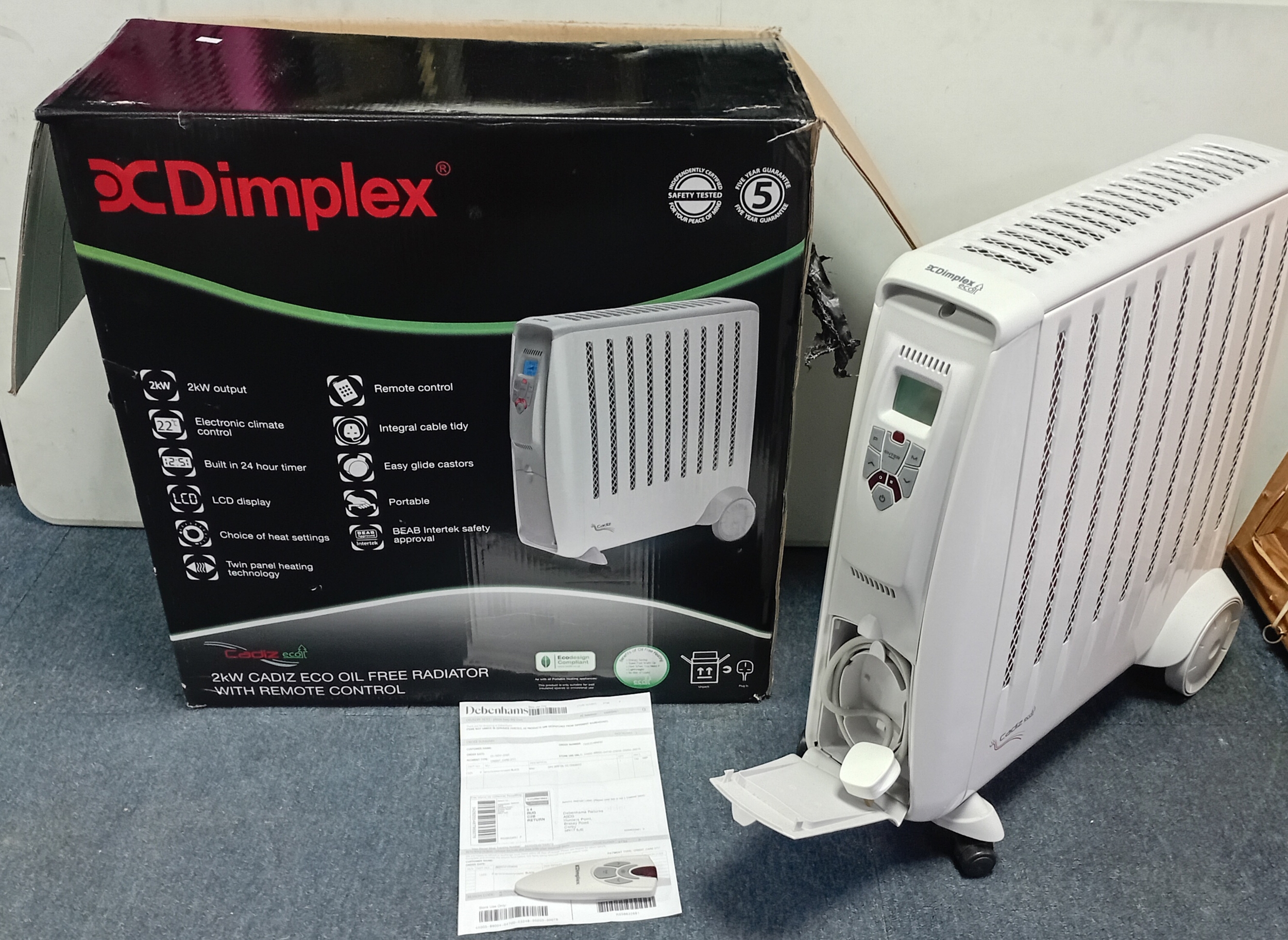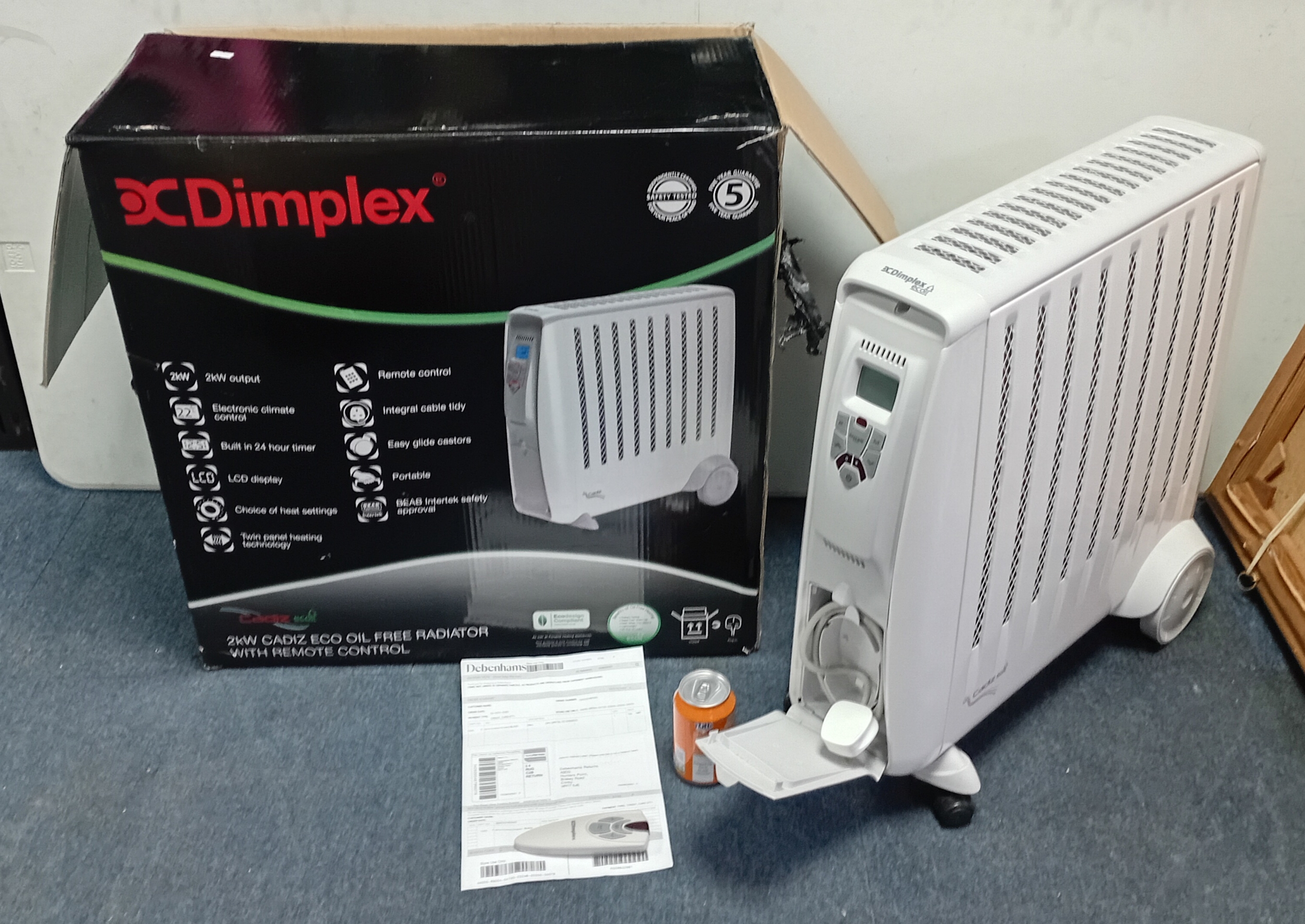 A Dimplex 2kW Cadiz Eco Oil Free Radiator with remote in original box, turns on and working. 61cm x 61cm x 15cm.