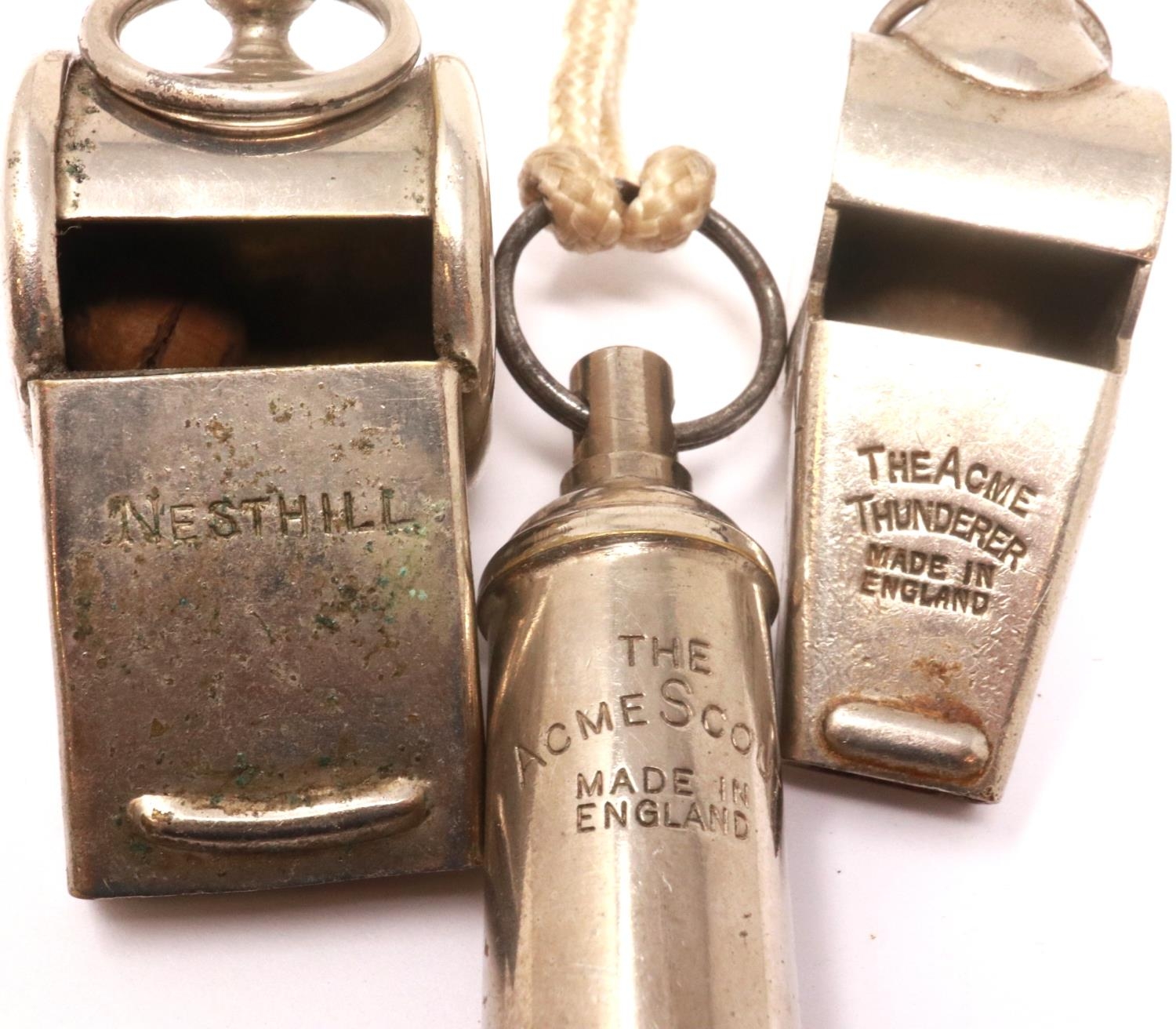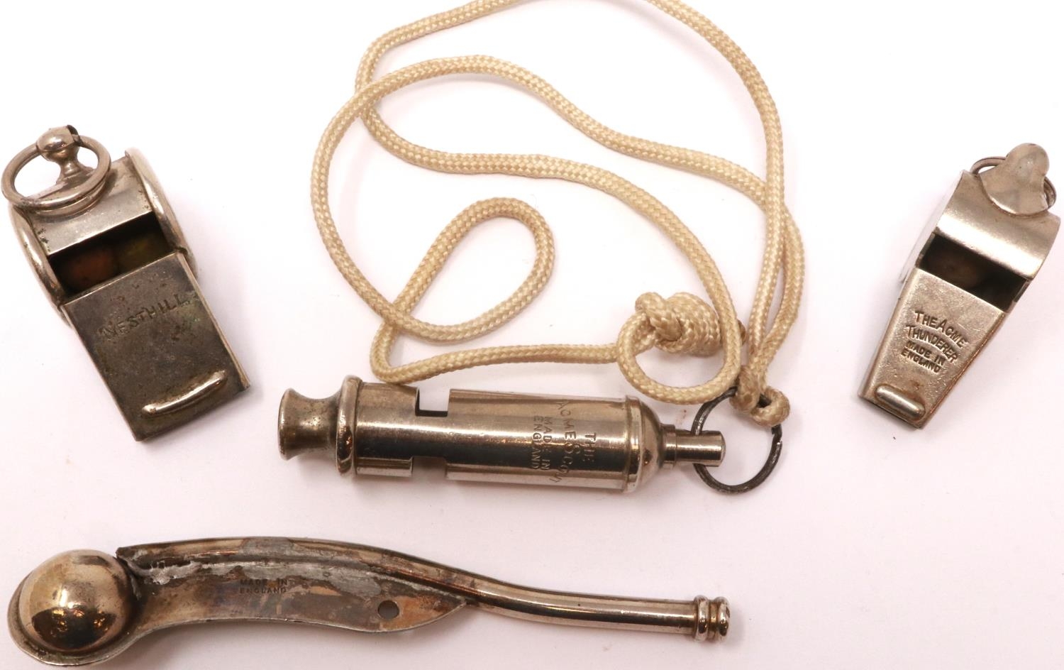 Mixed whistles including Acme and Nesthill, with a Bosuns whistle (4). P&P Group 1 (£14+VAT for the first lot and £1+VAT for subsequent lots)