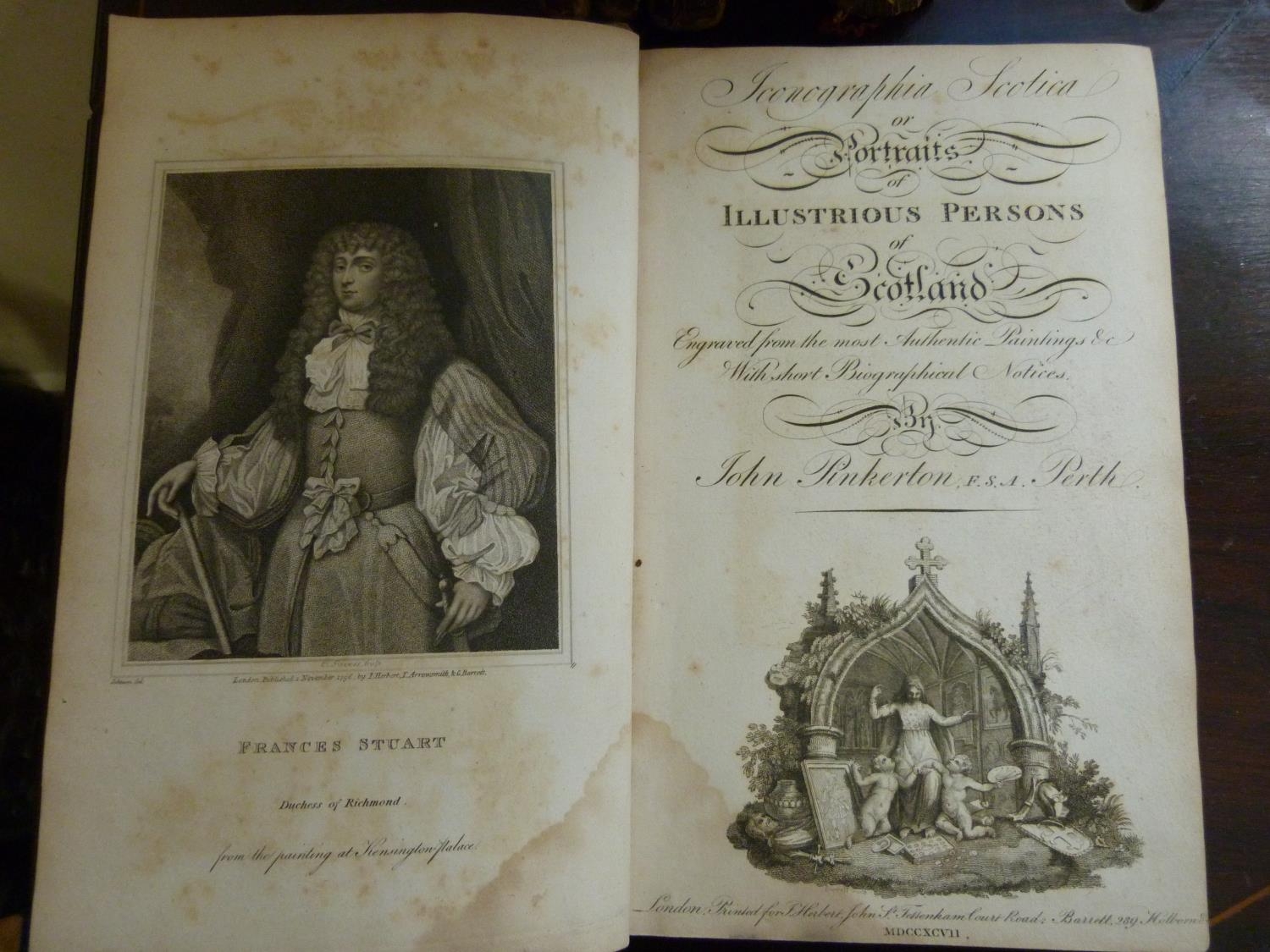PINKERTON JOHN. Portraits of Illustrious Persons of Scotland. Eng. frontis & plates. Red morocco gilt, rubbed, some internal damp mkg. & browning. 1797; also An Atlas to Guthrie's Geographical Grammar, hand col. eng. double page maps, some fldg., 1818 & 3 other vols. (5).