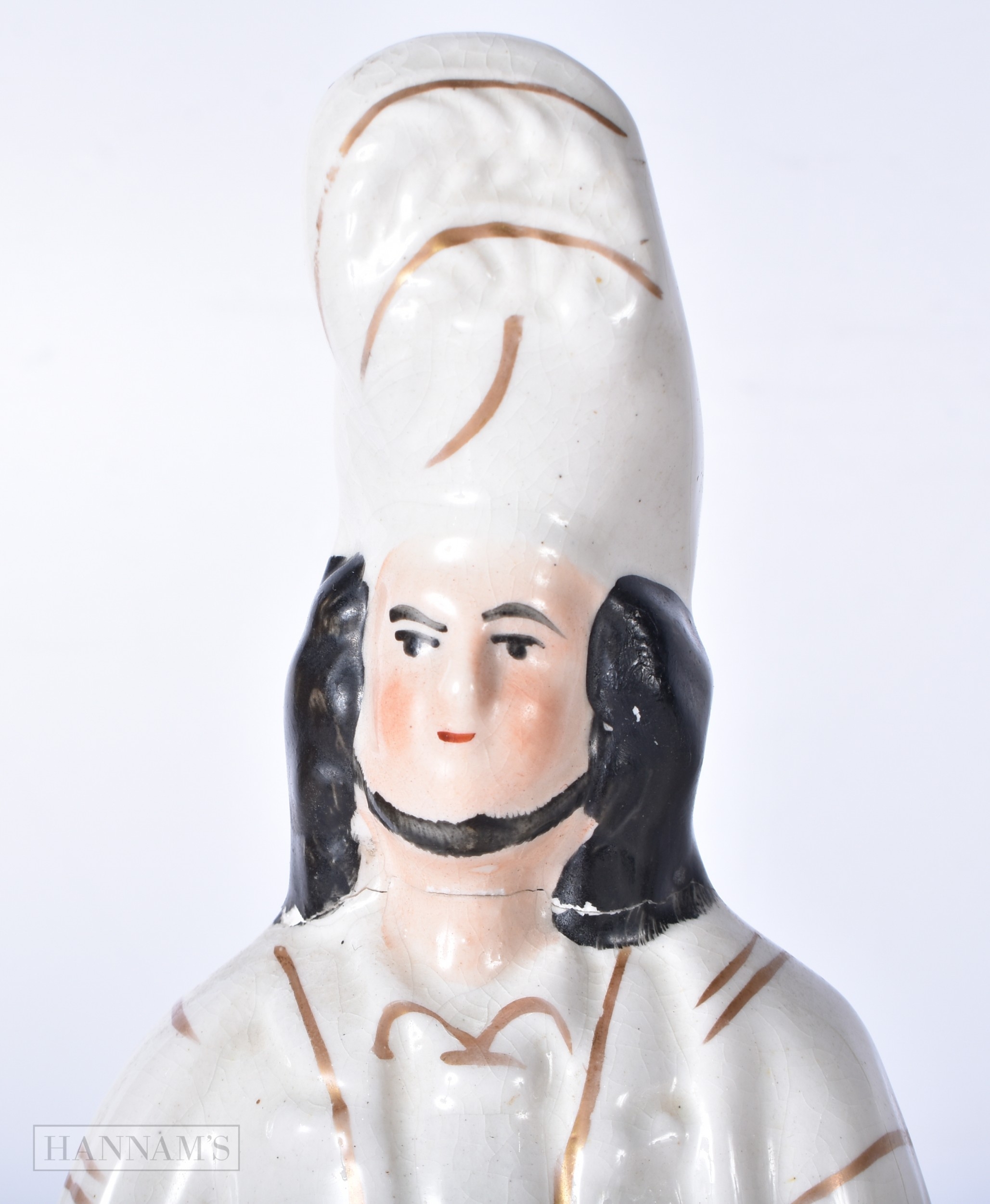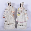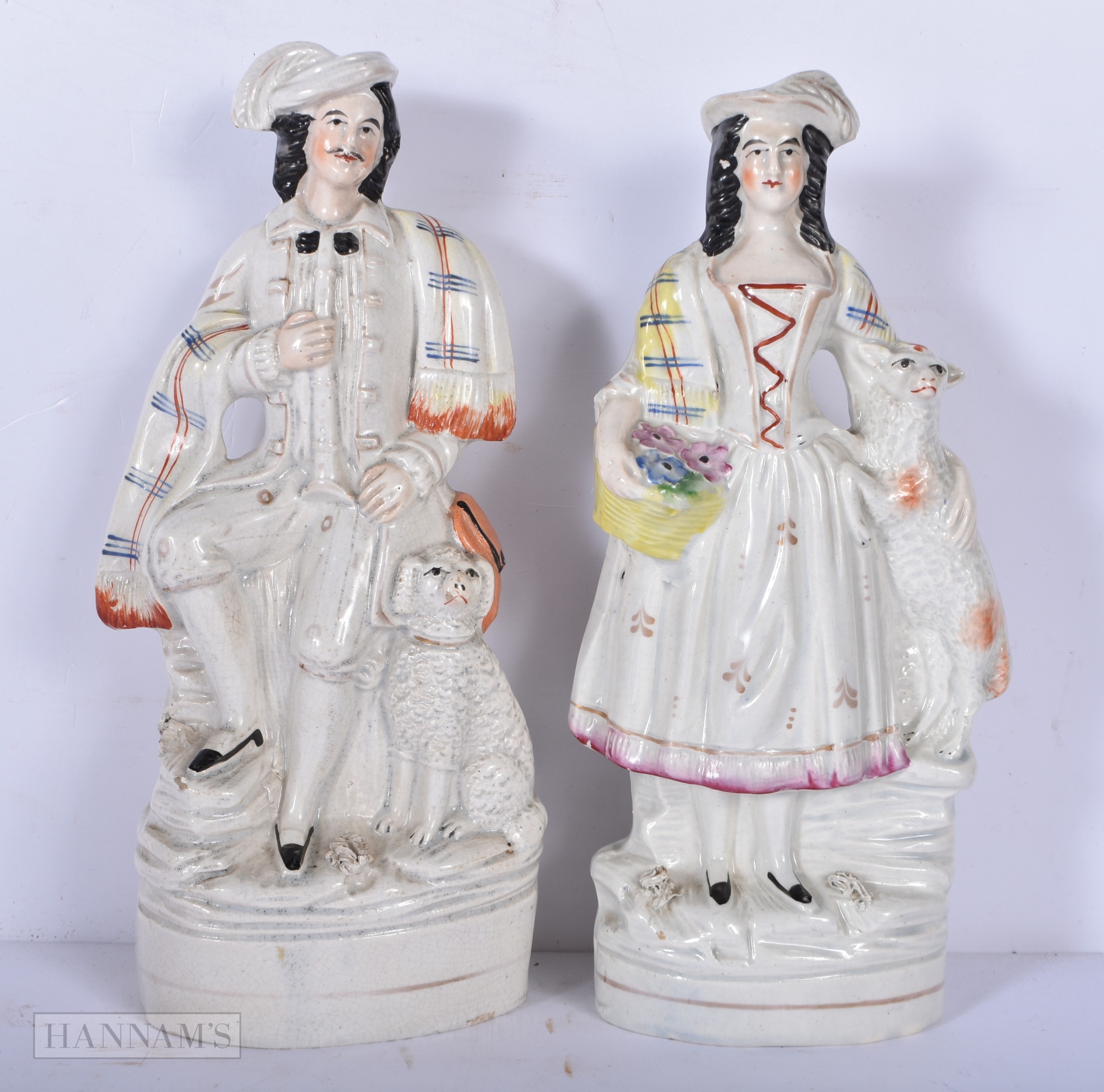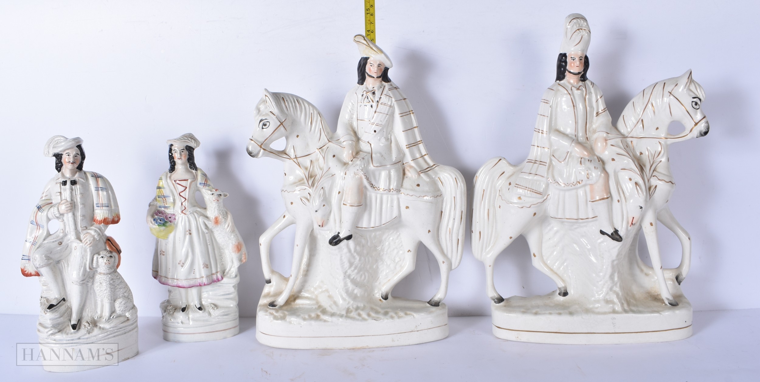A pair of 19th Century Staffordshire porcelain Flat back horse riders together with 2 other flatback figures ,37cm (4)
