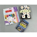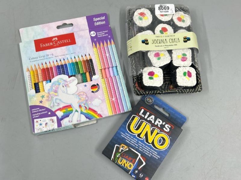 LIAR'S UNO, SUHSI MAKI ROLL SIDEWALK CHALK & FABER-CASTELL UNICORN PENCILS / RRP: 88
