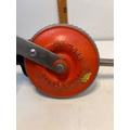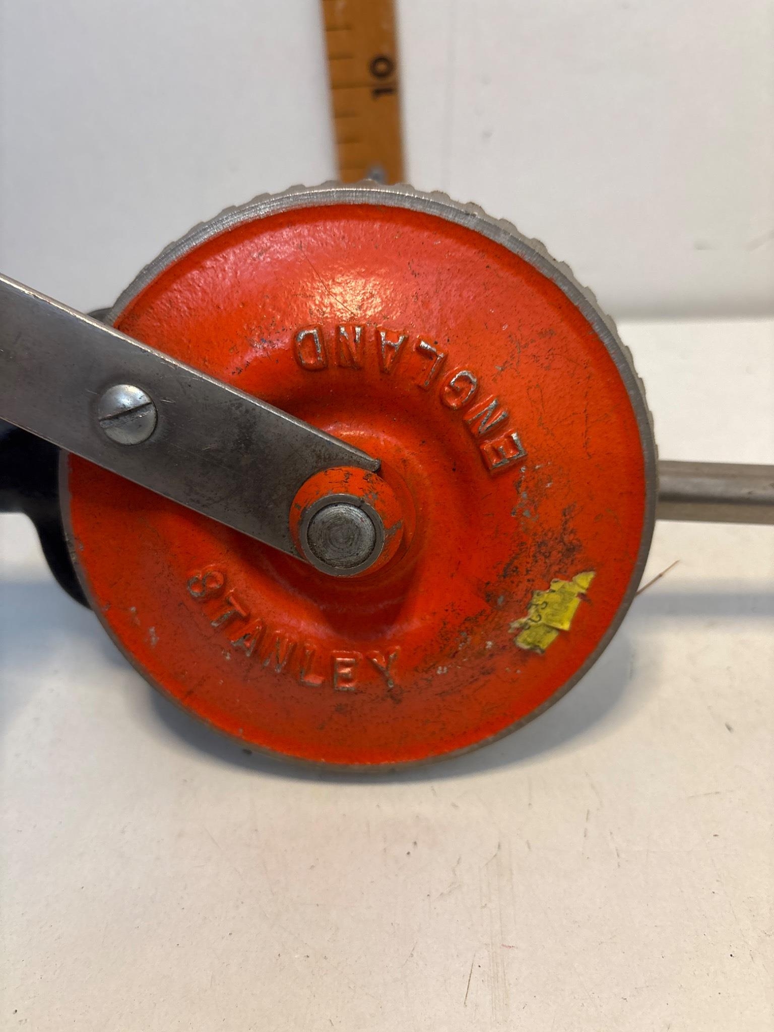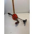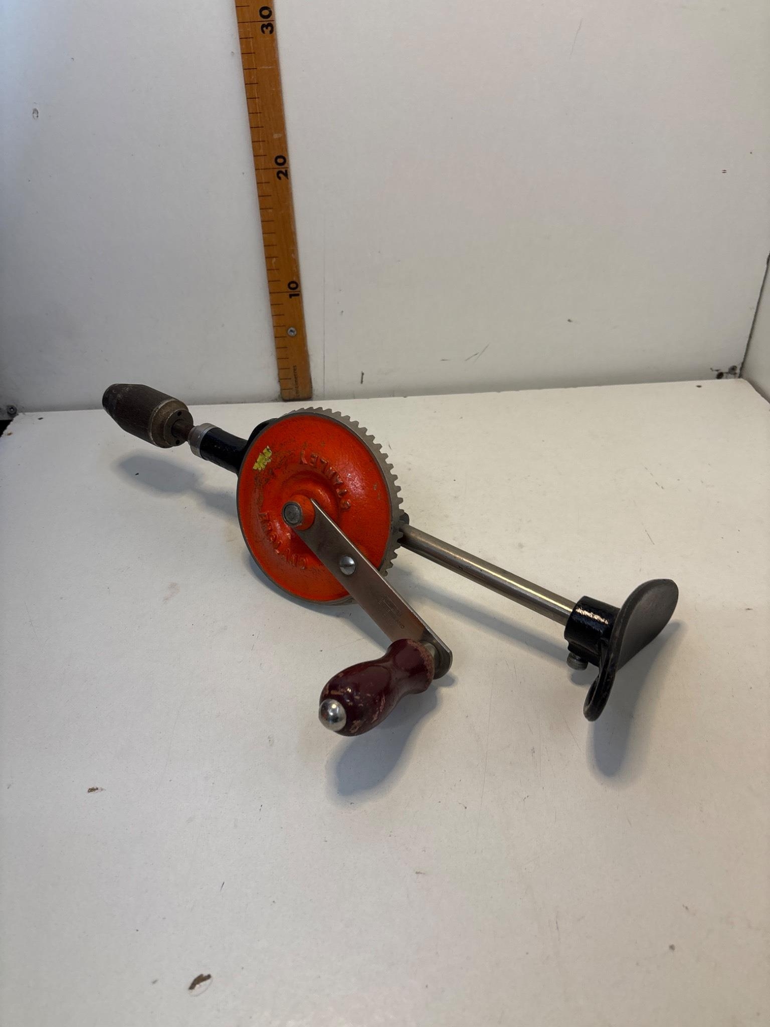 Stanley hand drill made in England with red metal gear housing and wooden handle.