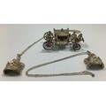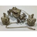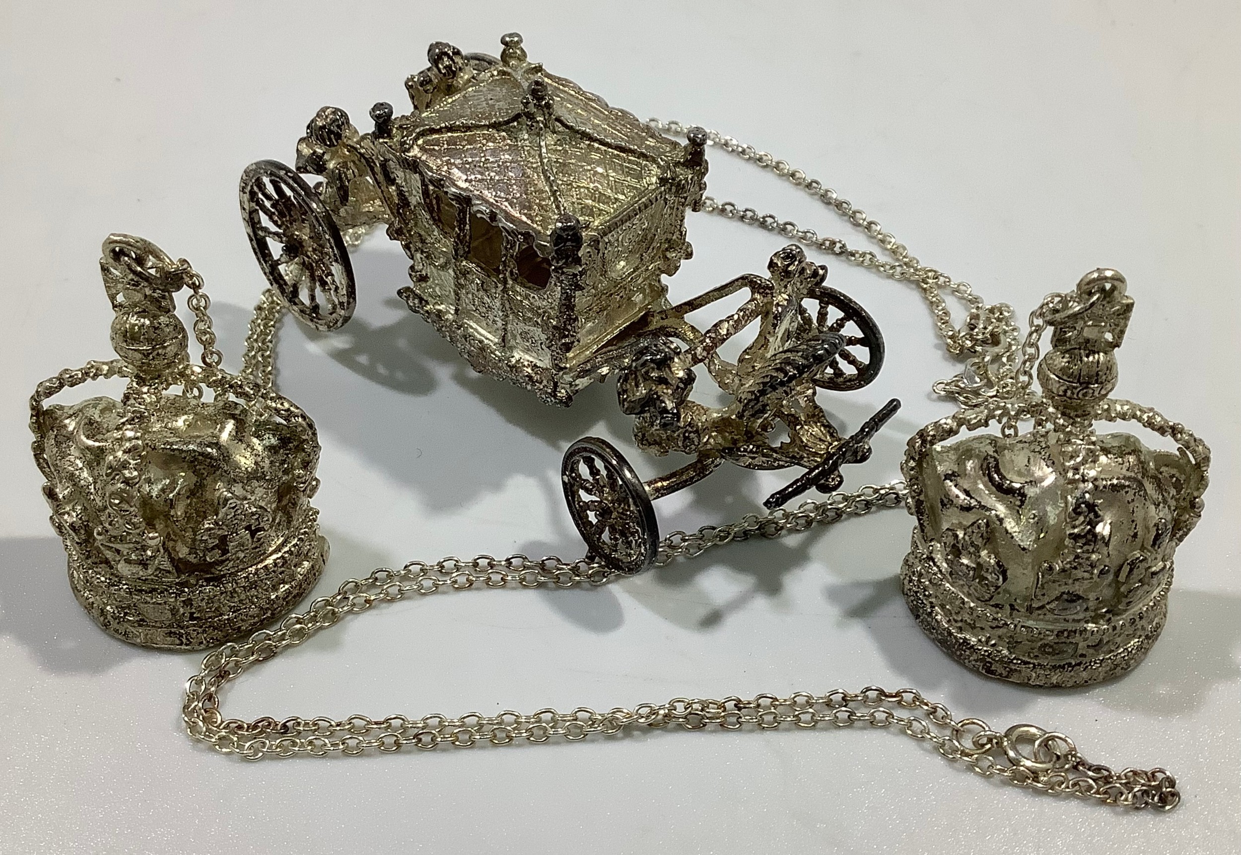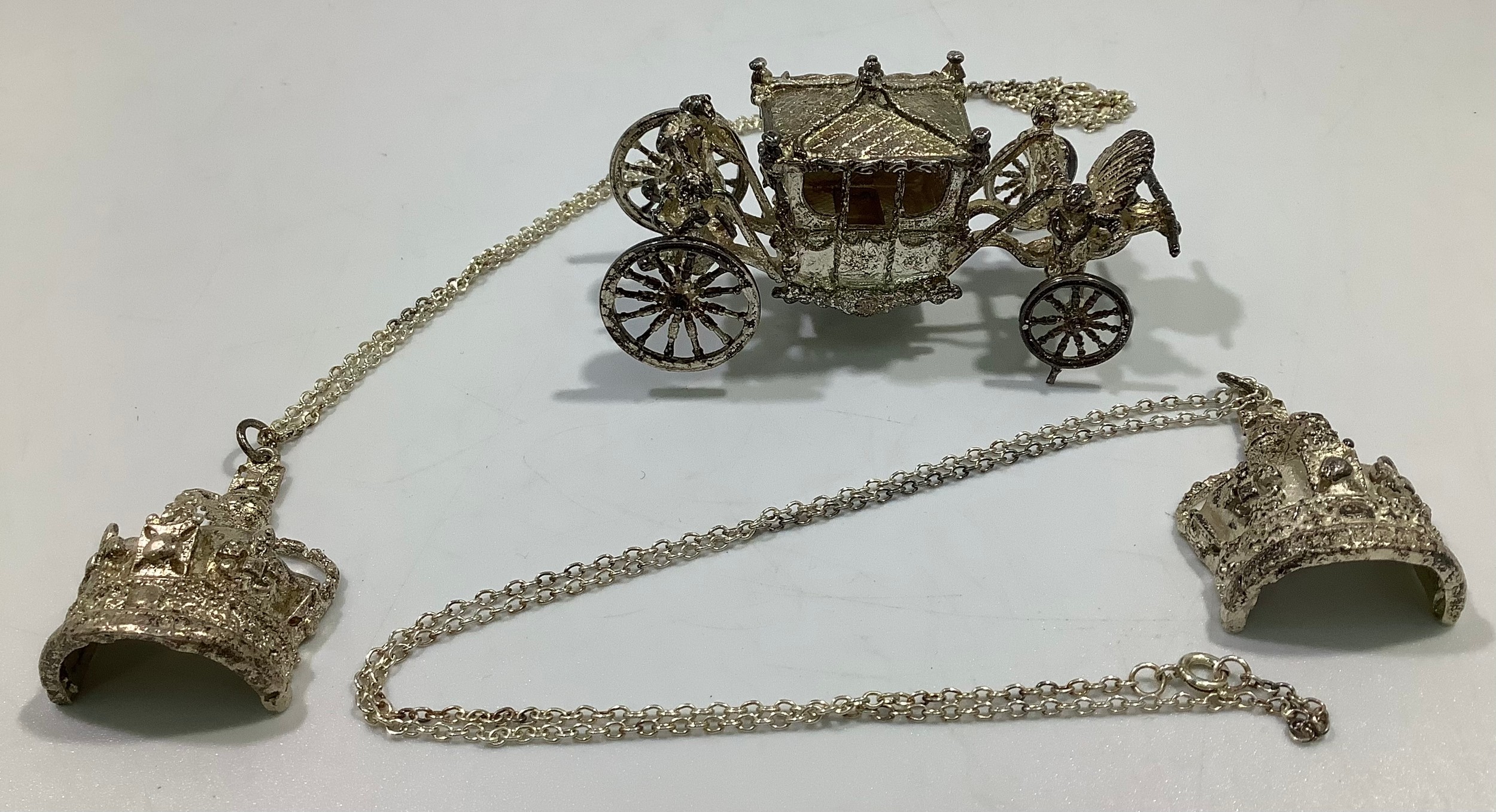 A cast silver model of the British Coronation Carriage and two silver crown pendants on chains, all by Toye, Kenning & Spencer, made to commemorate HRH Queen Elizabeth II silver Jubilee, hallmarked Birmingham, 1977, 7.5cm long, gross weight of lot approximately 3.84ozt