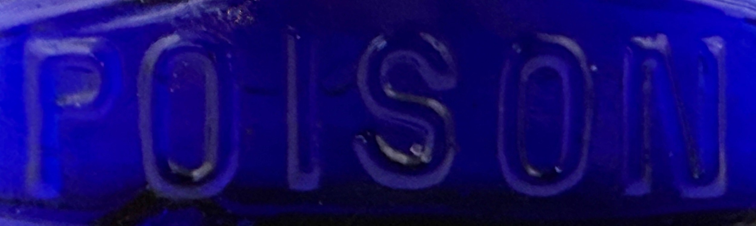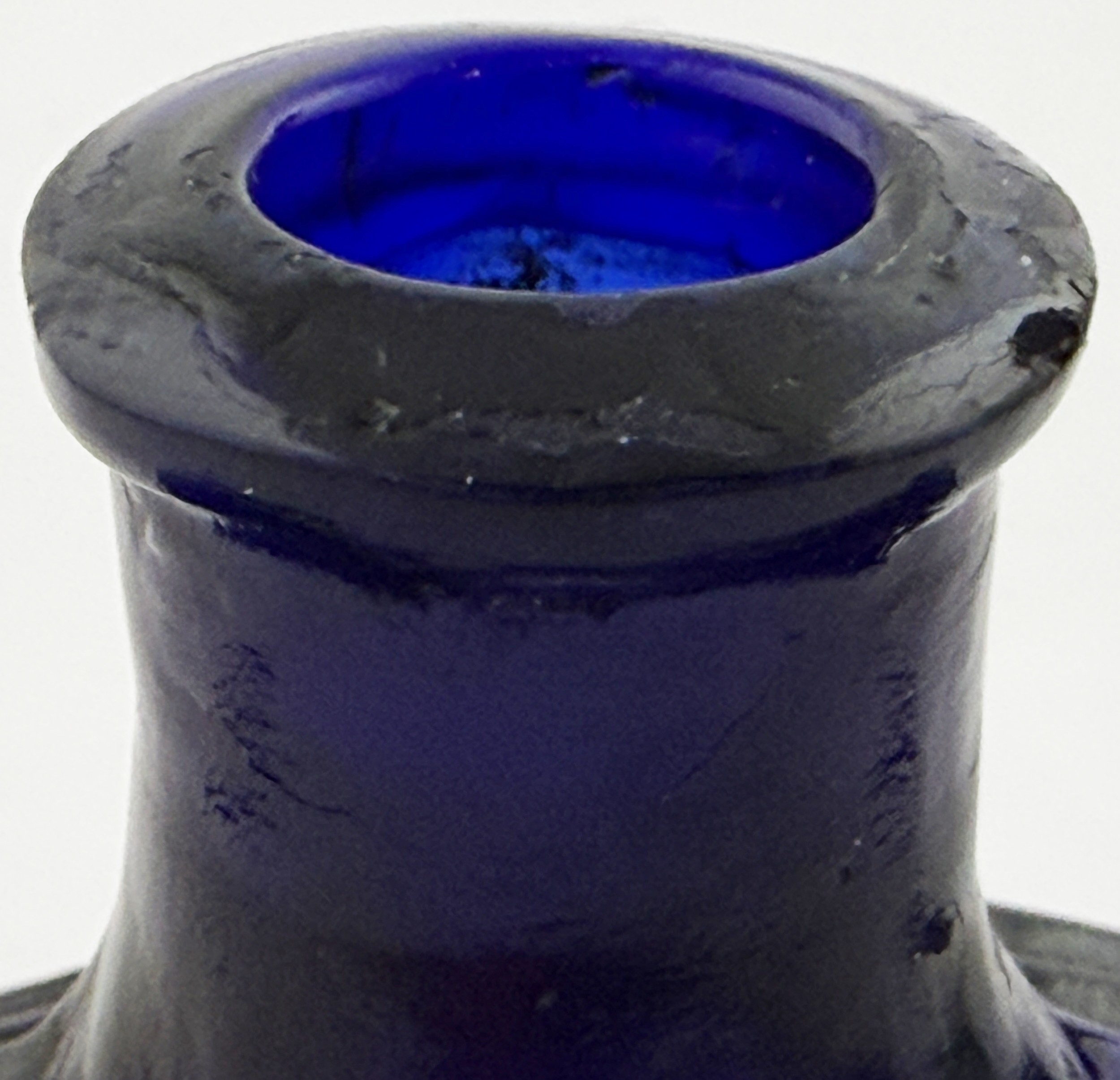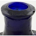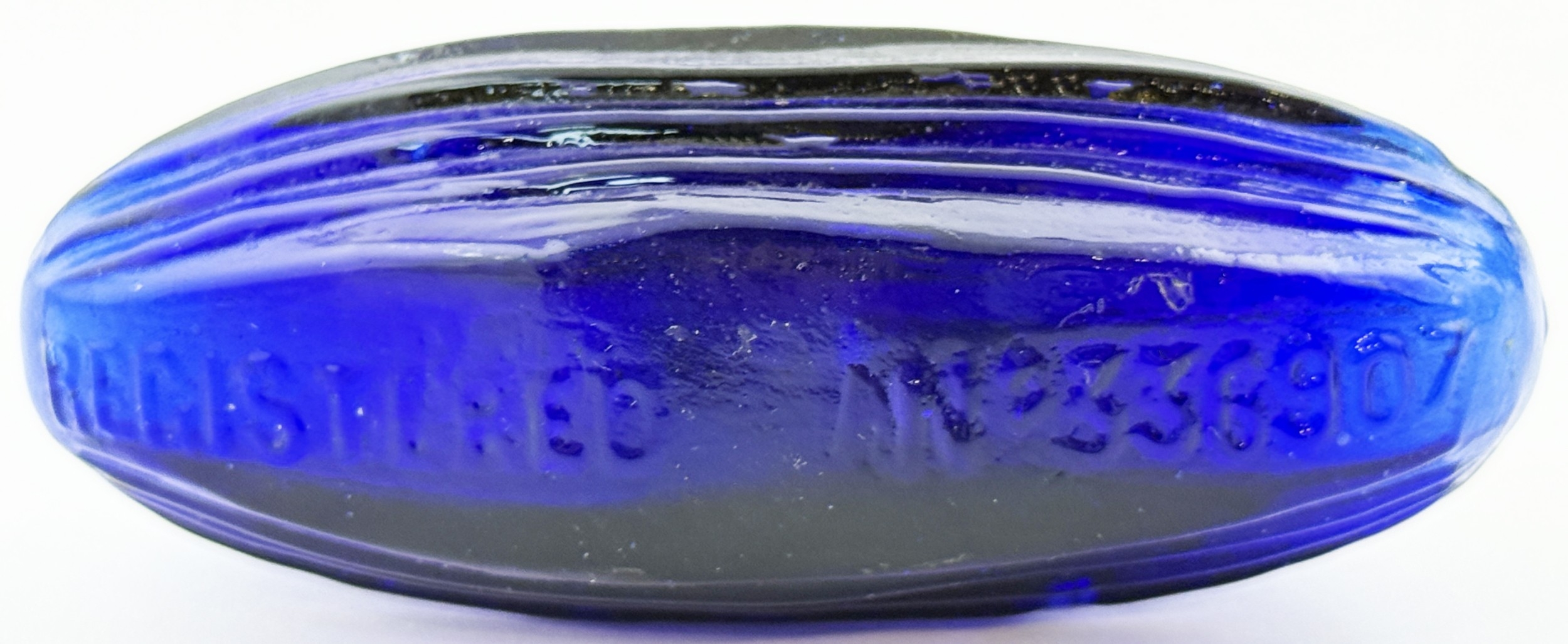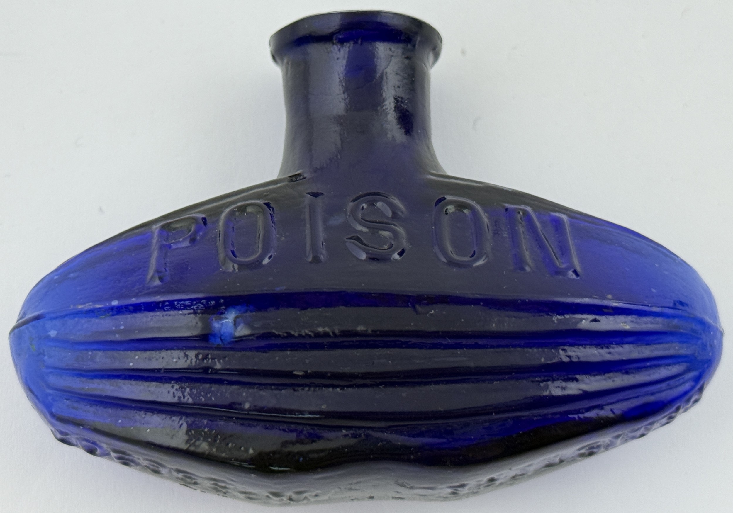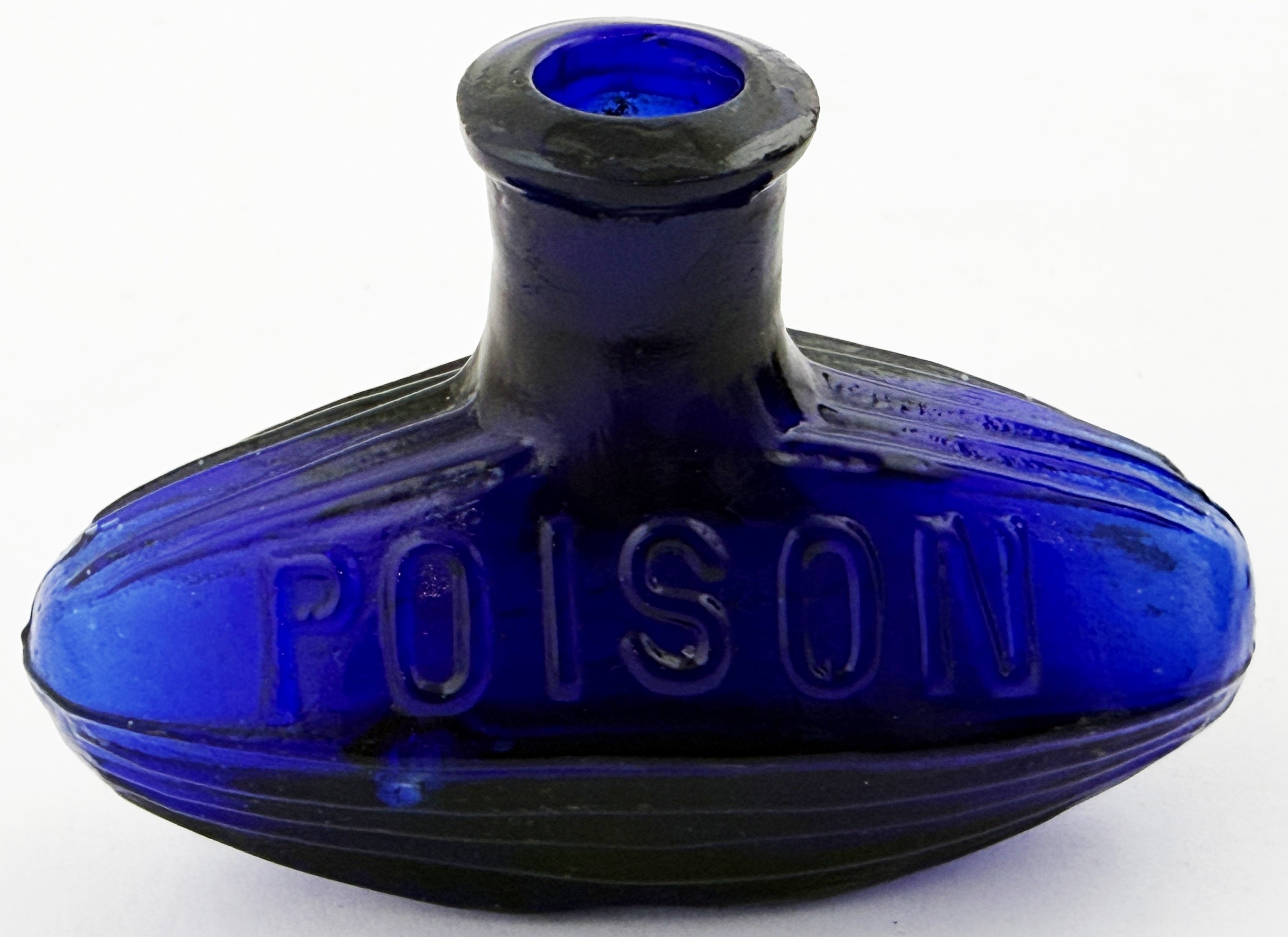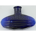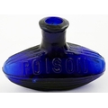 SMALL SIZE SUBMARINE POISON BOTTLE. DP p24. 2.25ins tall. The smallest of the three sizes of this classic UK poison bottle. Cobalt blue, embossed POISON to front & REGISTERED NO 336907 to base. Neck/ lip has a resin repair that has been done exceptionally well. Hard to spot without a black light!
