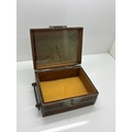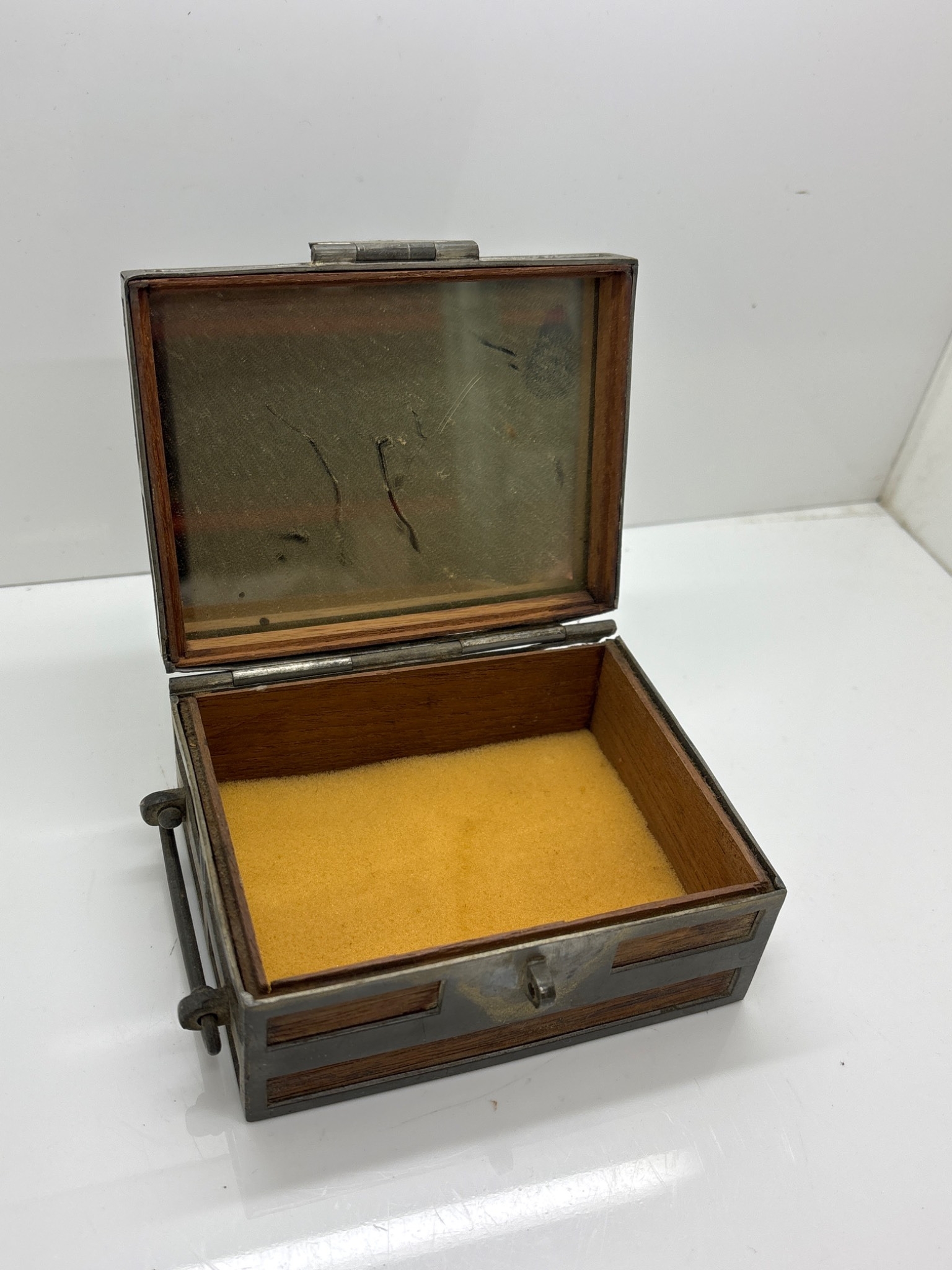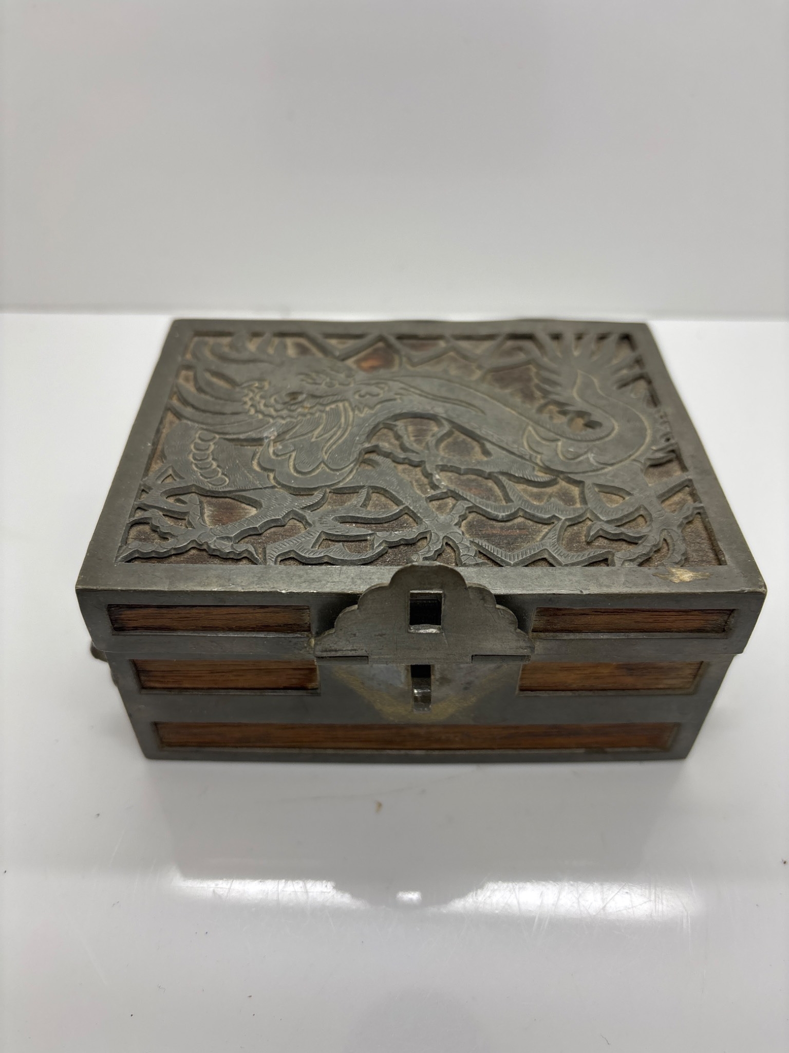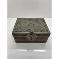Metal and wood box with carved phoenix lid, lined interior, hinged.