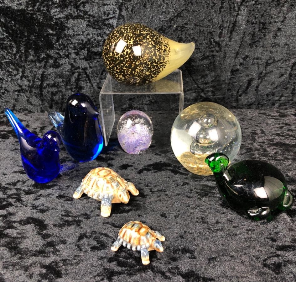 Collection of unusual glass paperweights and two vintage Wade tortoises.