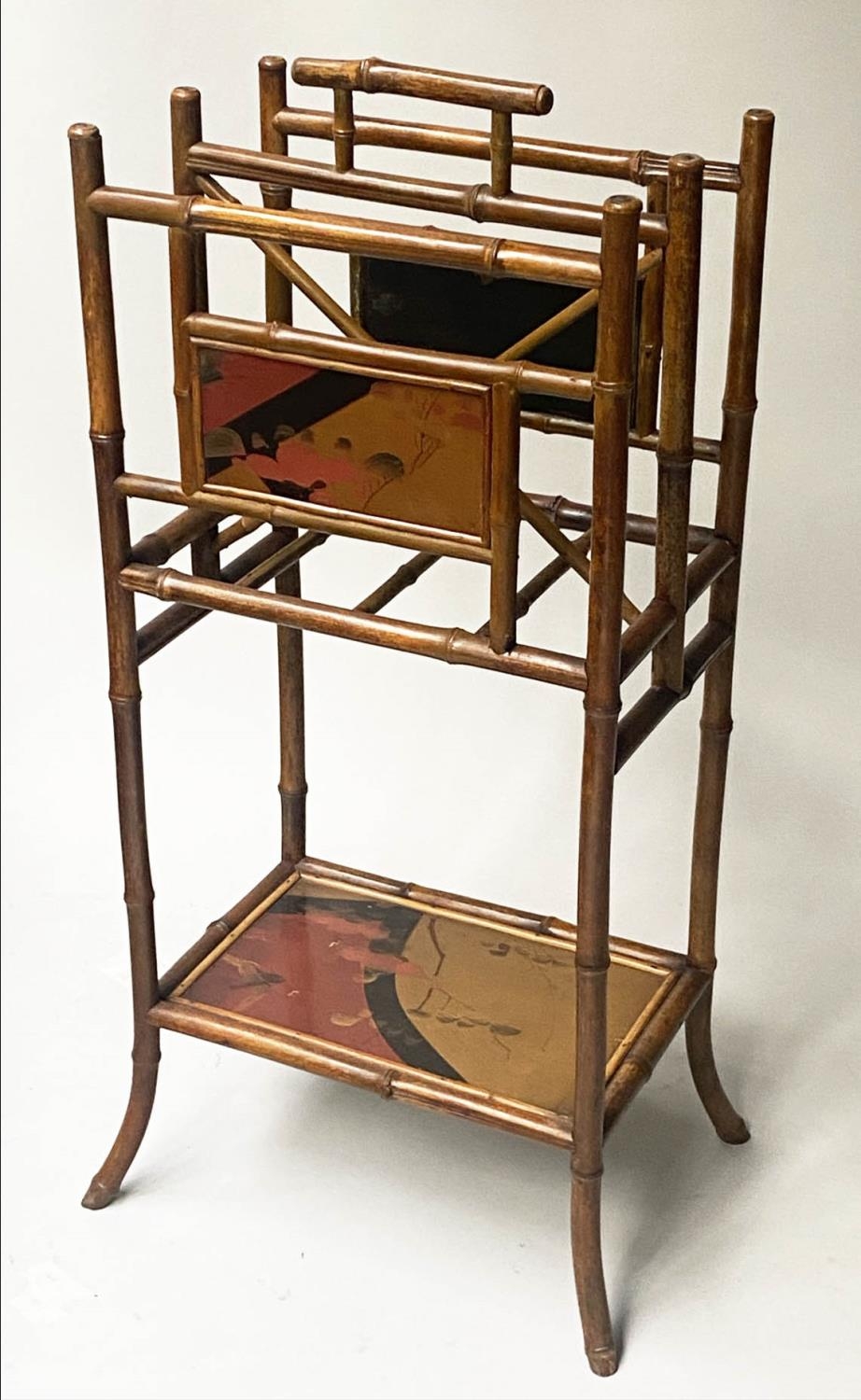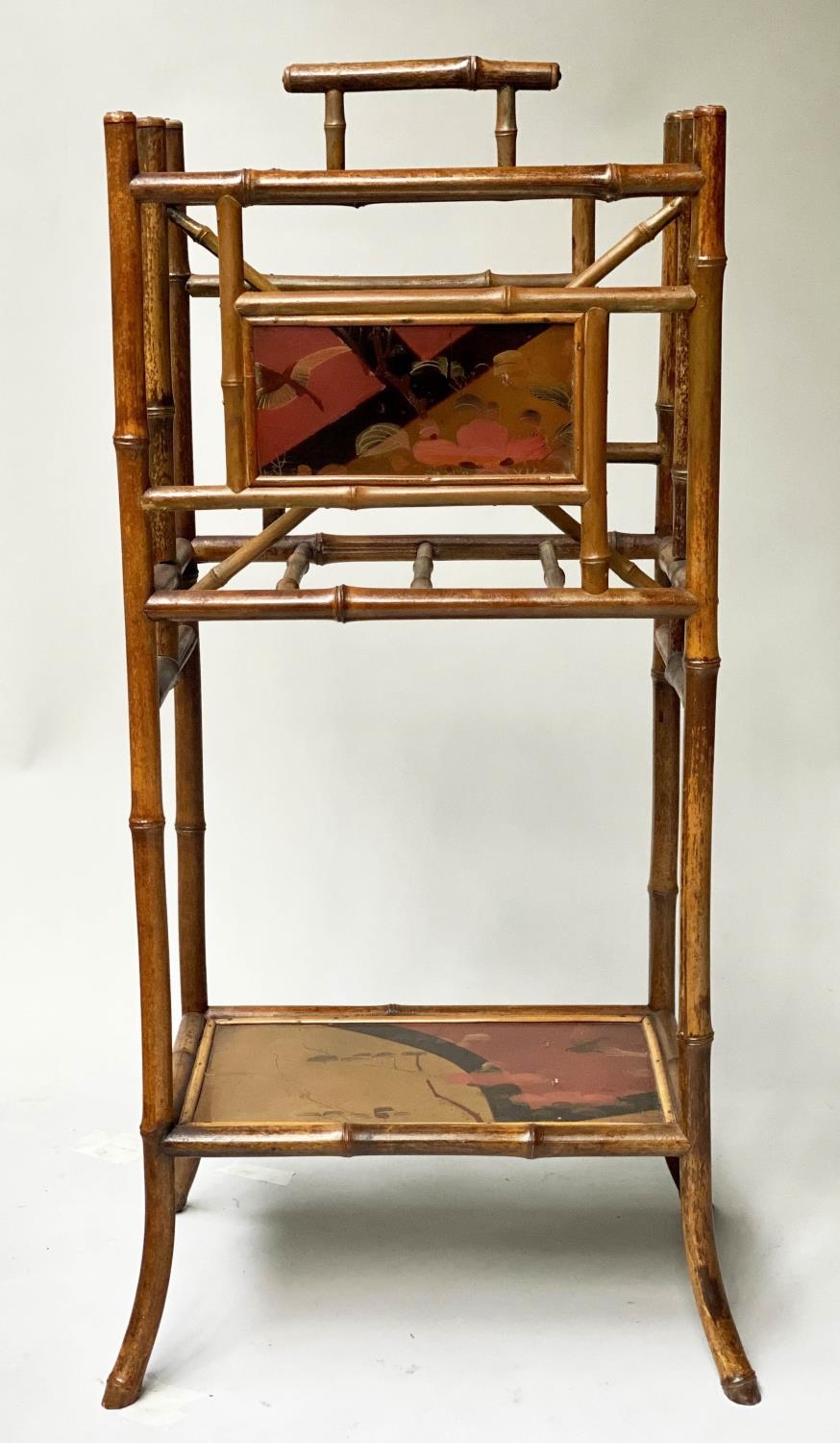 RACK/SIDE TABLE, 19th century bamboo and scarlet and gilt Japanese lacquered panels with dividers and undertier, 86cm H x 38cm x 24cm.
