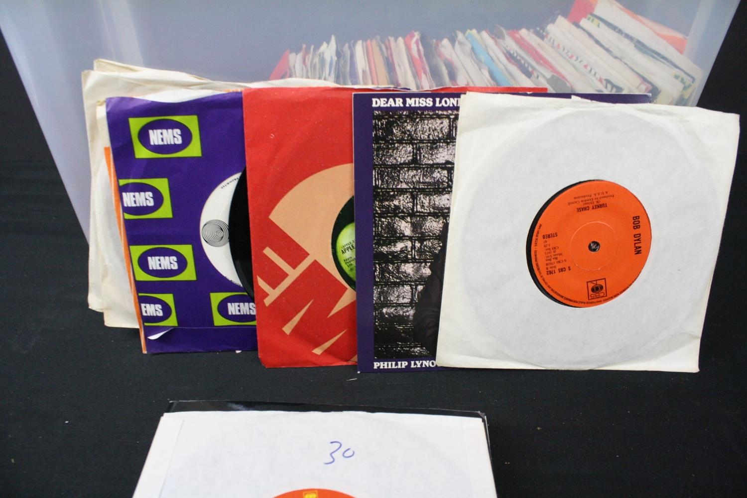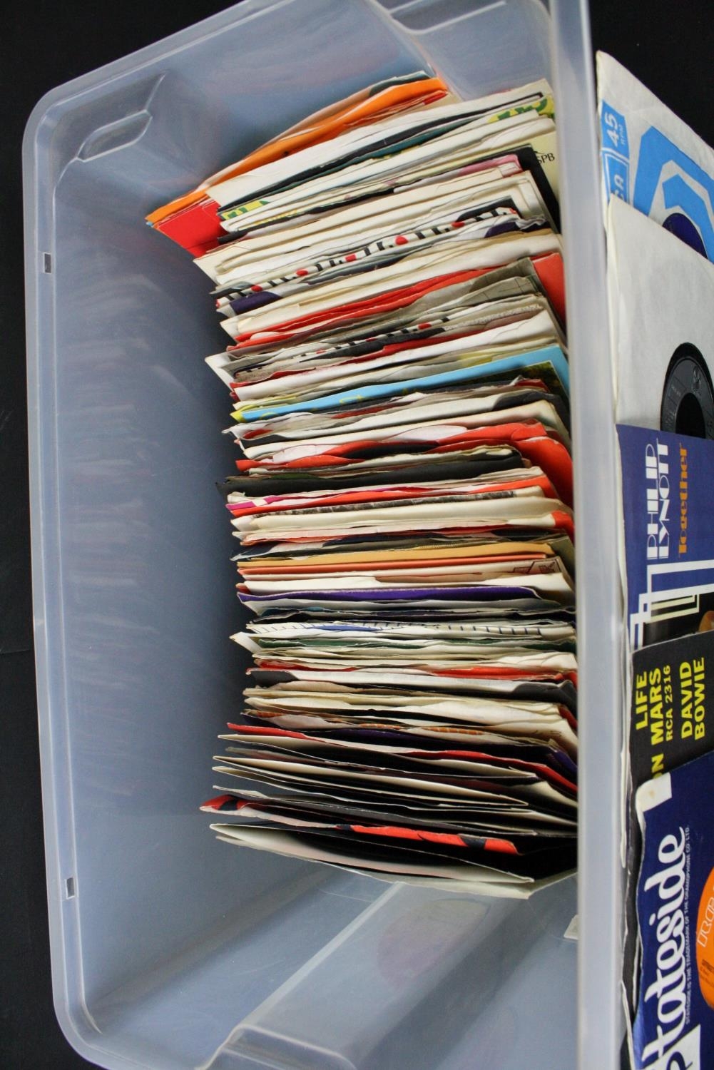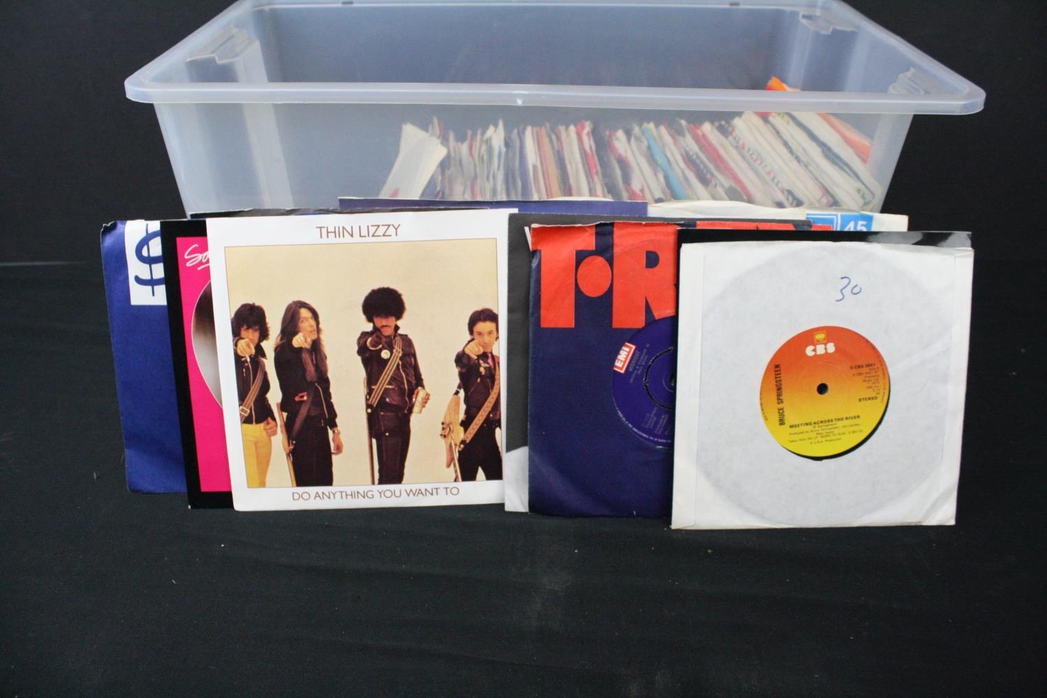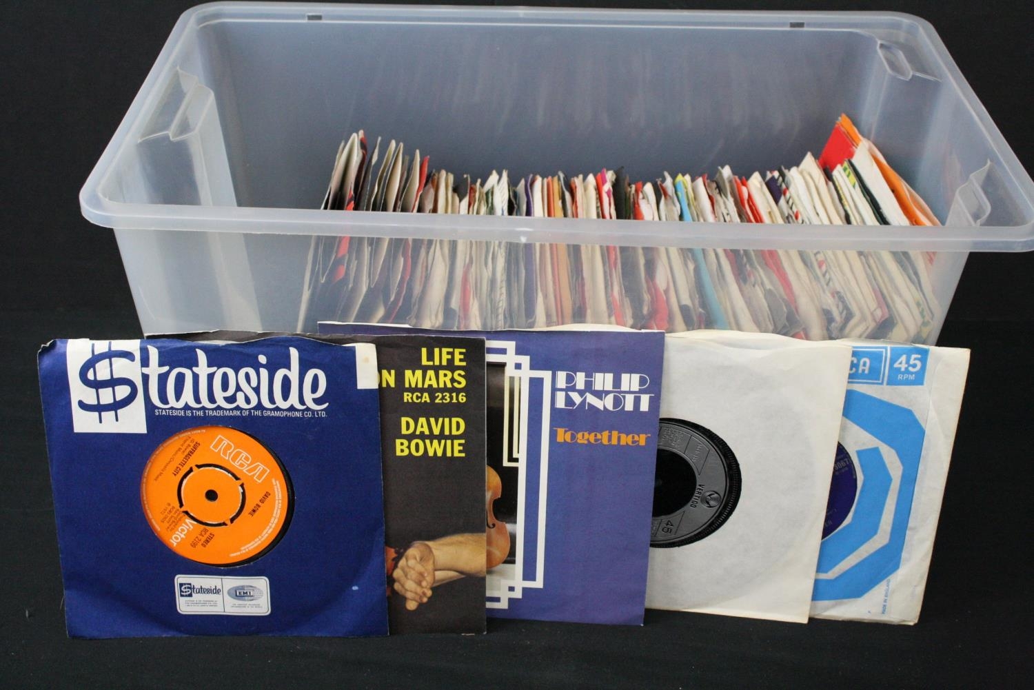 Vinyl - Over 100 mainly Rock 7" single with some pop including Thin Lizzy, Phil Lynott, Mick Jagger, Bruce Springsteen, T-Rex, David Bowie, Van Morrison, Bob Dylan, Black Sabbath, Rolling Stones, The Who, Atomic Rooster, Alice Cooper, Faces, George Harrison, Deep Purple, Mick Ronson and many more. Mainly in company or pic sleeves. At least Vg+ overall