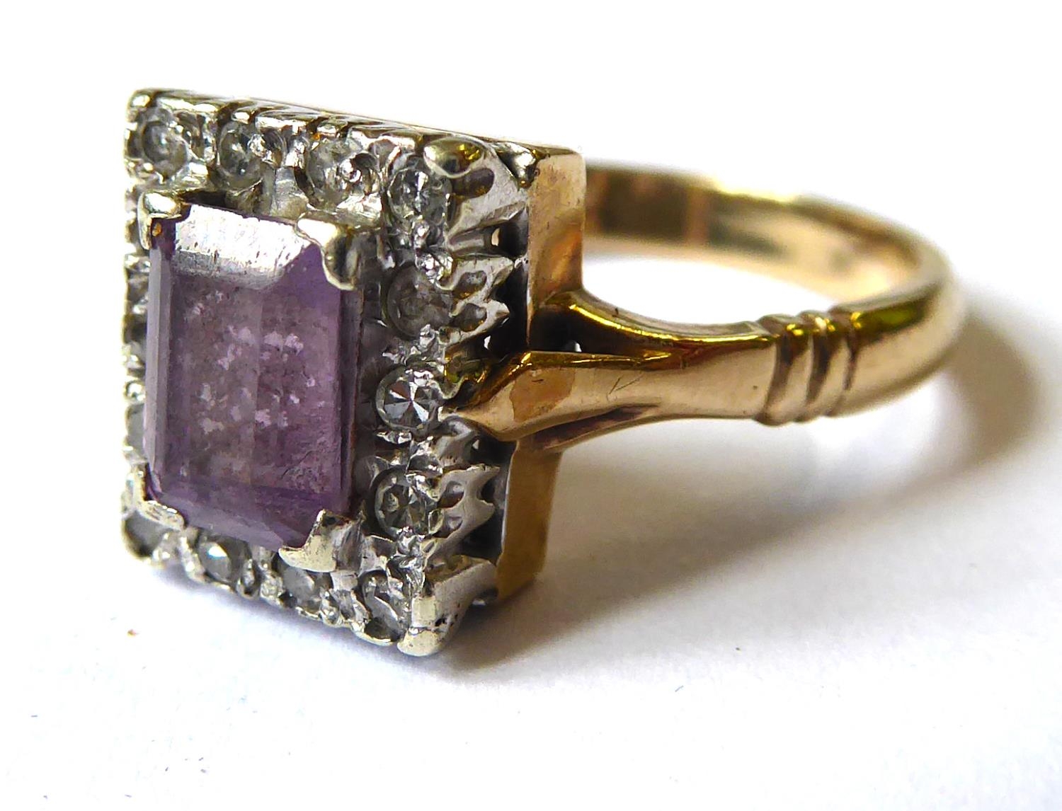 The emerald cut amethyst claw set to a surround of single cut diamonds, on a 9ct yellow gold shank (size L/M).