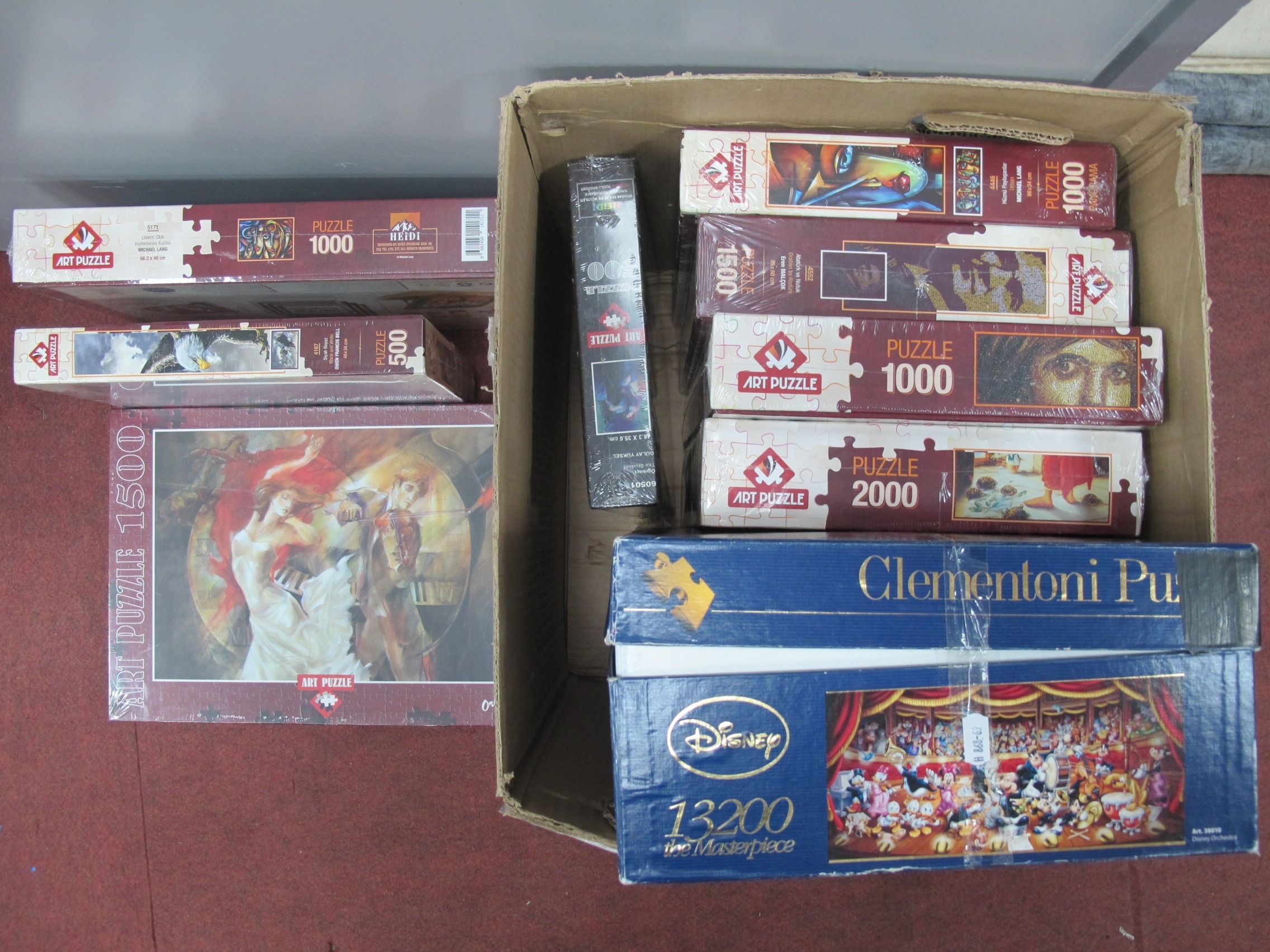 Puzzles, including a boxed Clementoni Disney Orchestra 13,200-piece puzzle and eight boxed Turkish Art Puzzles, all sealed. One box.