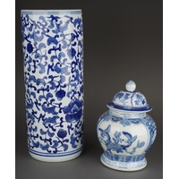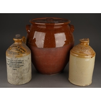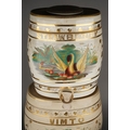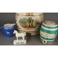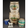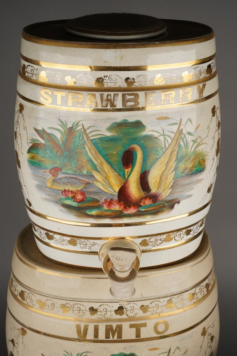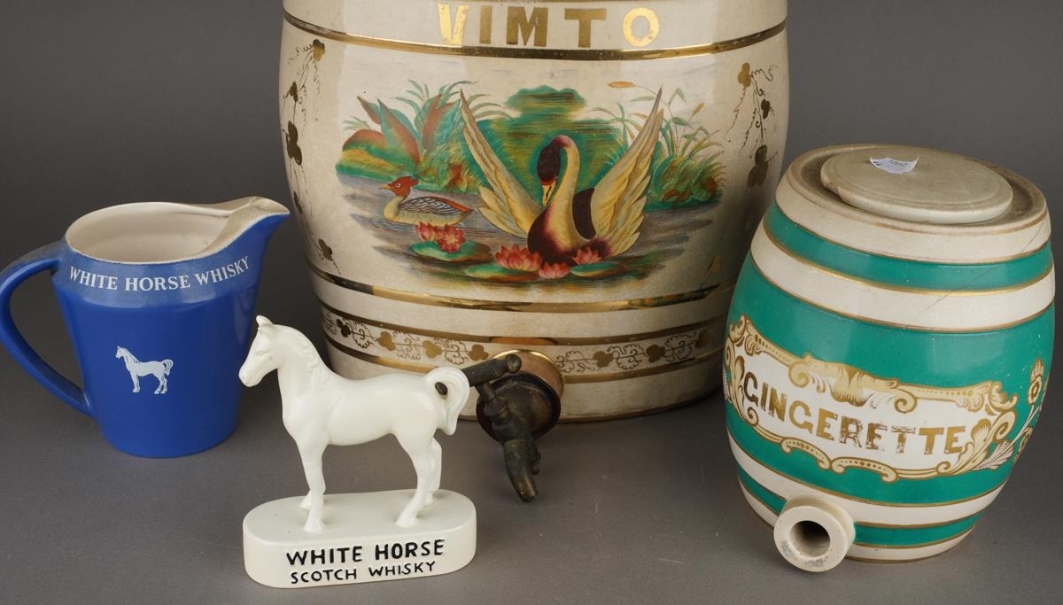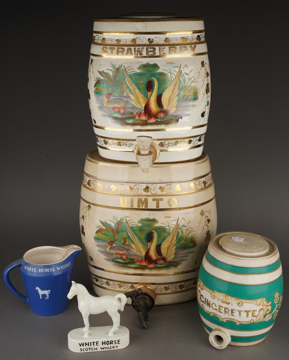Two Victorian stacking Hollinshead & Kirkham barrel shaped drink dispensers, both decorated with a Swan and Duck within gilt hop leaves, one titled VIMTO, the other STRAWBERRY, factory stamp, the larger one 32cm high together with a Staffordshire GINGERETTE barrel shaped green and cream dispenser and a White Horse whiskey jug and white horse bar model [5]