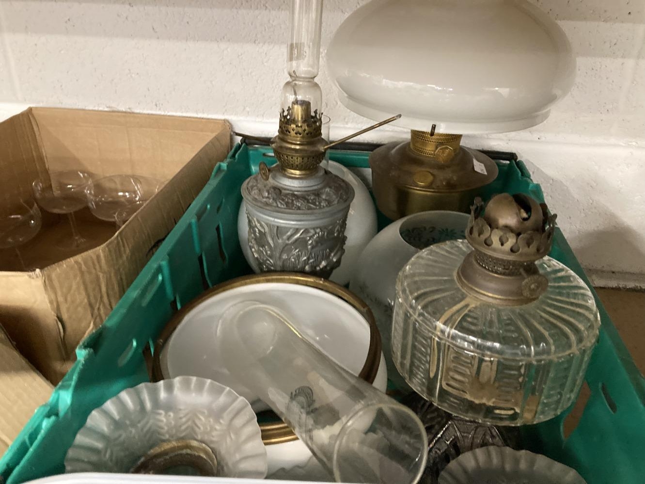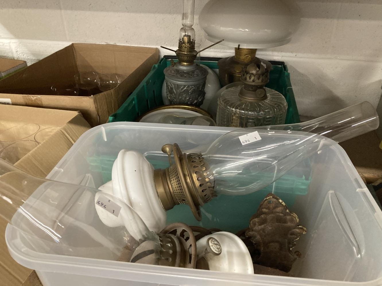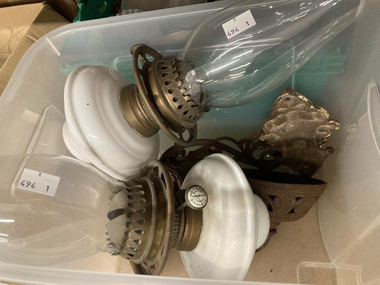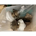 Lighting: Late 19th/early 20th cent. Oil lamps and wall sconces, large Aladdin lamp complete, a Brenner Sowson urn shaped lantern decorated with wild fowl and deer, two Wright & Butler wall hung oil lamps, plus a further lamp reservoir and various shades.