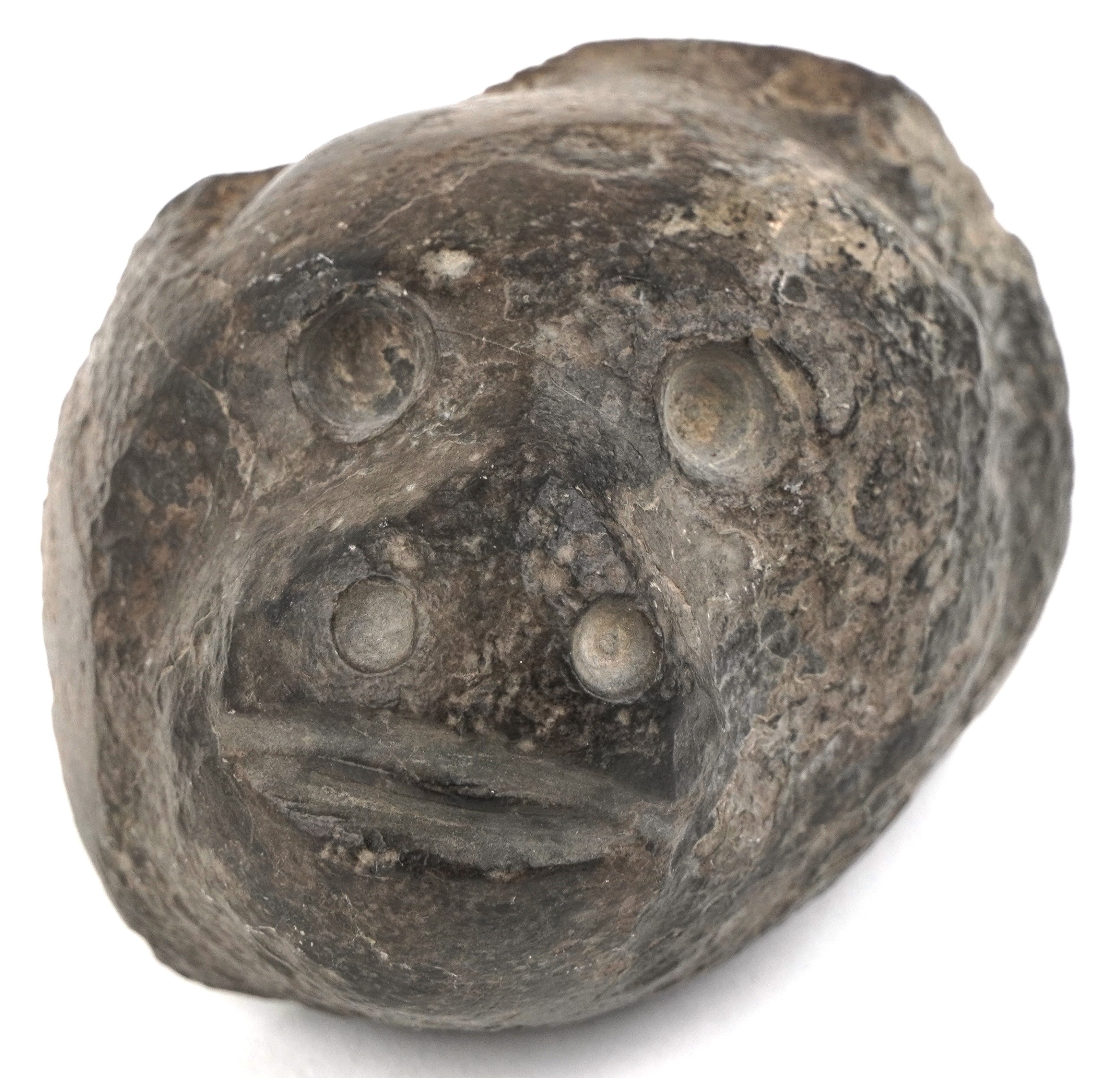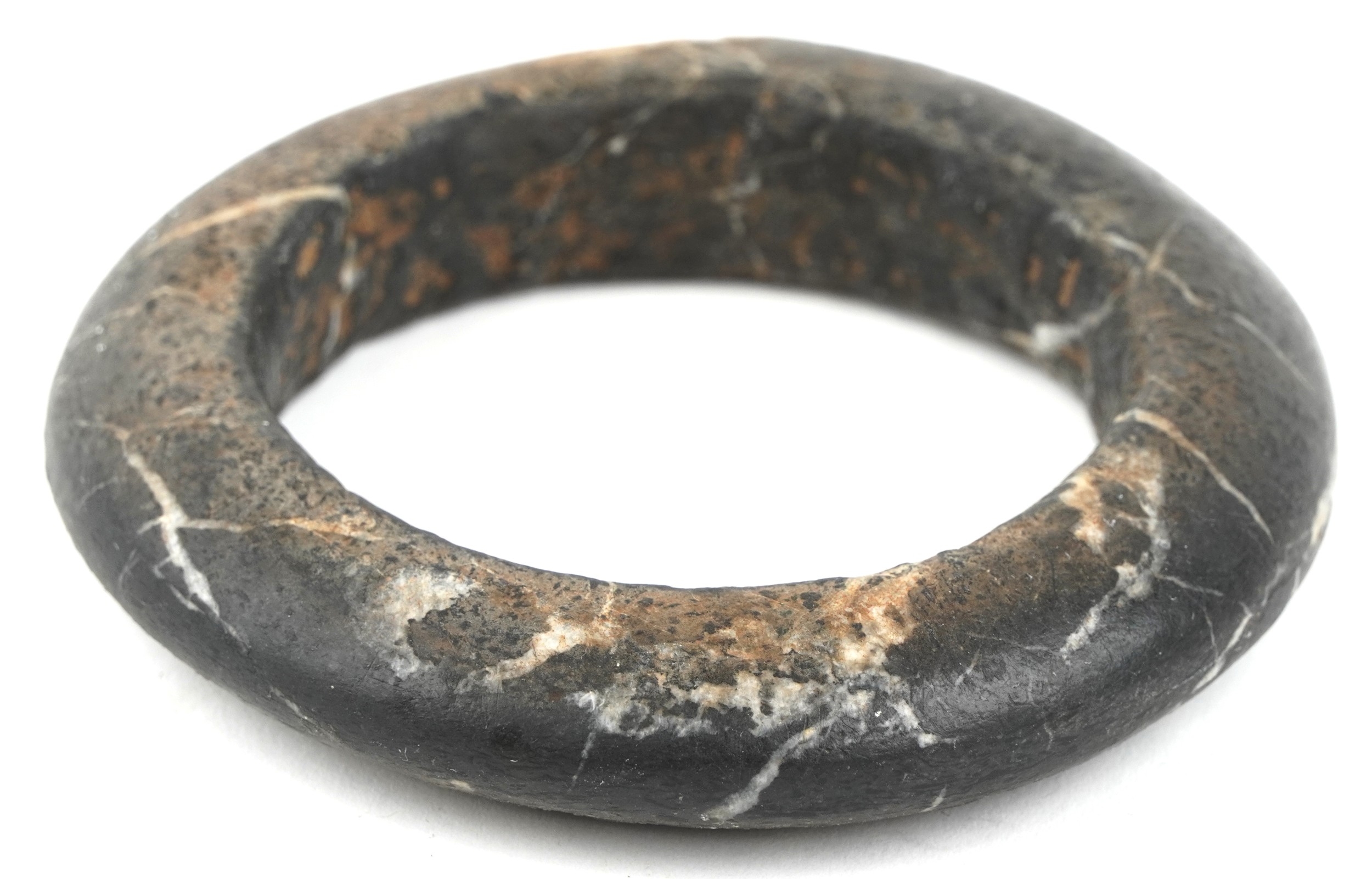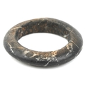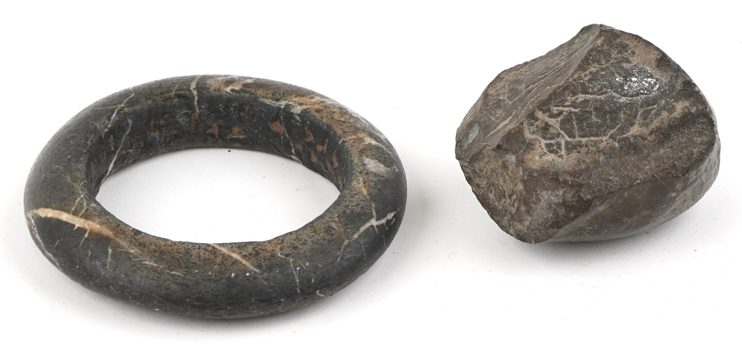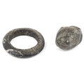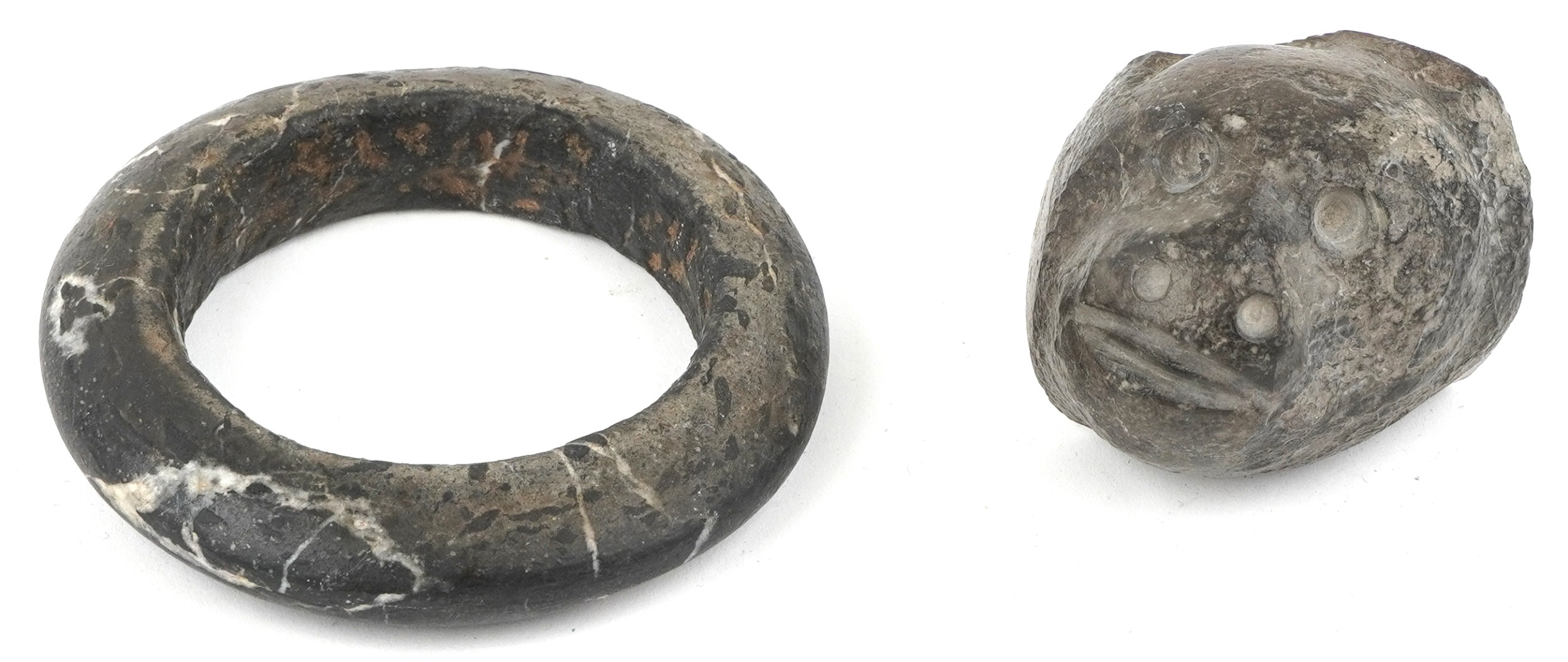 A carved stone bangle, possibly African Dogon tribe, 10cm in diameter together with a stone fragment carved with a monkey mask, possibly North American, 7cm wide.