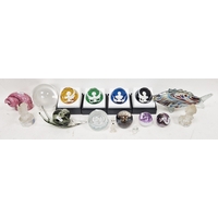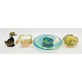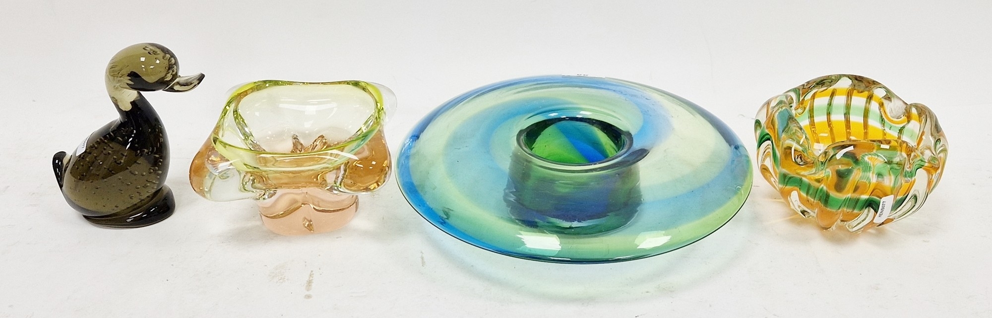 Whitefriars glass 'Dilly Duck' in green colourway with controlled bubbles, 13cm high, a glass bowl by Joseph Hospodka for Chribska in lime and pink colourway, a Japanese Narumi Sanyu art glass bowl/ashtray with green and orange swirl decoration and a 1930's Stevens & Williams Rainbow posy bowl of mushroom form with cylindrical body and wide domed rim decorated with a spiral green and blue line (4)
