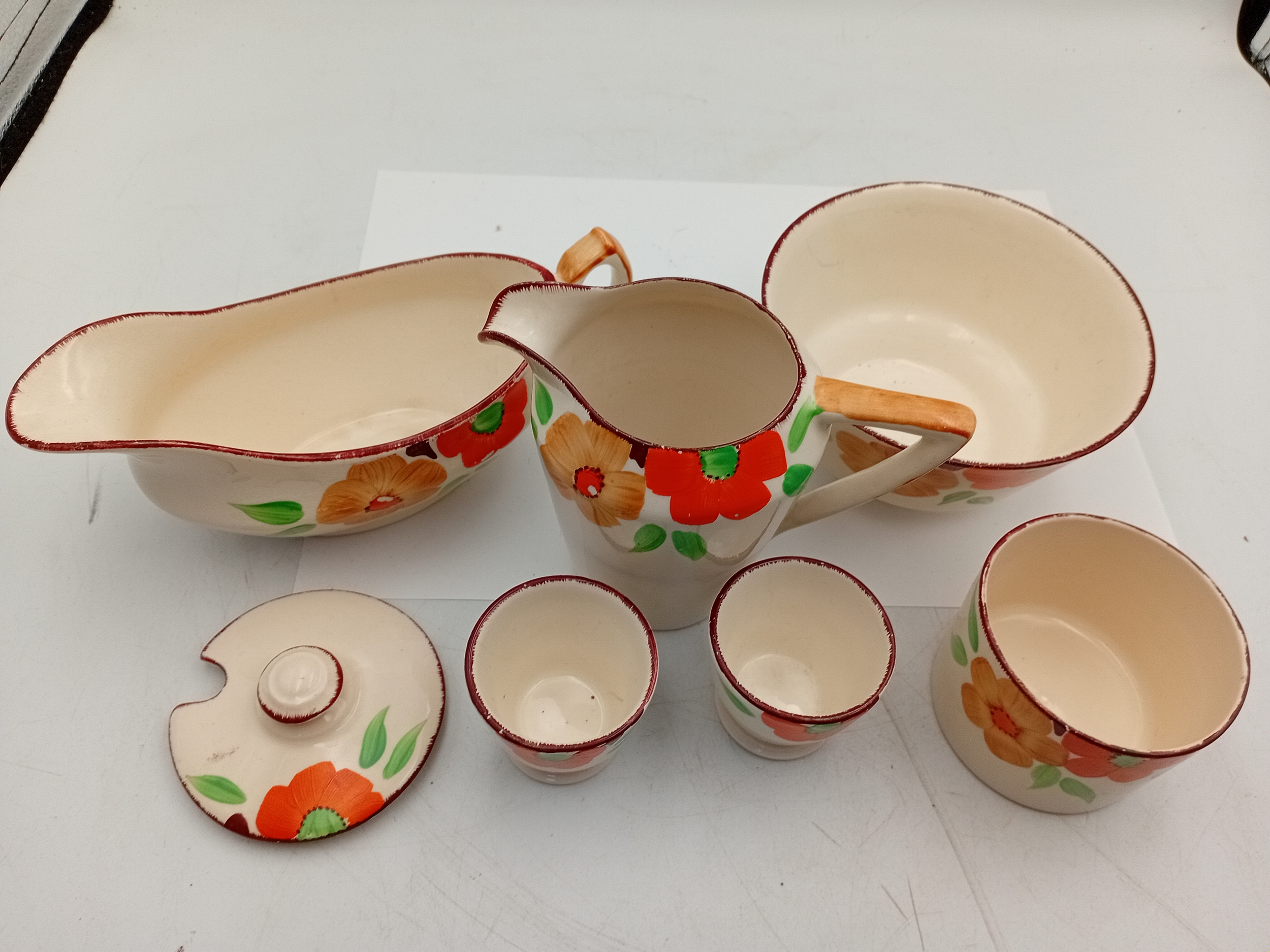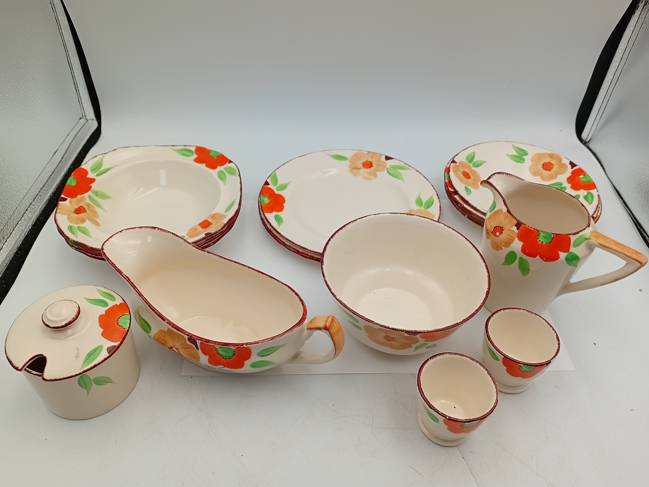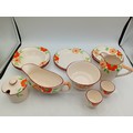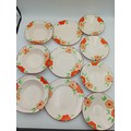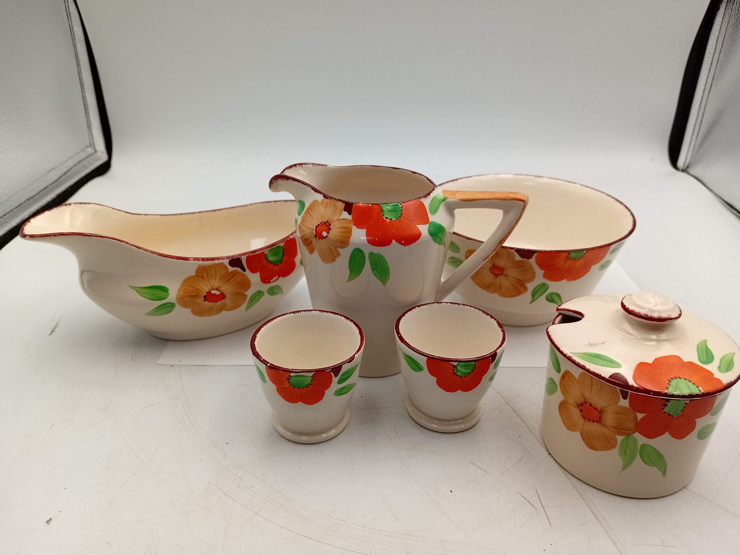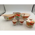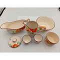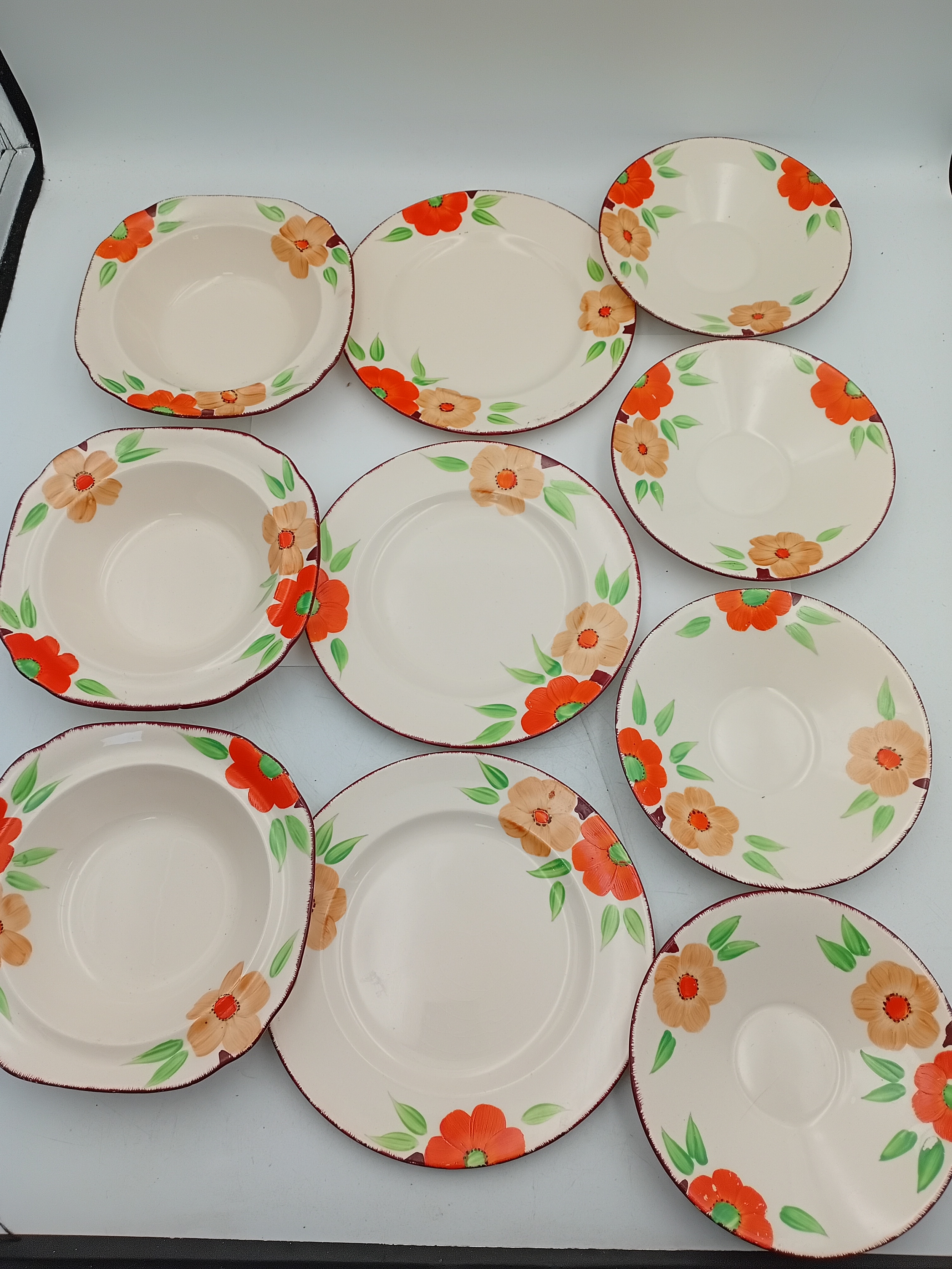 A collection of hand painted art deco style ivory england dinnerware. Featuring plates, bowls, a jug and more.