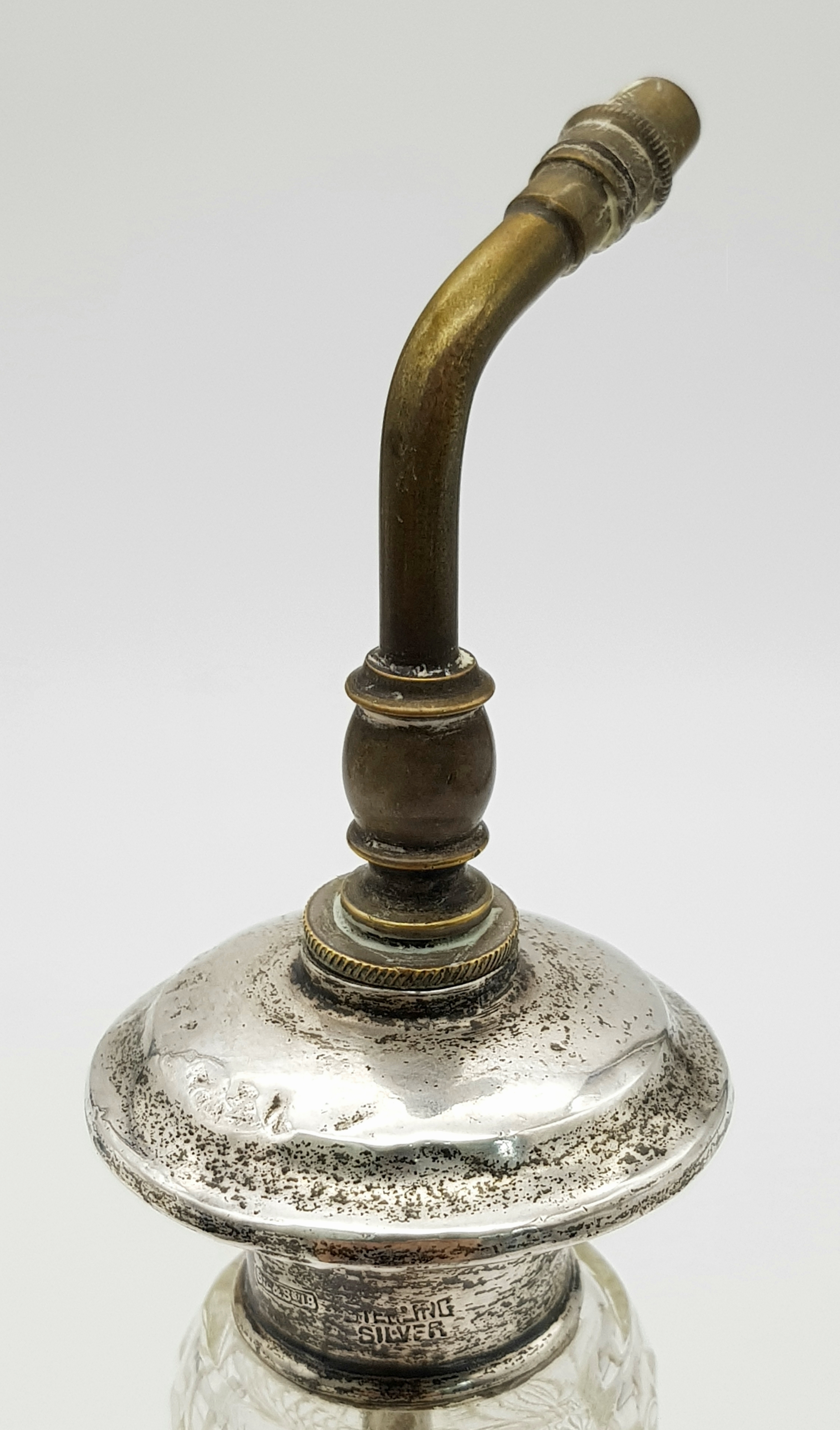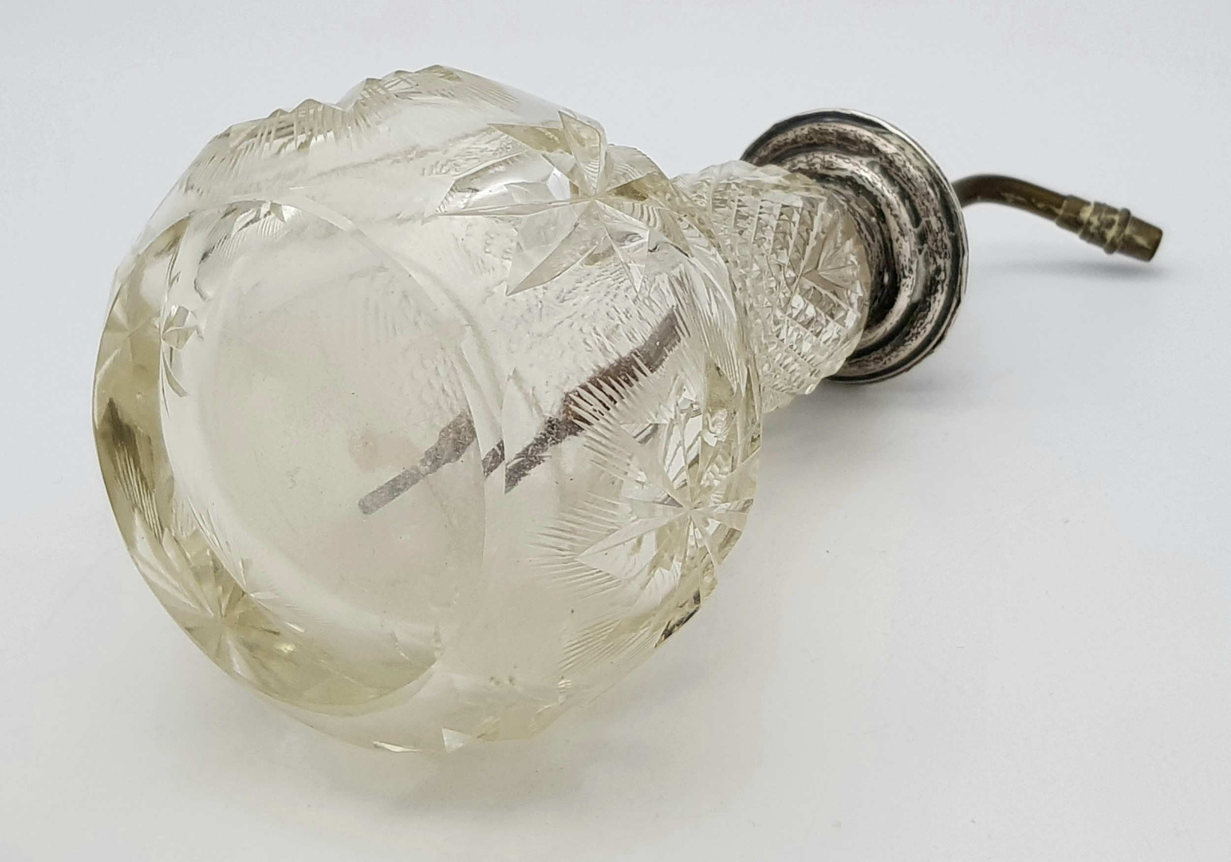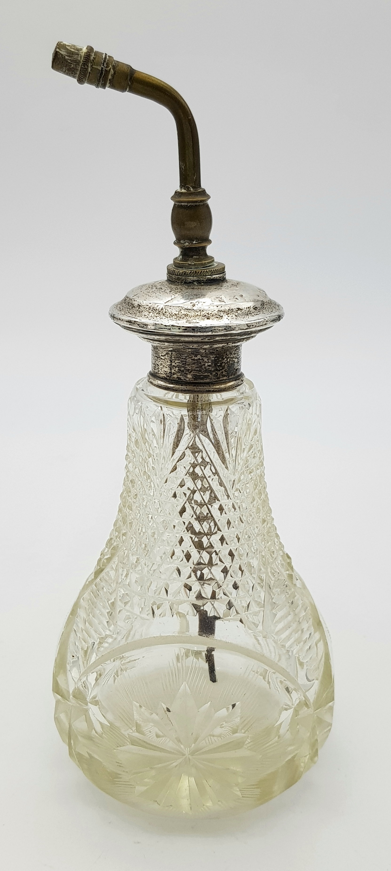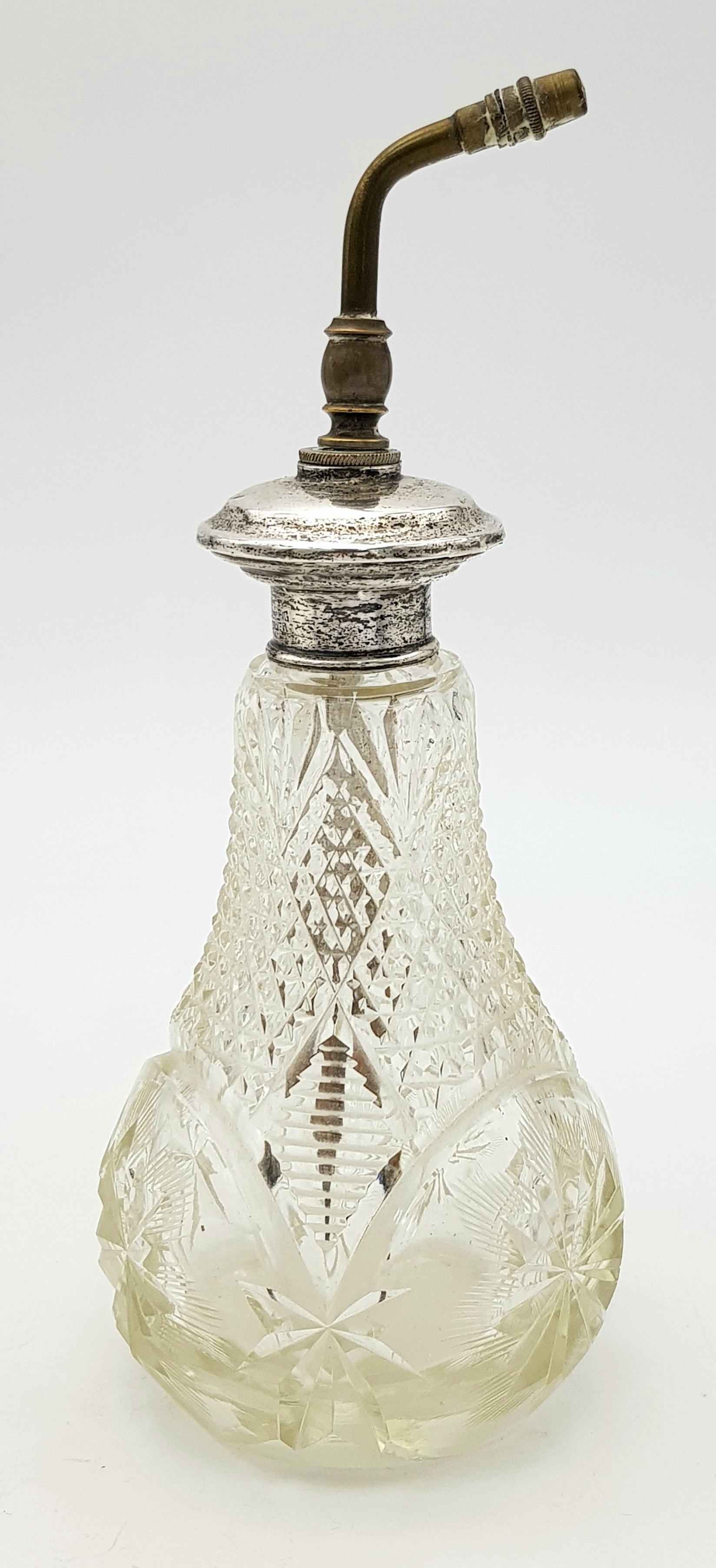 A Vintage Possibly Antique Cut Glass Perfume Atomiser - With Sterling Silver Collar and top. Brass metal spray nozzle.