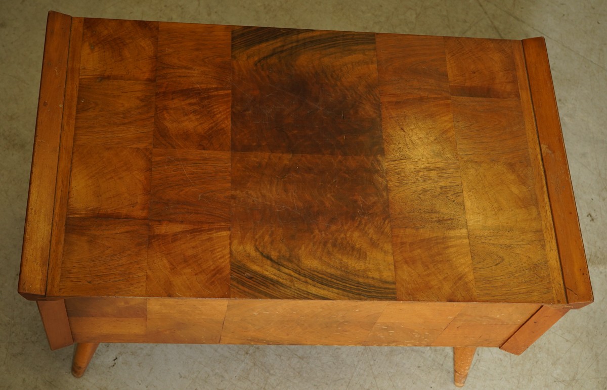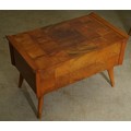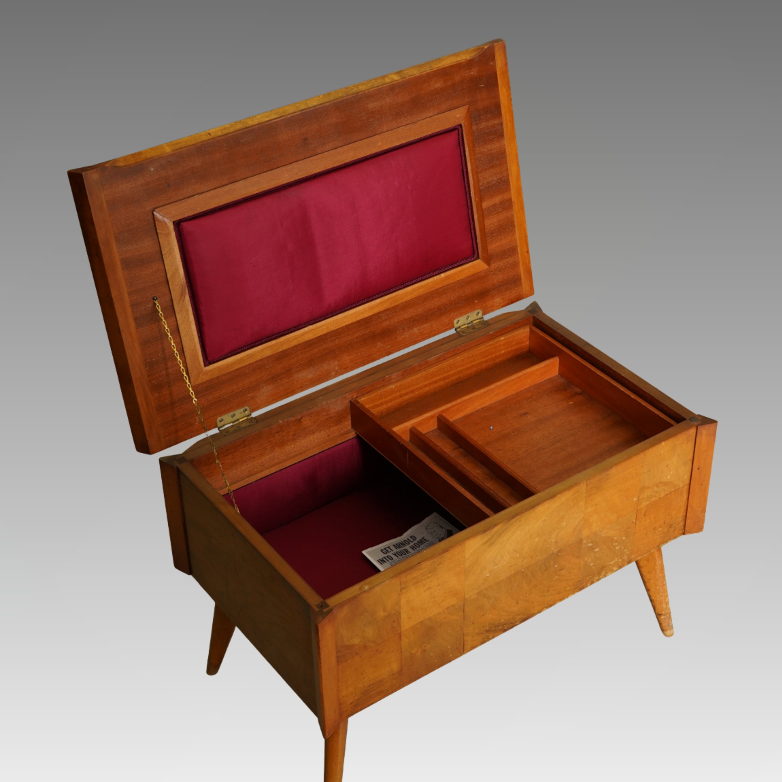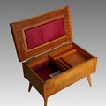 An Arnold "The Chelsea" walnut and teak work table, the rectangular hinged lid with walnut parquetry opening to reveal a padded fabric lid interior, the table interior with removable sliding tray over a fabric lined base, on turned legs, width 65.5cm x depth 38cm x height 42cm approx, comes with a facsimile copy of an advert for the table (1)